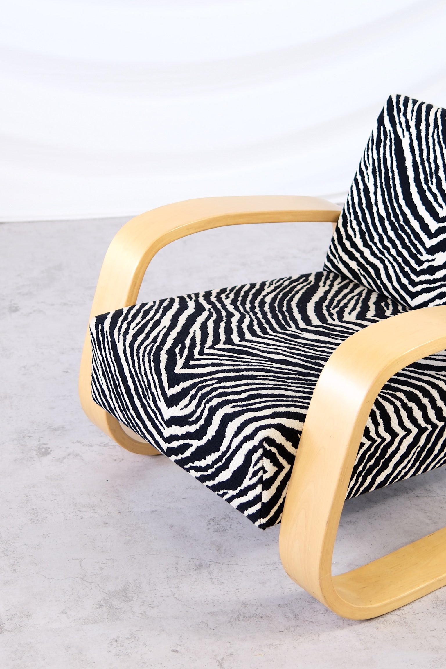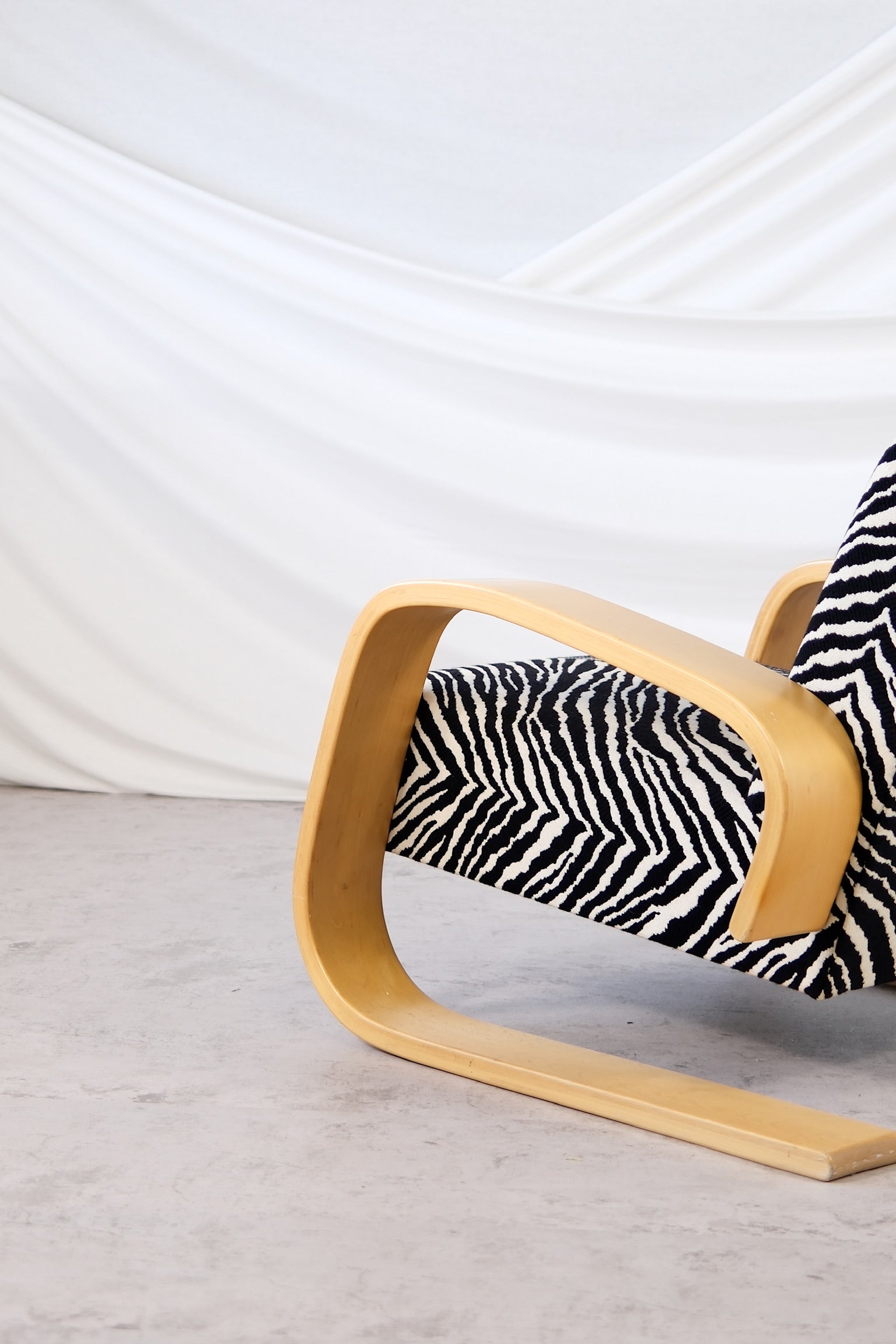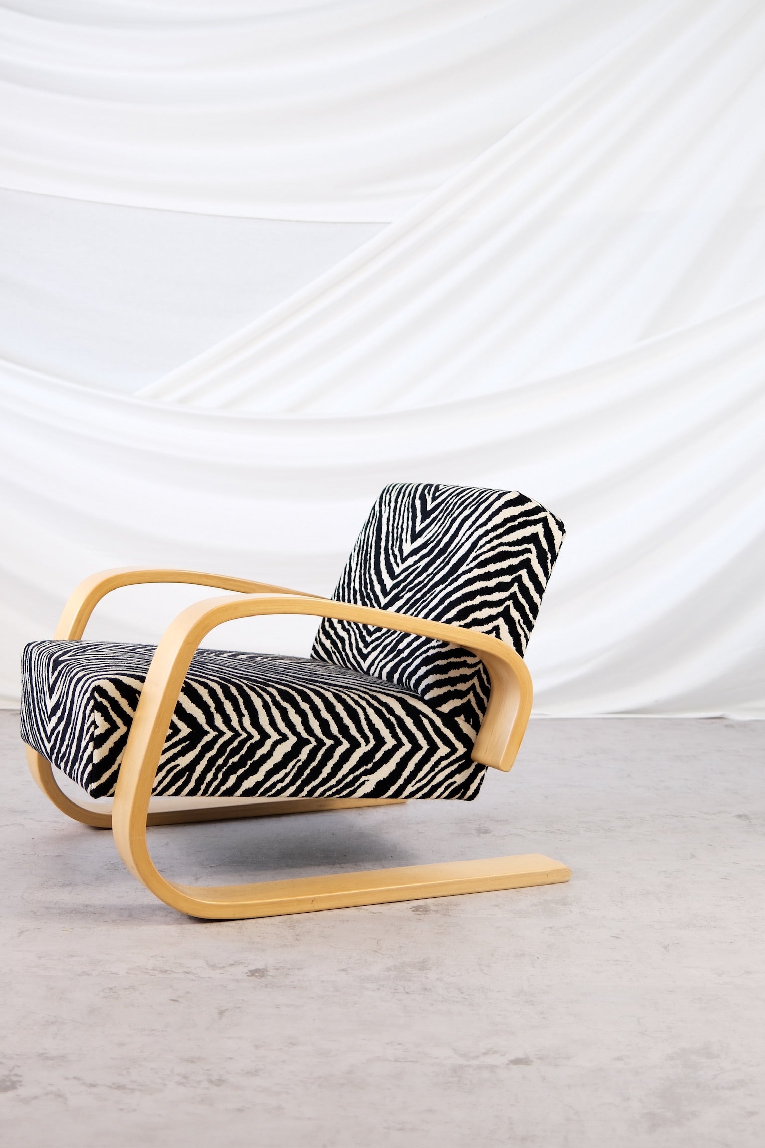 アルヴァ・アアルトの名作、アルテック製400「タンク」チェア。大胆なゼブラ柄のファブリックで張られています。1936年にデザインされた400は、アアルトを代表するラウンジチェアの一つです。低く幅広のフレームと、力強いバーチ材のアームがベースへとカーブを描いています。ゼブラ柄の張地は、時代を超越した遊び心とエッジを効かせながらも、エレガントなデザインを演出します。どんなインテリアにも映える、真のステートメントピースです。