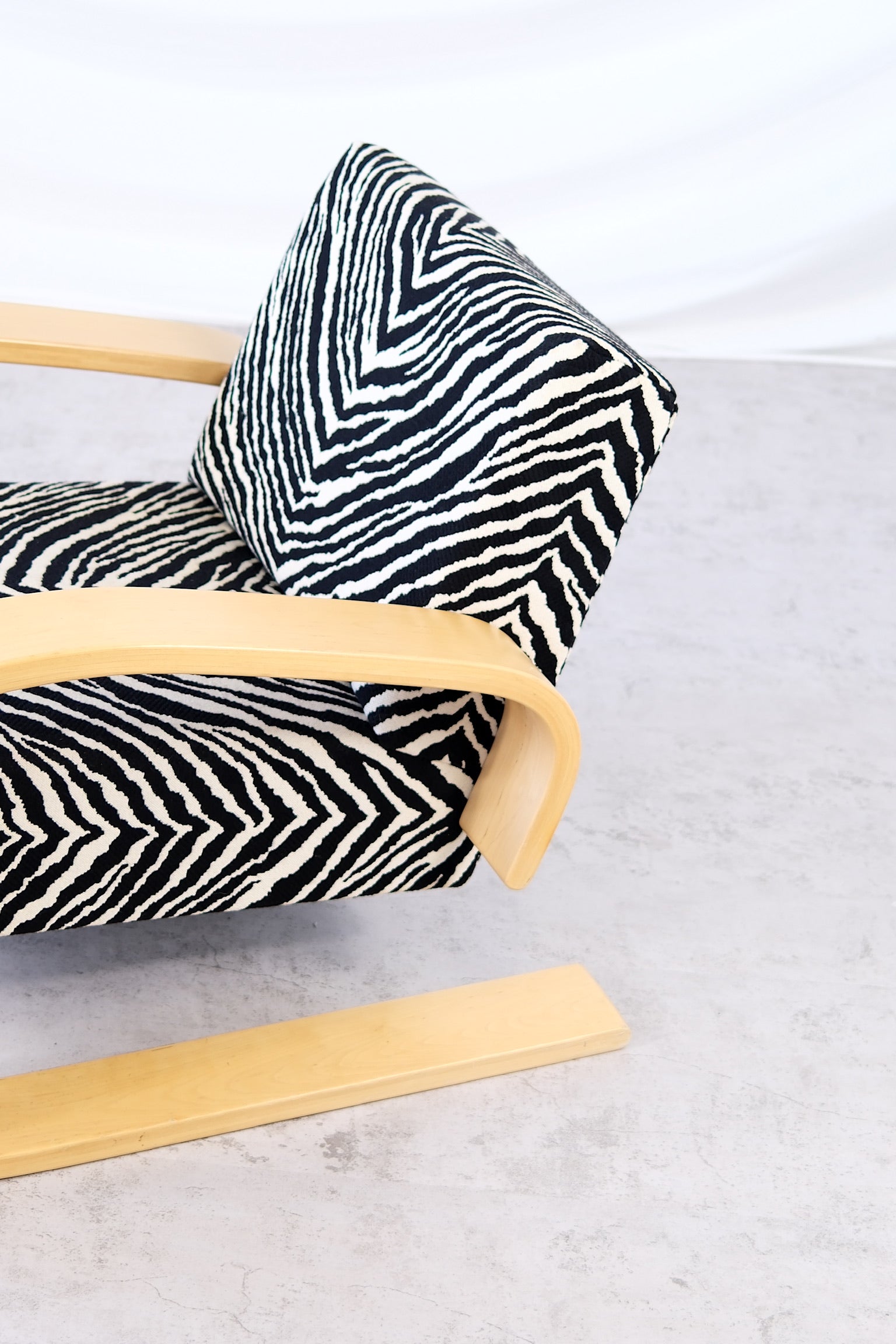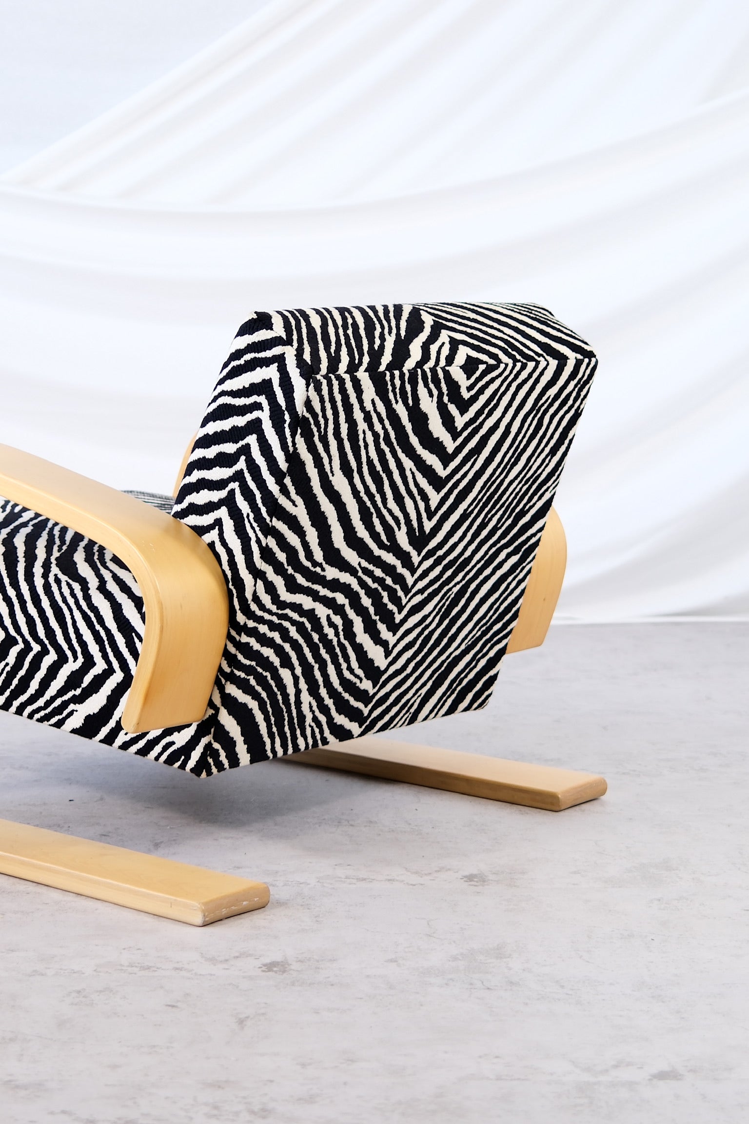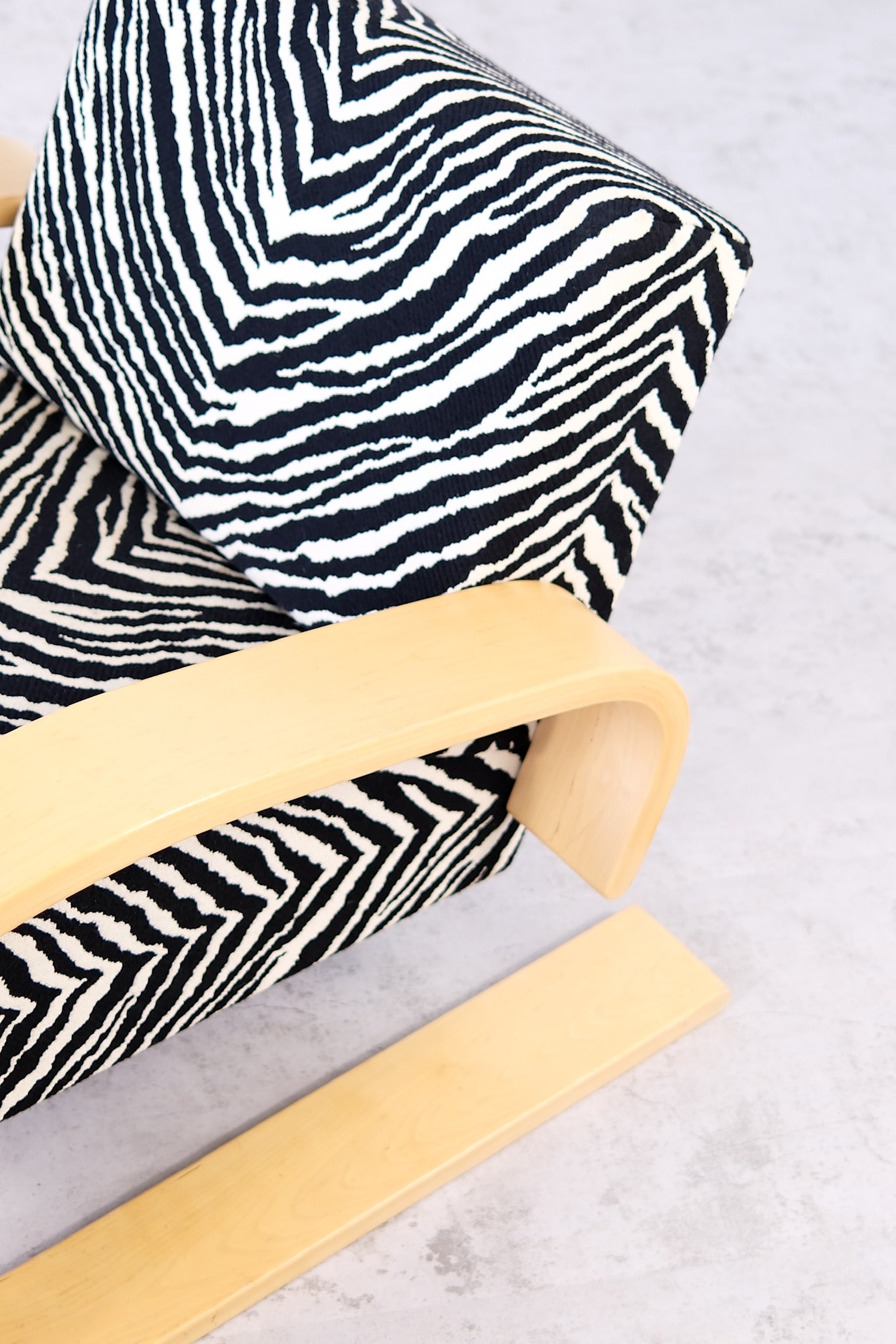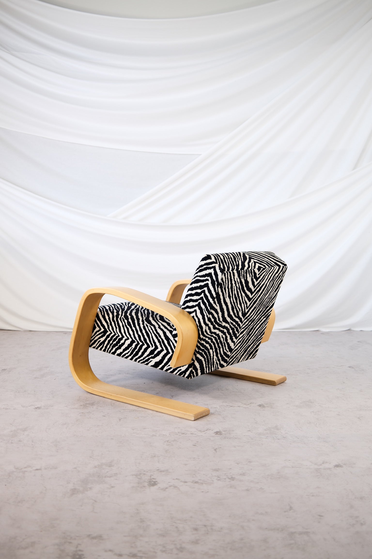 アルヴァ・アアルトの名作、アルテック製400「タンク」チェア。大胆なゼブラ柄のファブリックで張られています。1936年にデザインされた400は、アアルトを代表するラウンジチェアの一つです。低く幅広のフレームと、力強いバーチ材のアームがベースへとカーブを描いています。ゼブラ柄の張地は、時代を超越した遊び心とエッジを効かせながらも、エレガントなデザインを演出します。どんなインテリアにも映える、真のステートメントピースです。