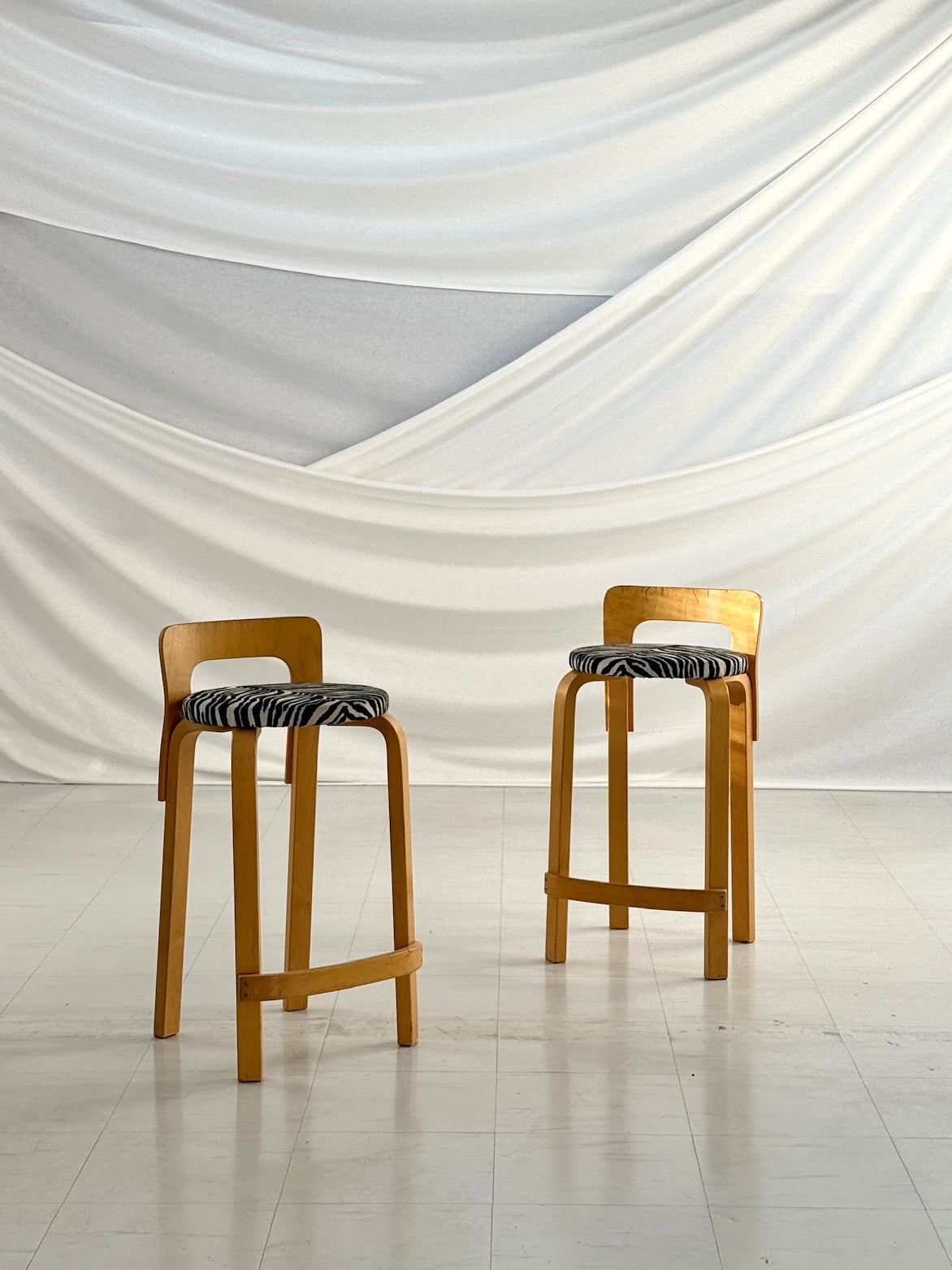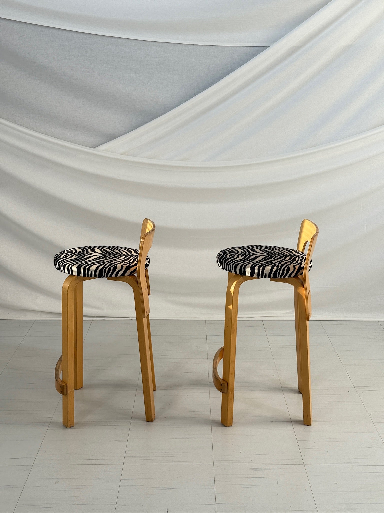フィンランドの建築家アルヴァ・アアルトが1930年代にデザインした「K65」ハイスツールは、時代を超えたスカンジナビアデザインの象徴です。アアルトの特徴である曲げ樺材の脚と低くカーブした背もたれが特徴的なこのペアは、特徴的なゼブラ柄の張地と相まって、機能的なフォルムに遊び心とクラシックな雰囲気を添えています。