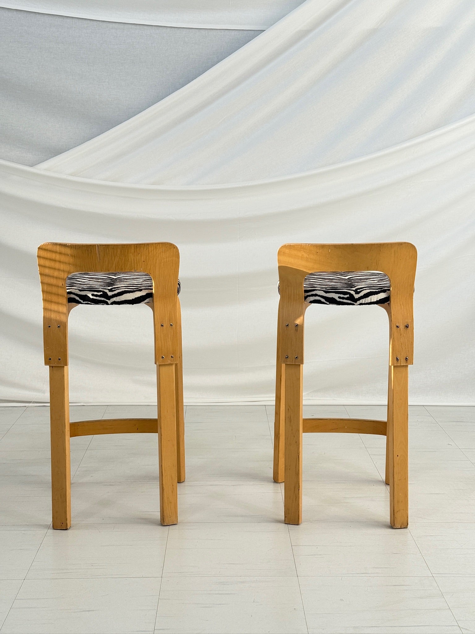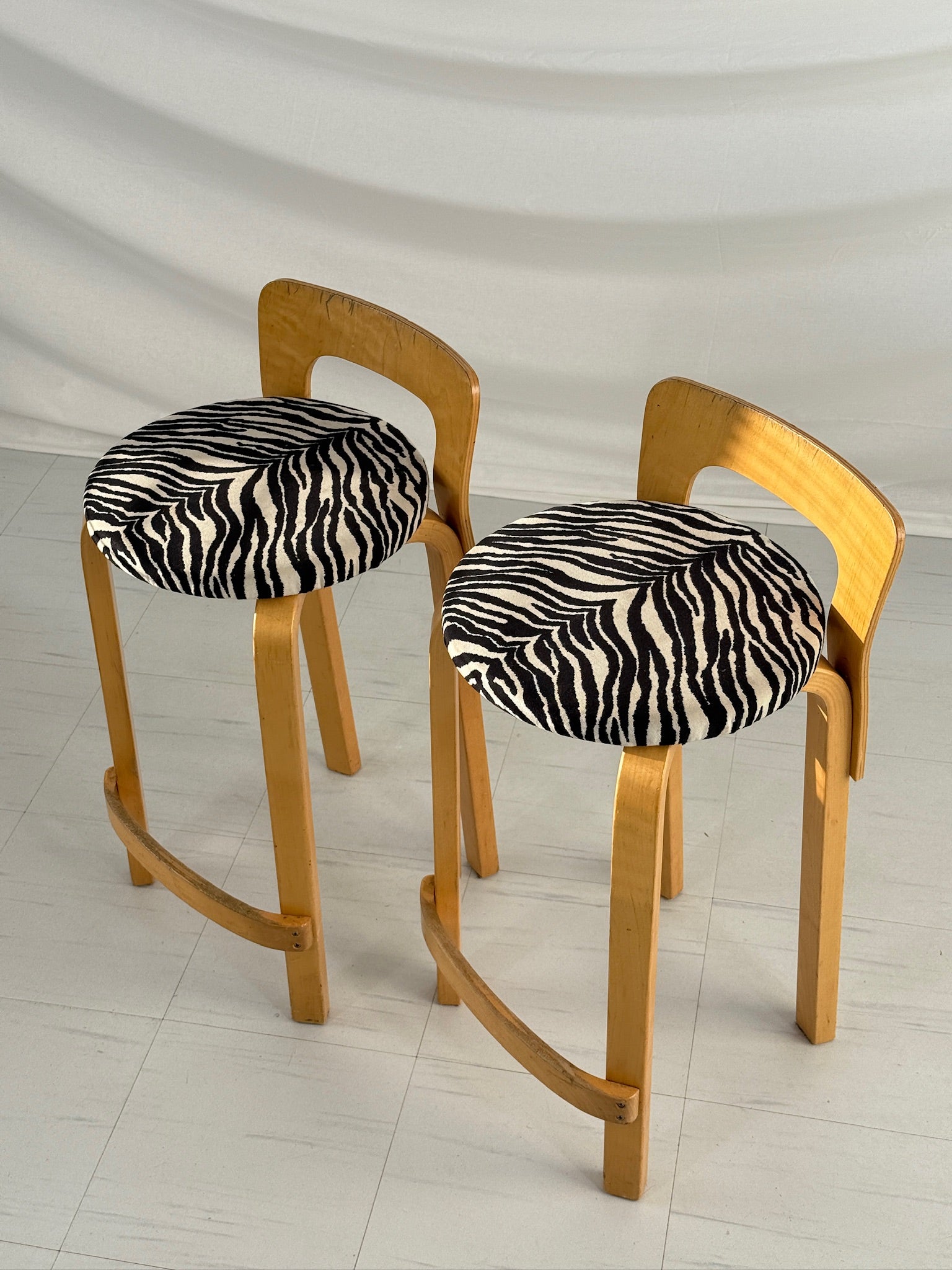 これらのスツールは良好なヴィンテージコンディションです。バーチ材のフレームには経年によるわずかな摩耗が見られますが、ゼブラ柄の張地は穏やかな古色を帯び、良好な状態を保っています。