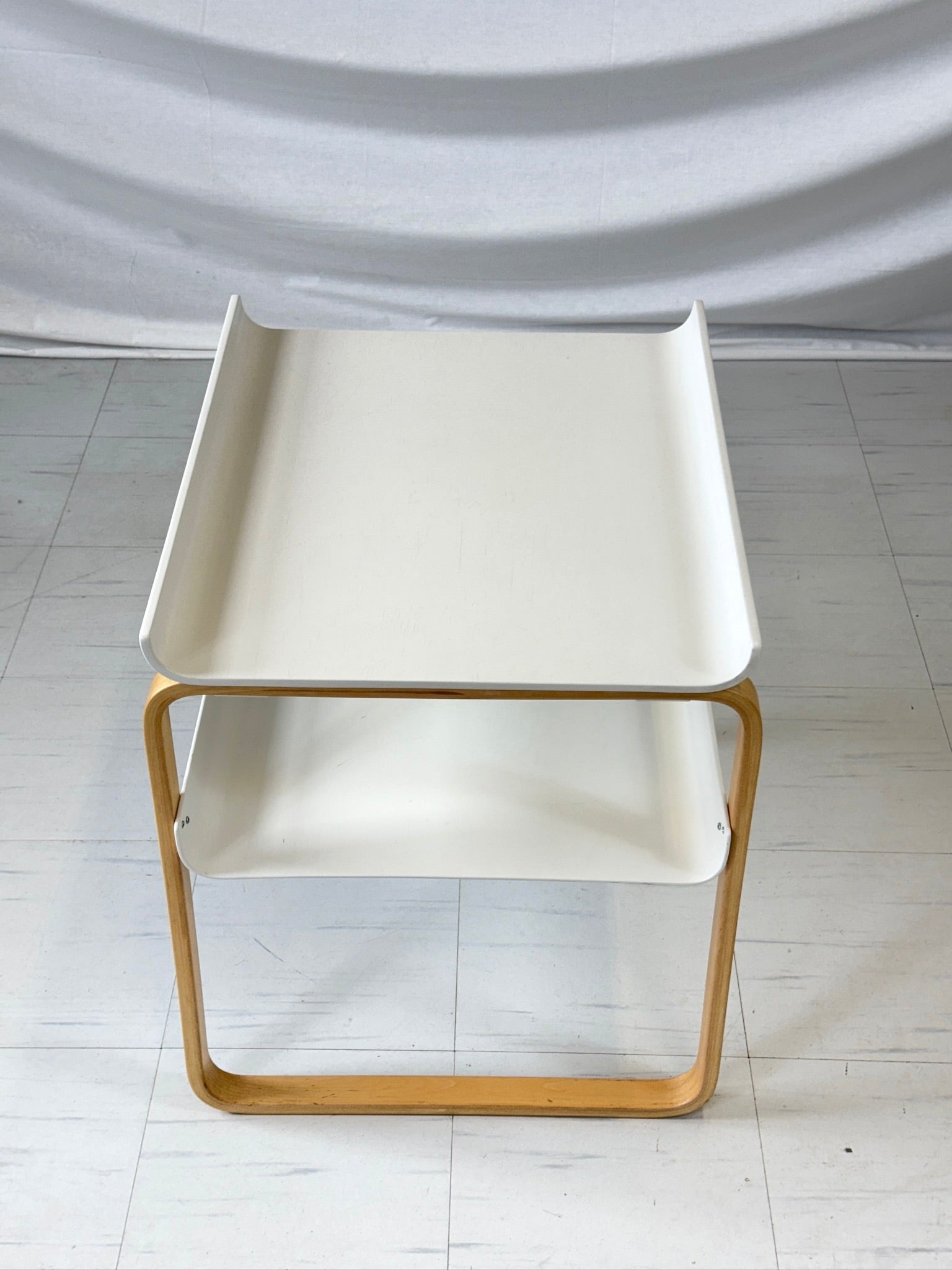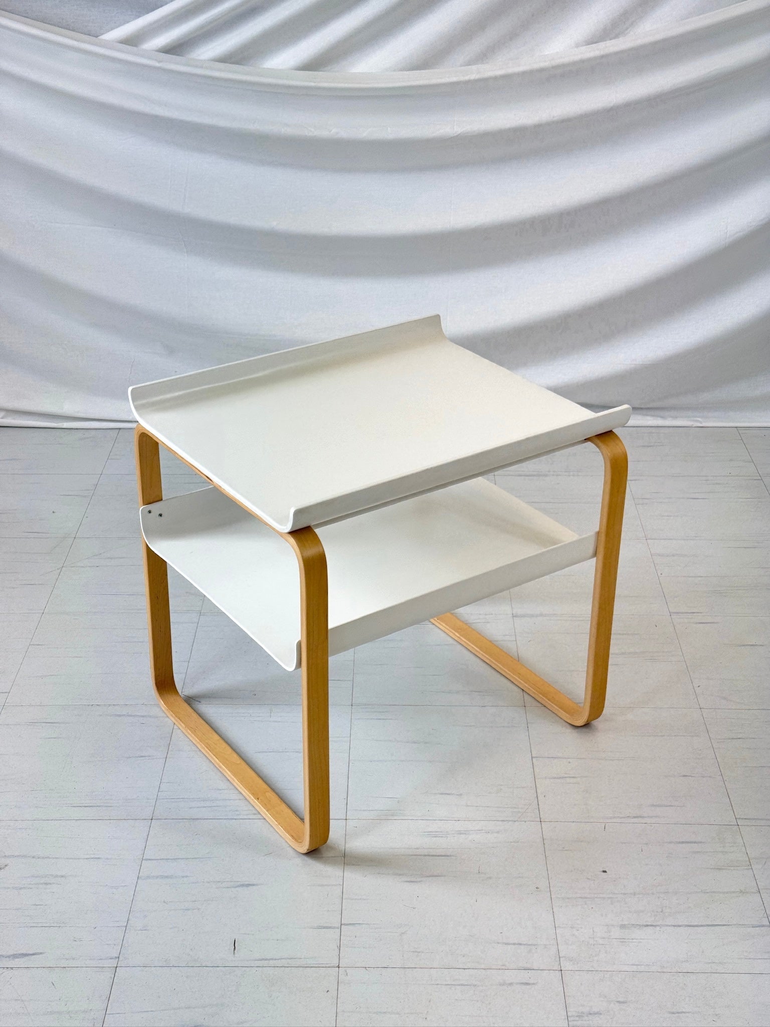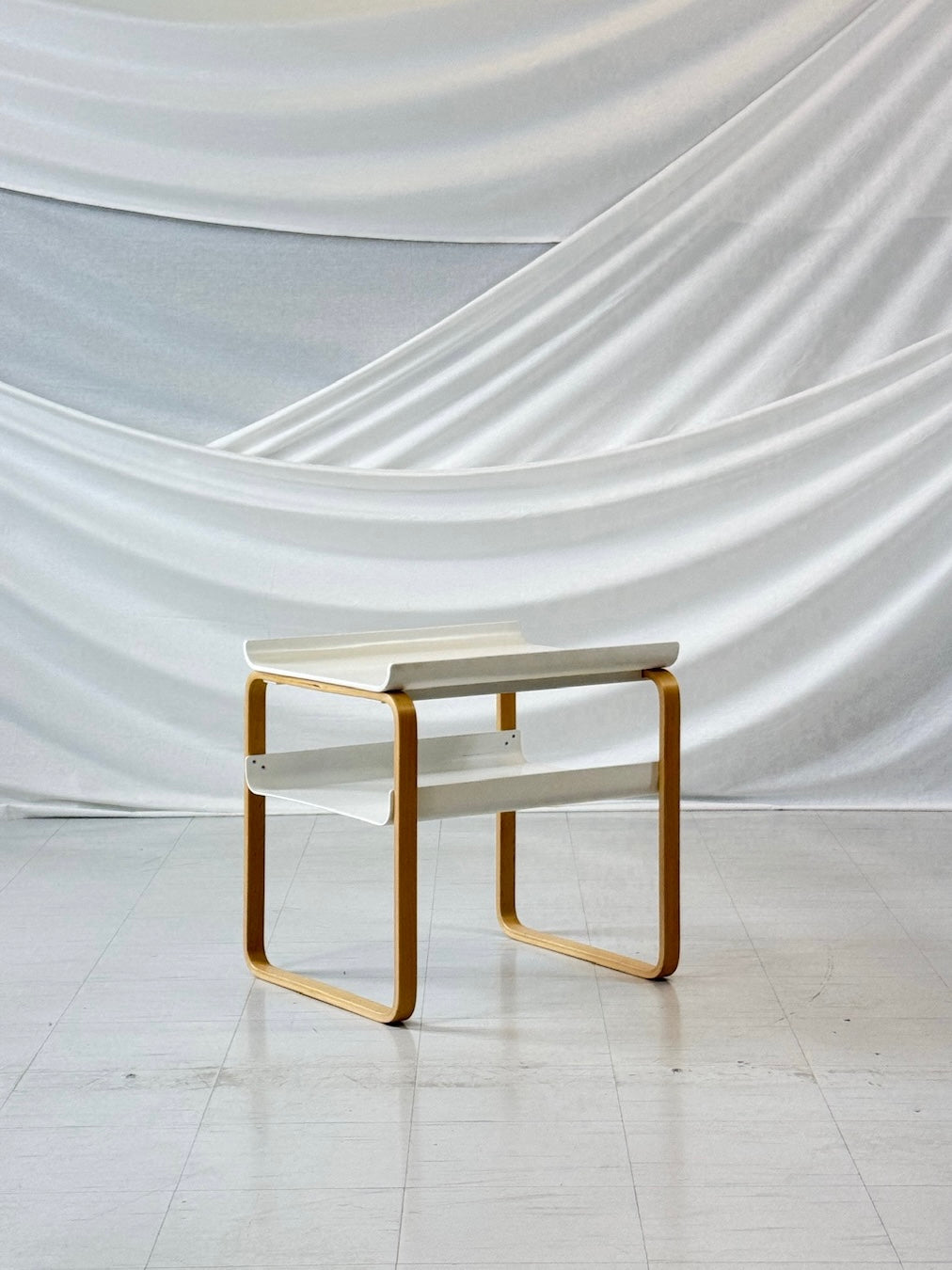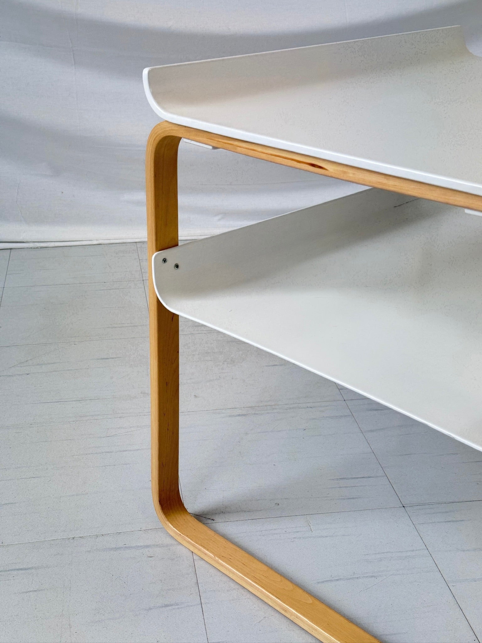 フィンランドの建築家アルヴァ・アアルトが1930年代にデザインした「Kehäpöytä 915」は、アアルトの曲げ木技術の粋を体現した象徴的なサイドテーブルです。円形のバーチ合板の天板を、優美な曲線を描くバーチ材積層脚が支え、リング状の下段棚板を備えたこのテーブルは、アアルト作品の特徴である有機的なモダニズムを体現しています。