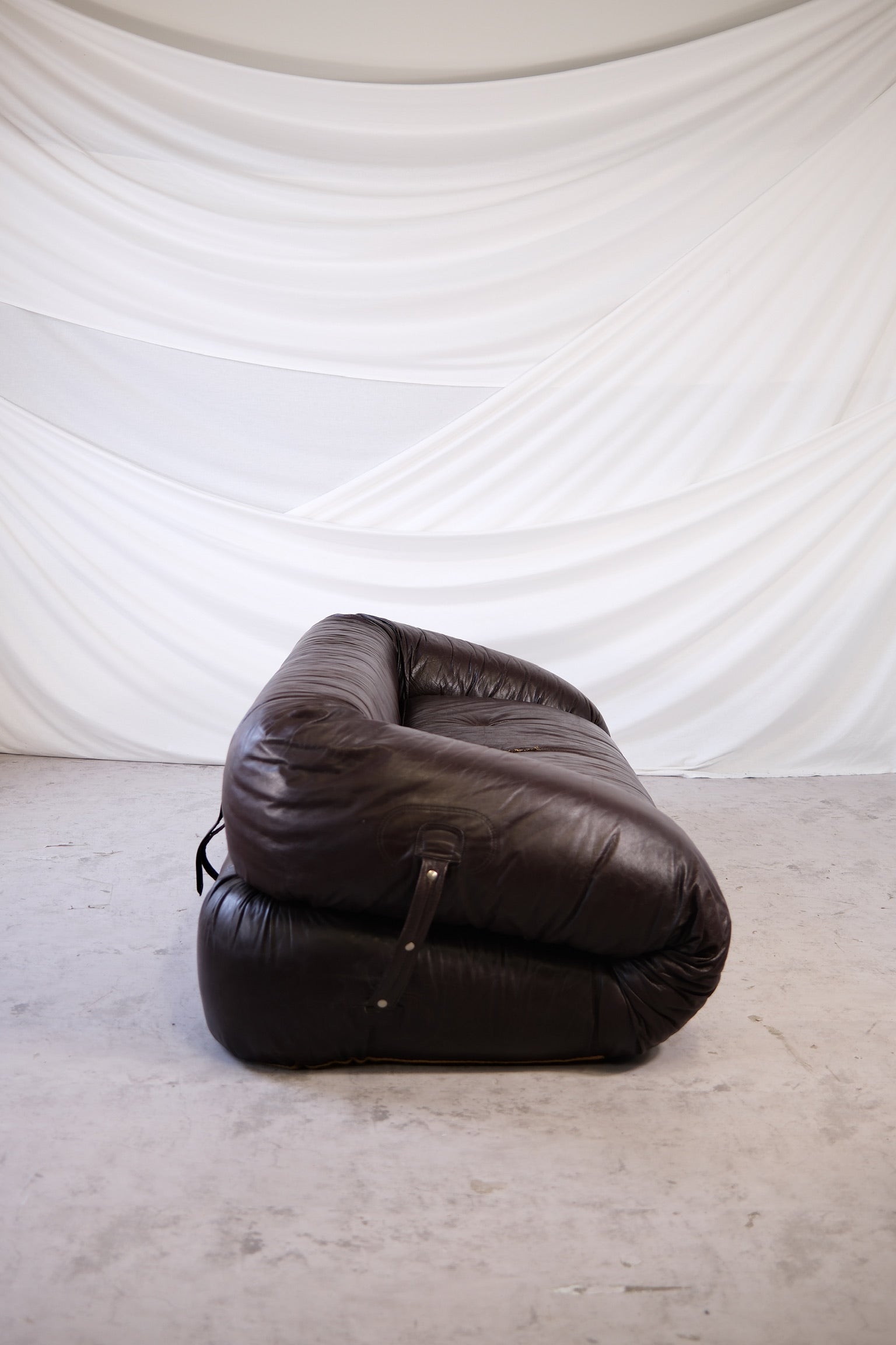 With a simple fold-out mechanism, the Anfibio transforms from a sculptural lounge sofa into a full-size bed. Every detail, from the stitched leather straps to the generous, organic proportions, reflects the playful yet functional spirit of 1970s Italian design.