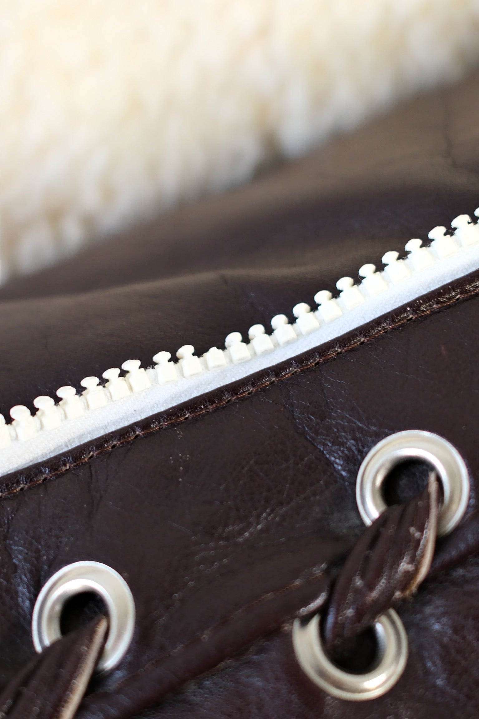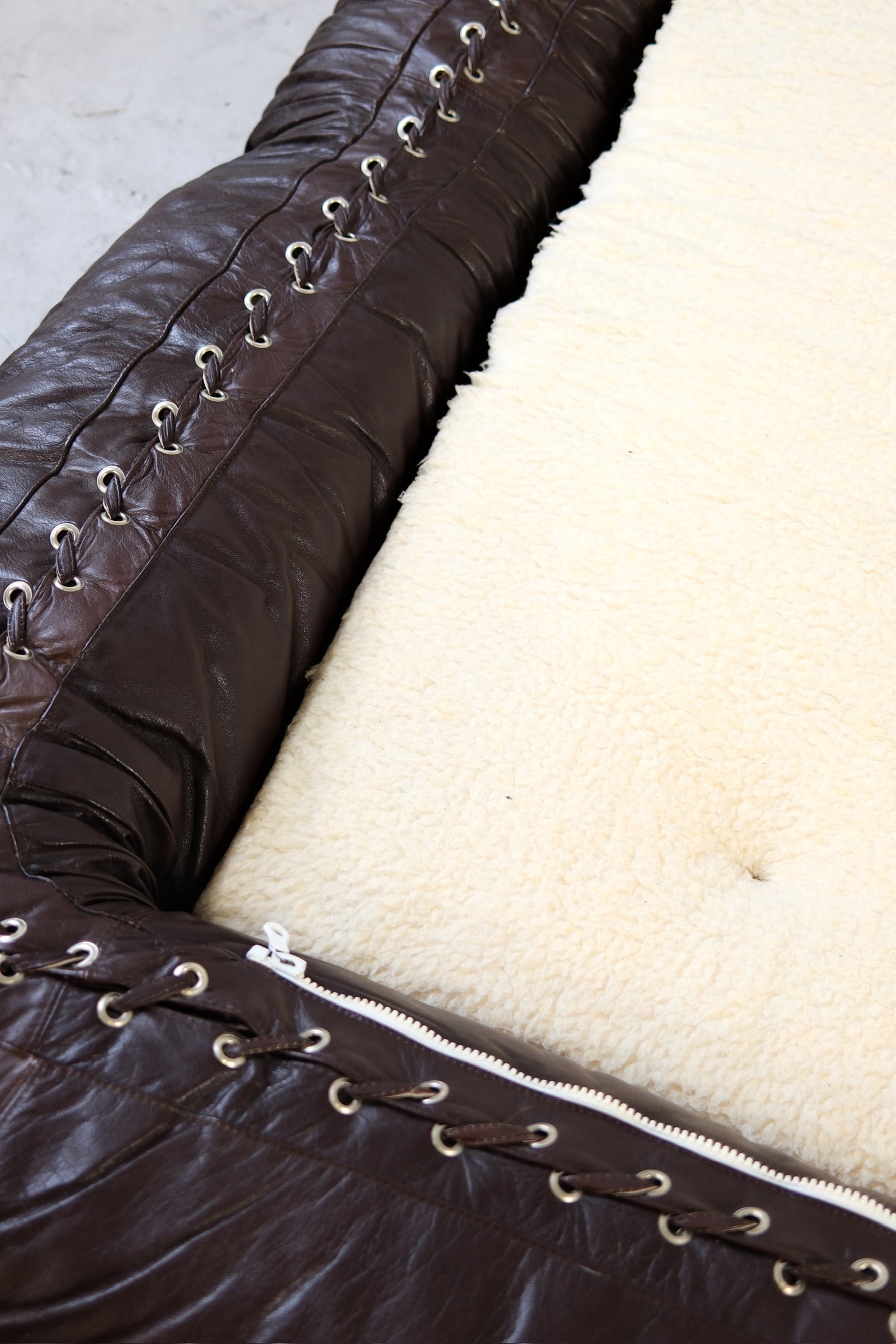 Designed by Alessandro Becchi in the early 1970s, the Anfibio sofa quickly became one of the most iconic pieces of Italian radical design. This rare version features beautifully patinated dark brown leather on the outside and soft, original sheepskin on the inside.