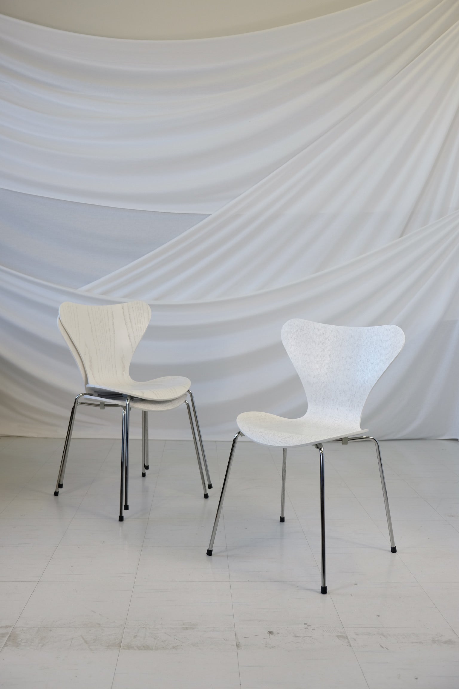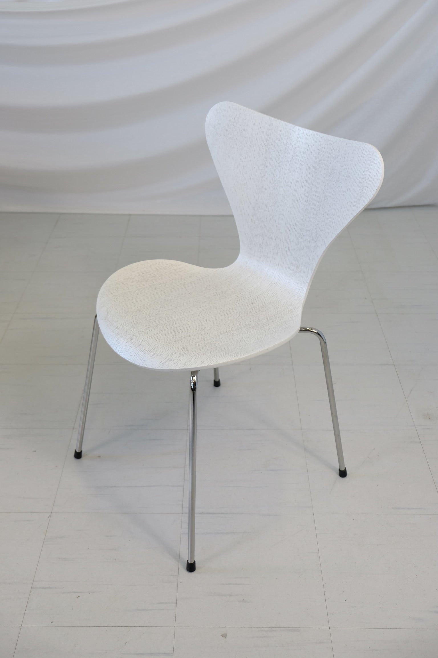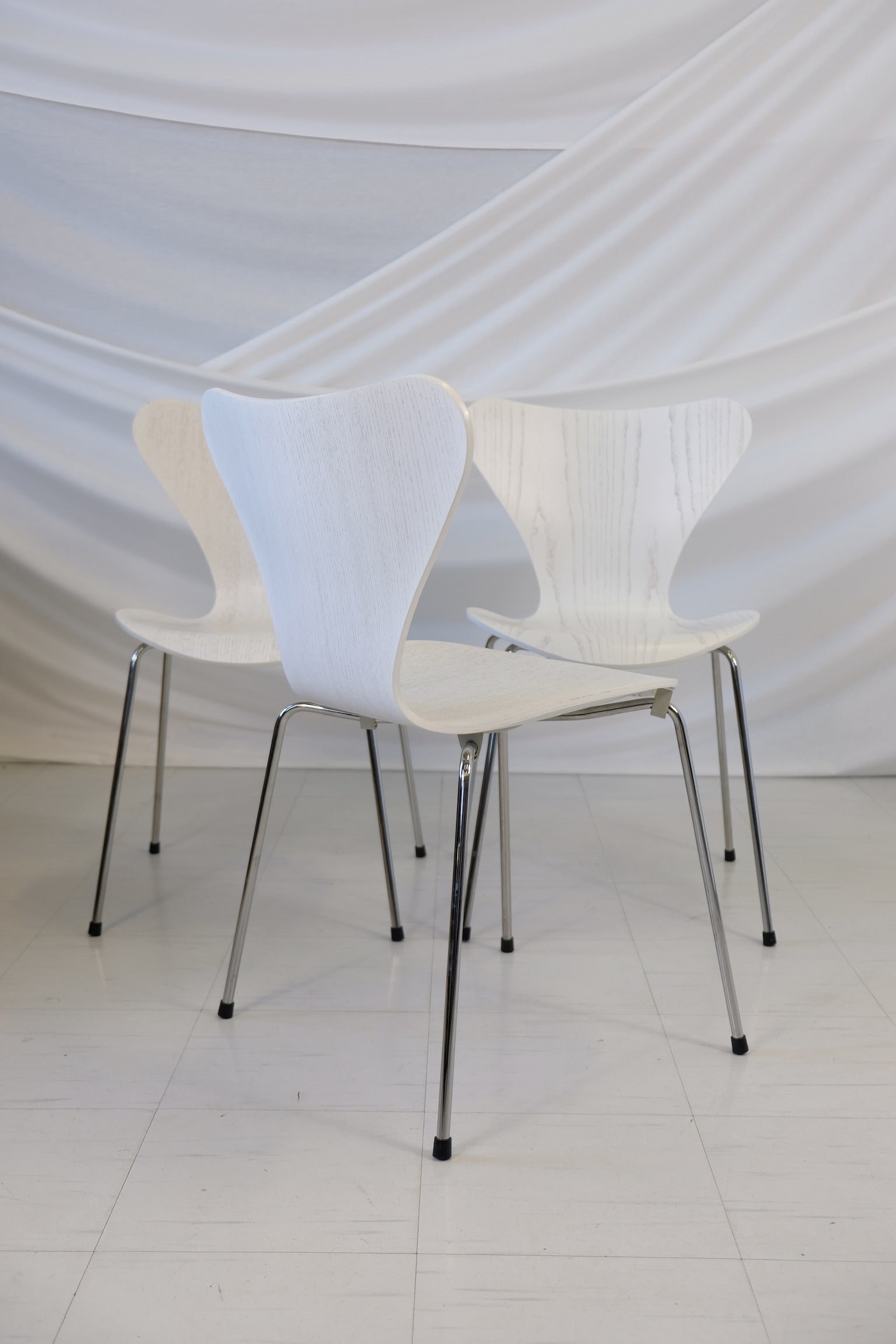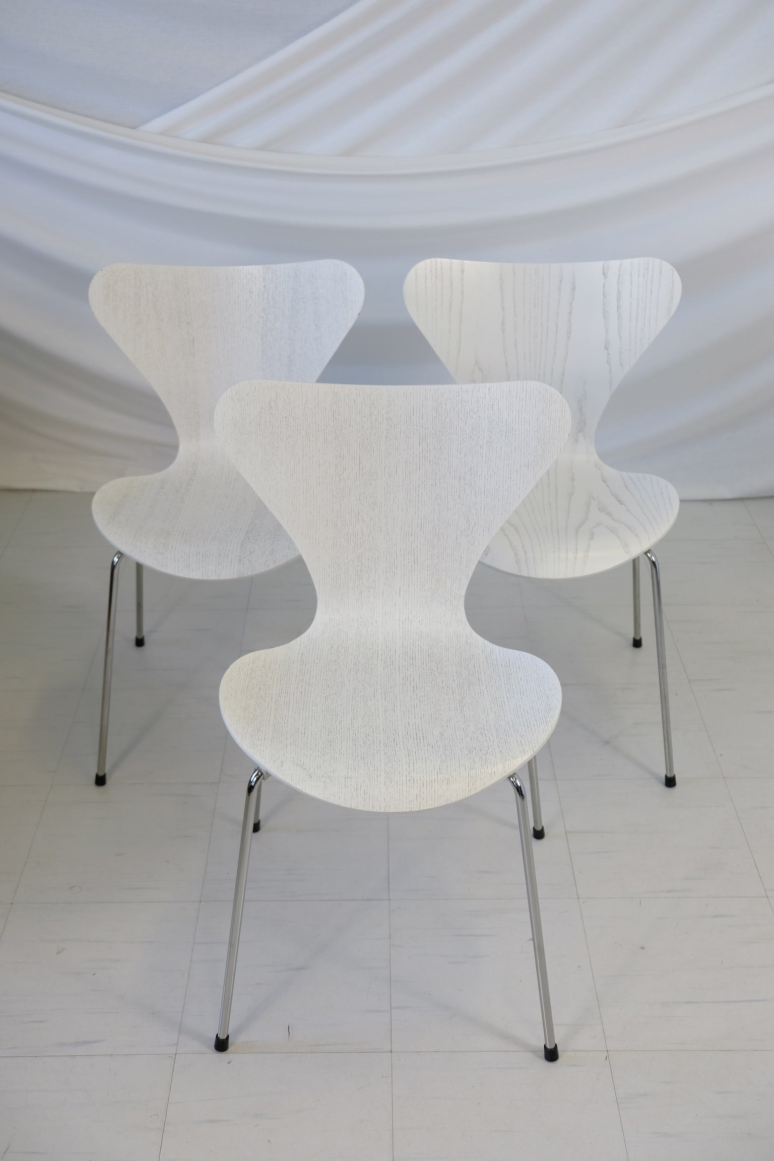 デンマーク・モダニズムの不朽の象徴。1955年にアルネ・ヤコブセンによってデザインされたモデル3107「セブン」チェアは、20世紀を代表するチェアデザインの一つです。フリッツ・ハンセン社製のこの3脚セットは、ホワイトウッドの成形合板製シートとクローム仕上げのスチール脚が特徴です。