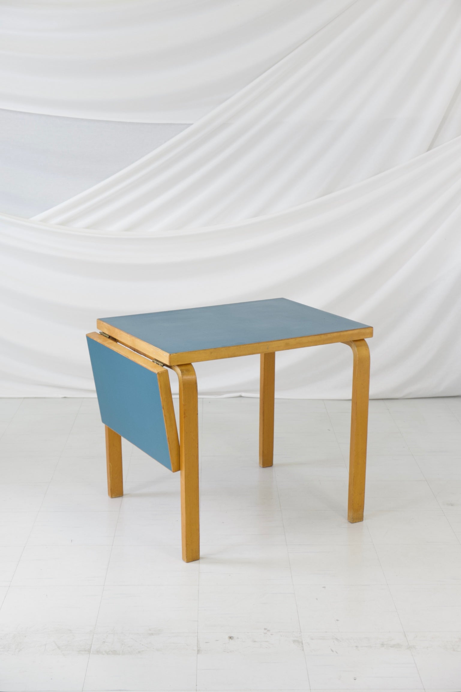 アルヴァ・アアルトによる実用的で時代を超越した名作、アルテック社製のドロップリーフテーブルDL82は、機能主義と温かみの融合というデザイナーの真髄を体現しています。ブルーのリノリウム天板とバーチ無垢材のフレームを組み合わせたこのバージョンは、ヴィンテージインテリアにもコンテンポラリーインテリアにもマッチする、すっきりとしたミニマルなデザインです。