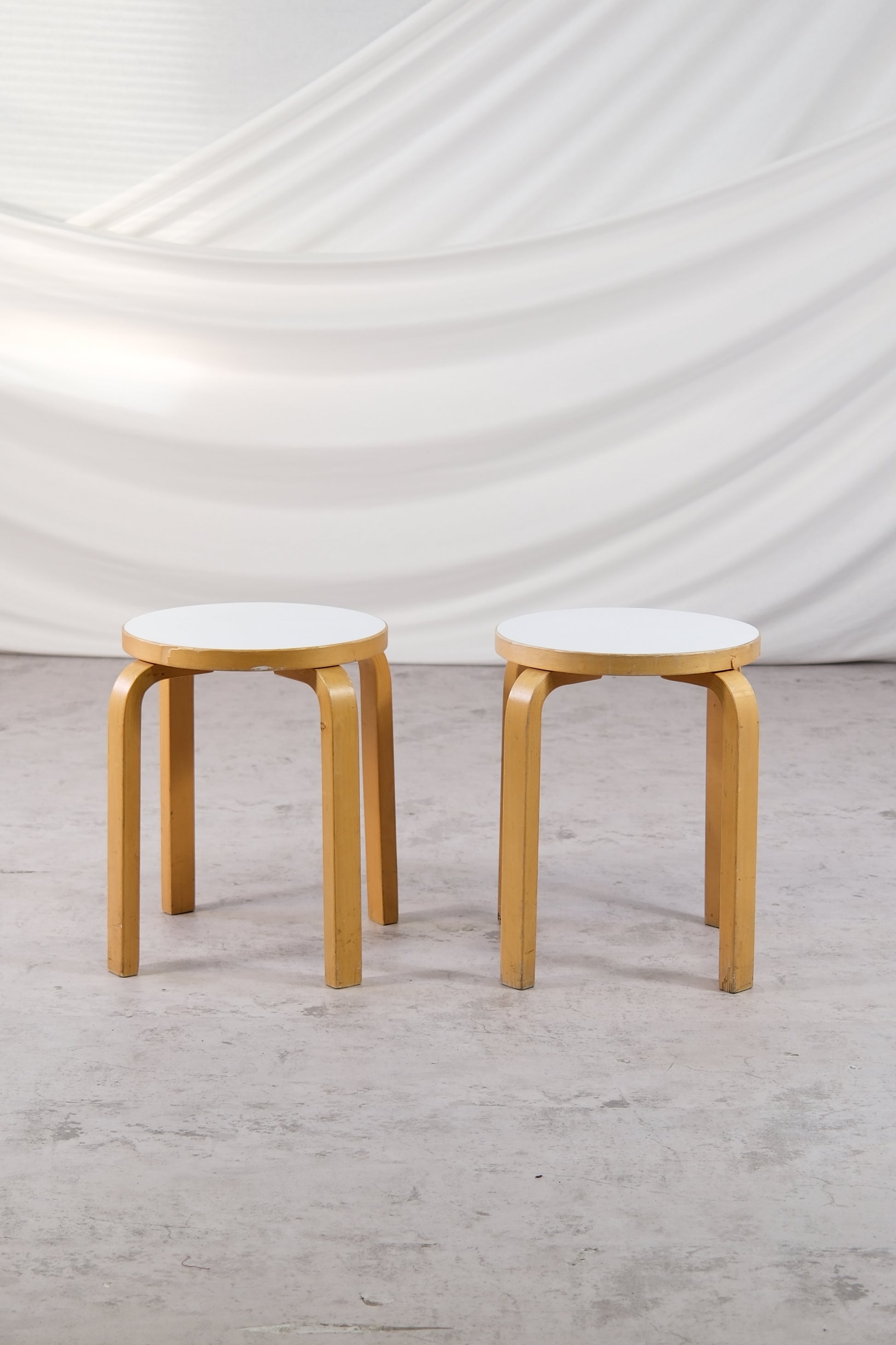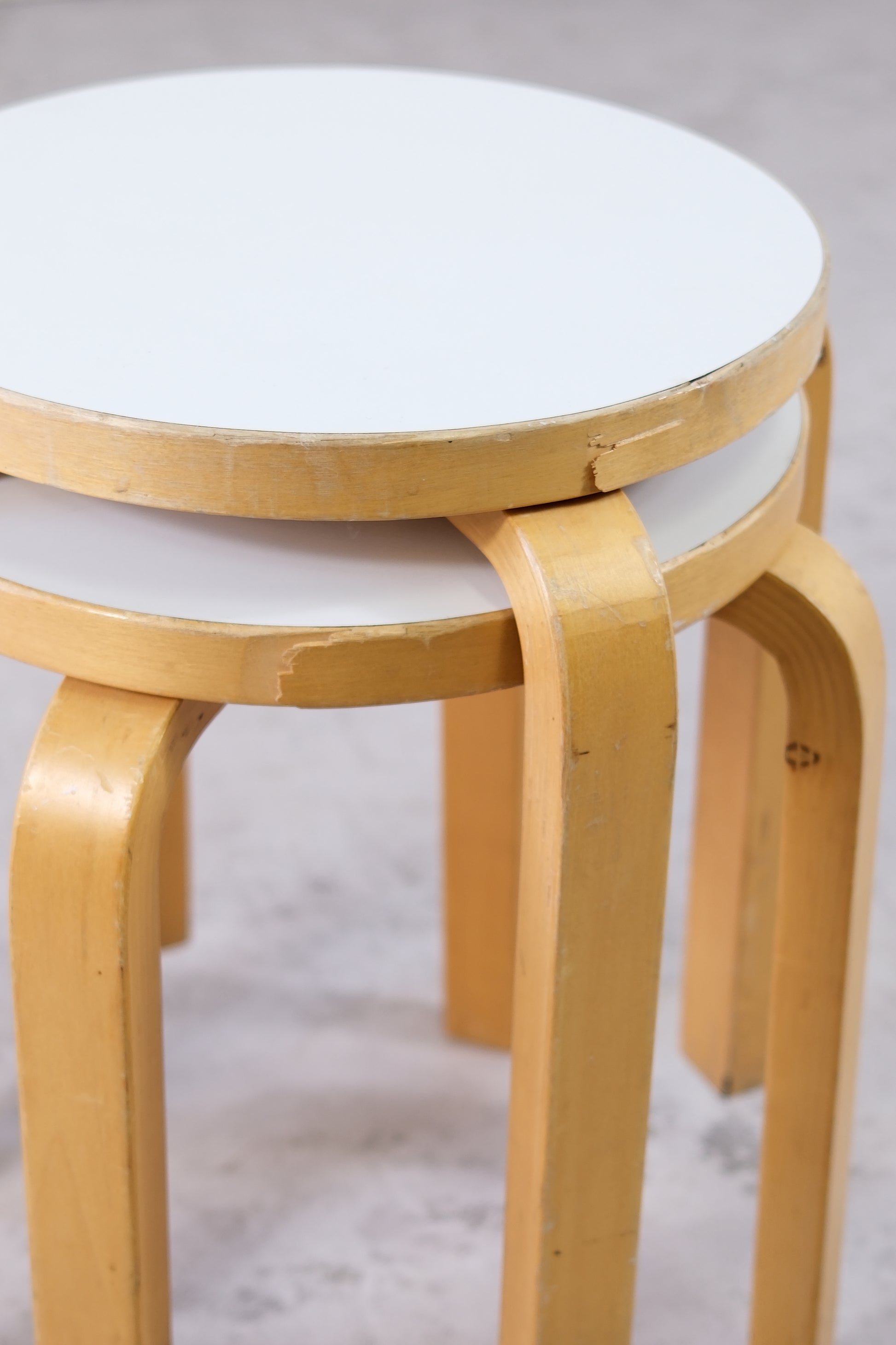 This pair dates to the 1980s and features birch frames with white laminate tops. Both stools show heavier wear, including chips to the seat edges and visible marks, but remain sturdy and usable.