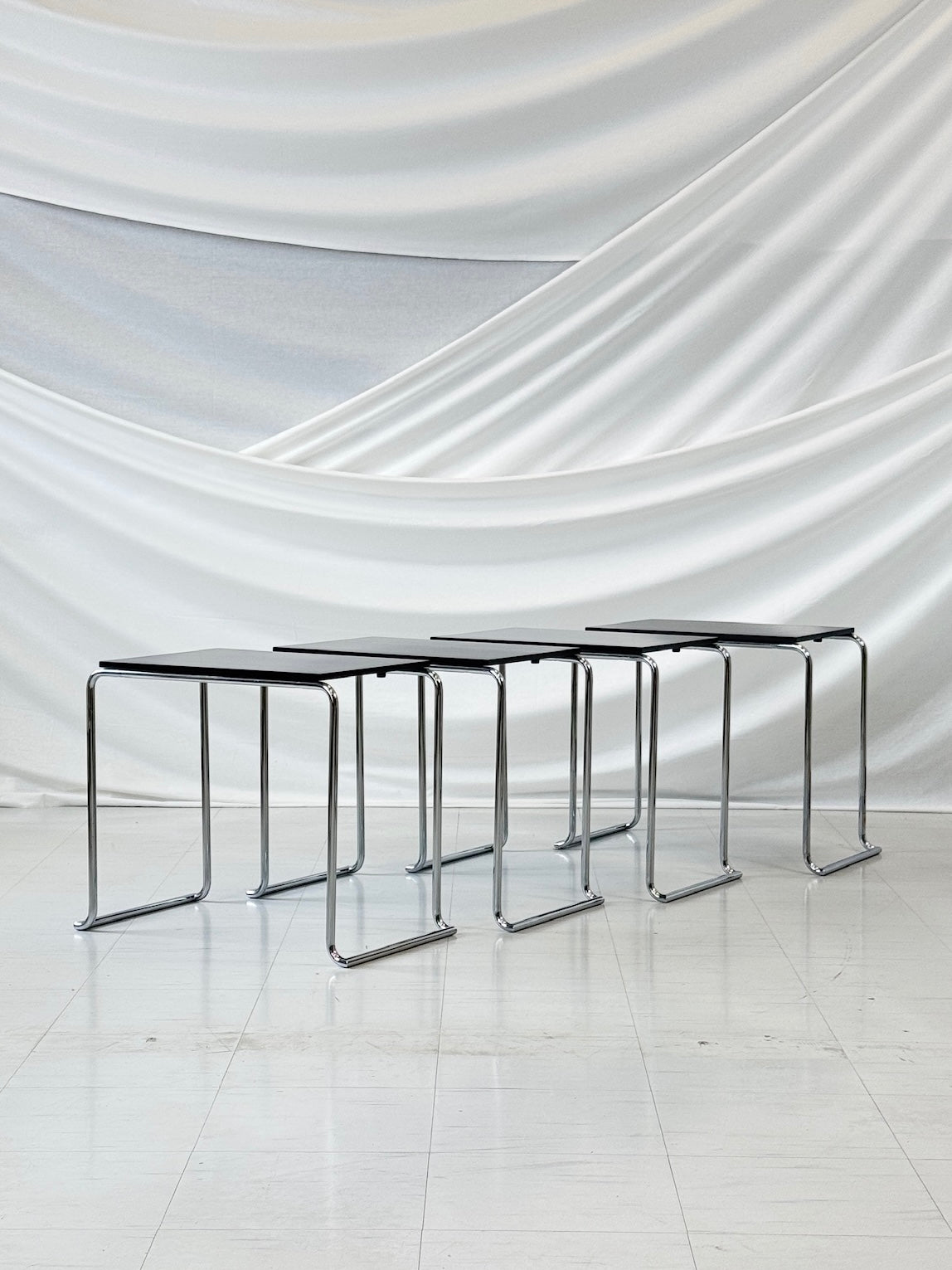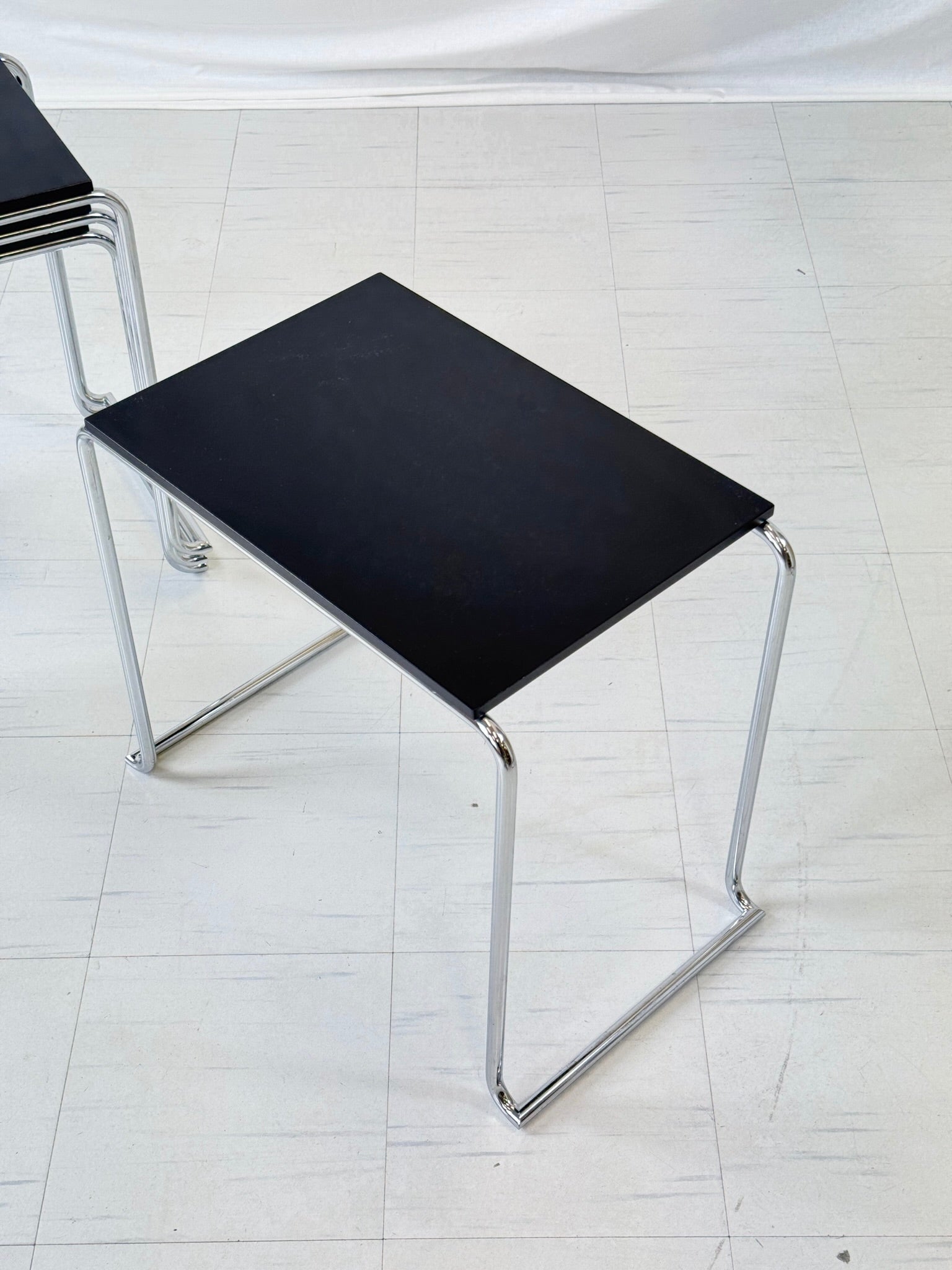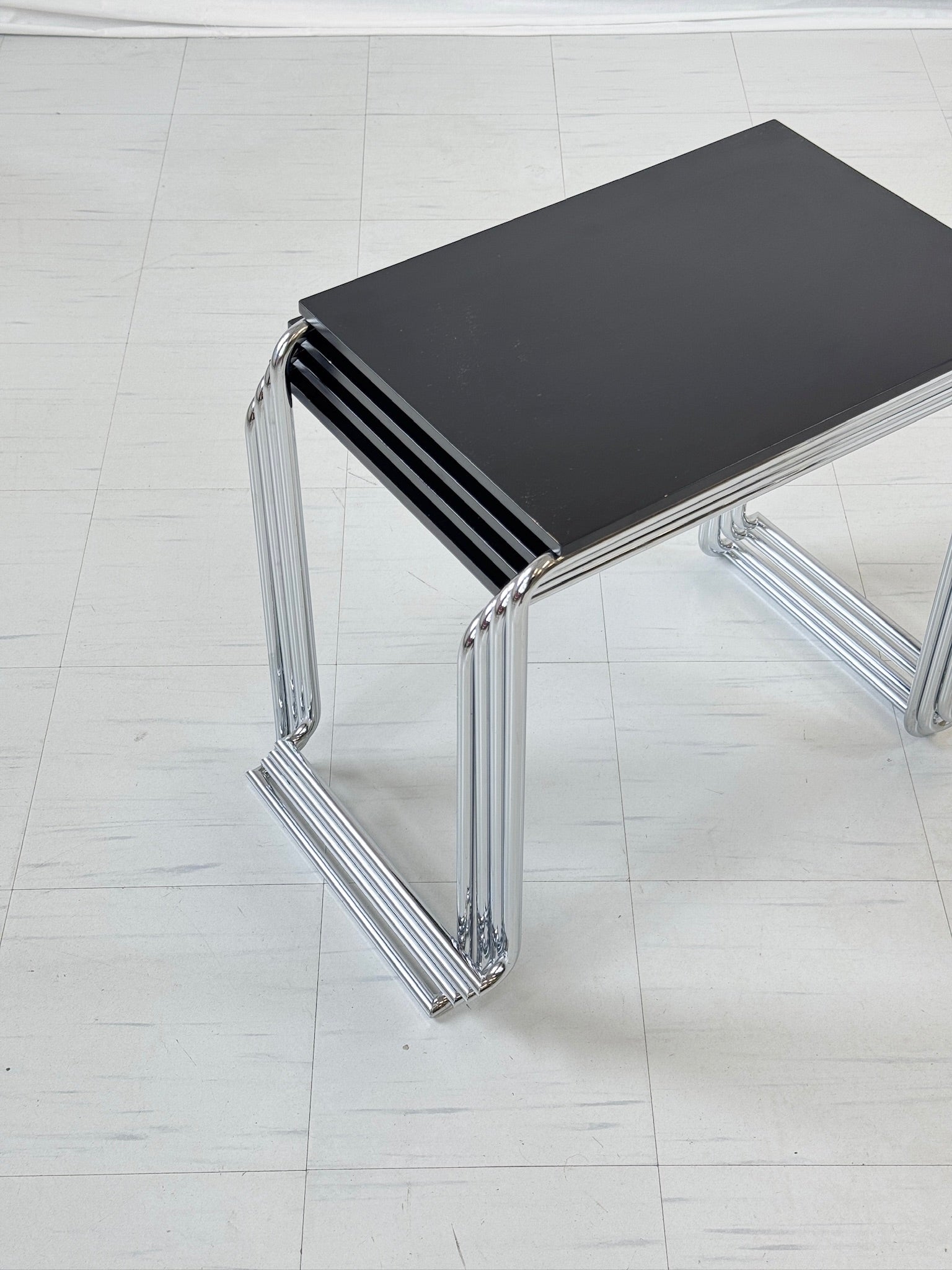 こちらの商品はヴィンテージ品として良好なコンディションです。スチールフレームは安定性と腐食がなく、丁寧に使用されていたため、表面のわずかな摩耗が見られる程度です。ブラックラッカー仕上げの天板には、わずかな表面の傷や経年劣化が見られますが、洗練された外観を保っています。詳細については、詳細な写真をご覧ください。