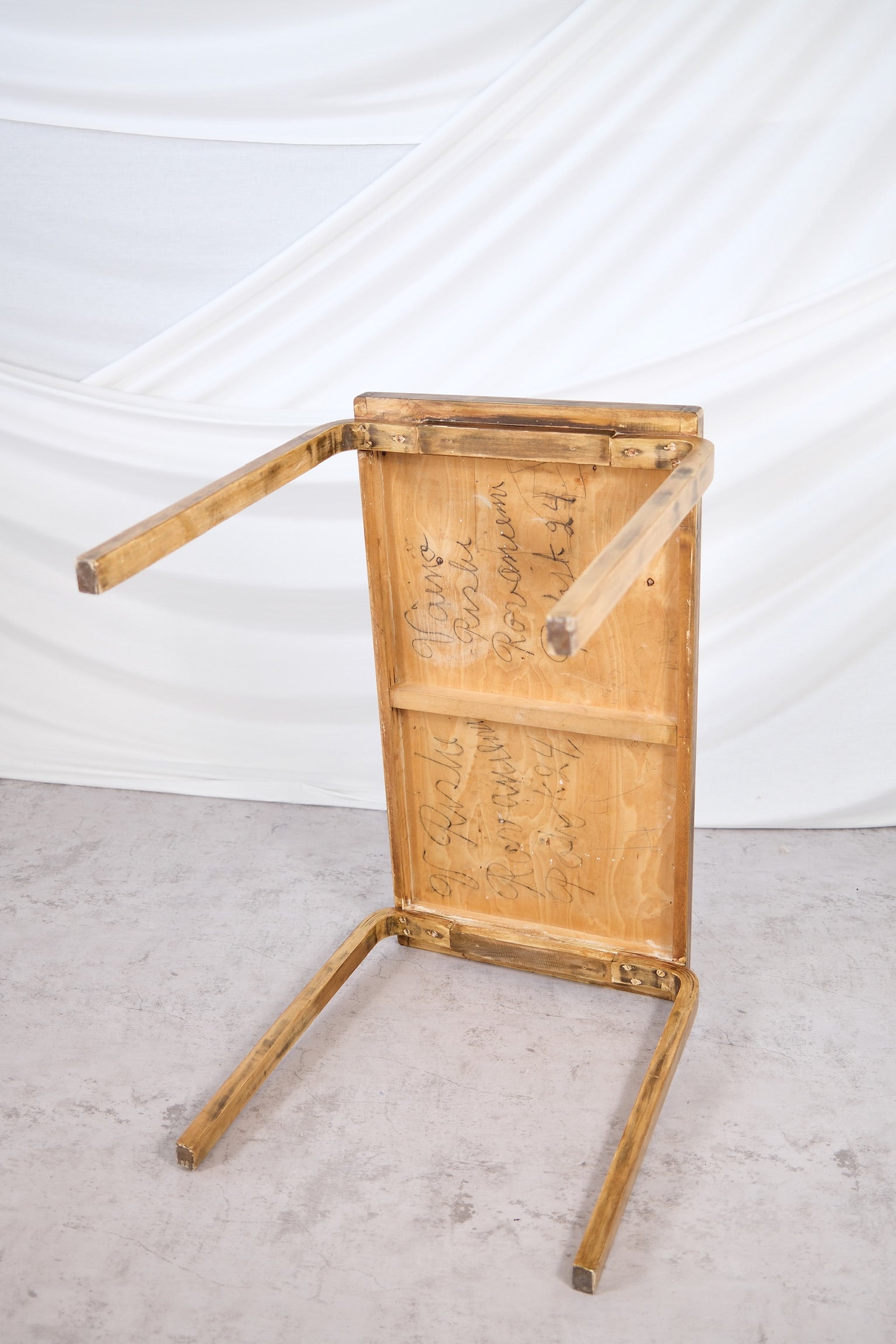 The table has been completely restored and refinished, bringing out the warm tone of the wood while respecting its original character. The underside carries unique handwritten markings, adding to its authenticity and charm.