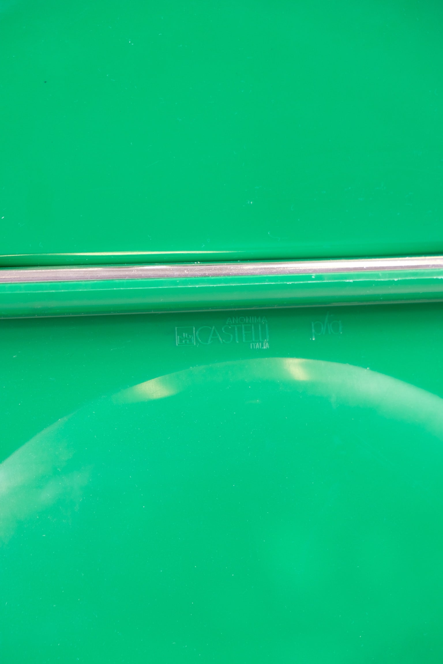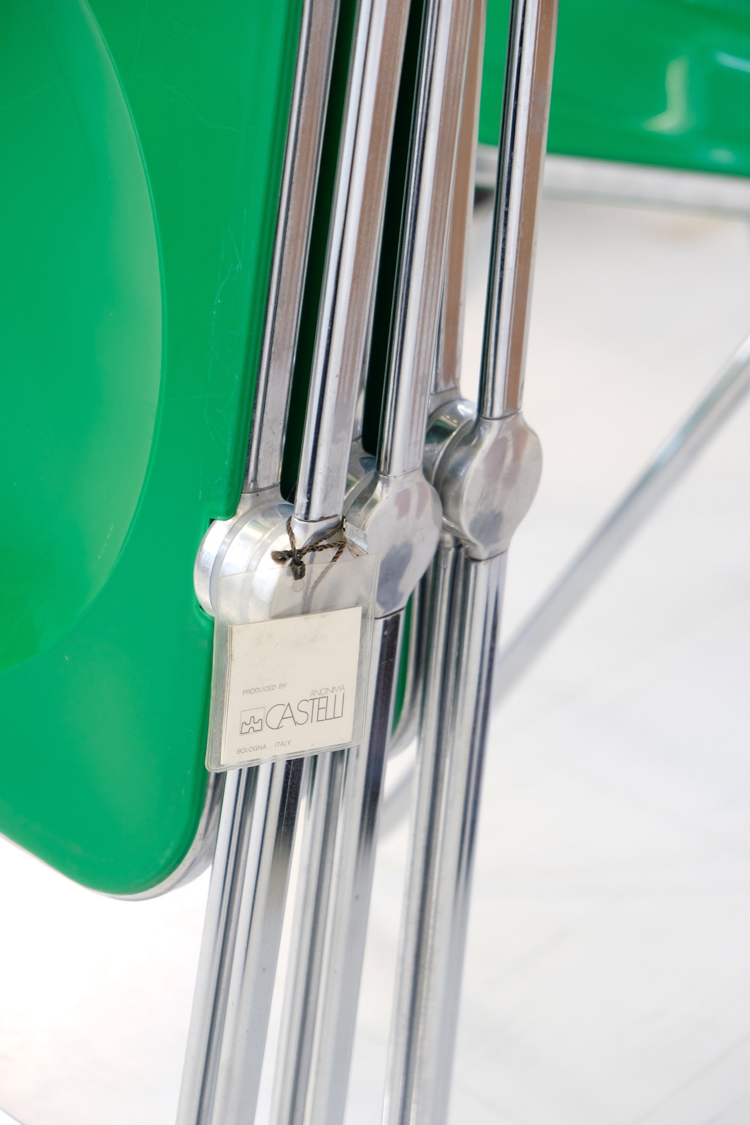 この椅子は、鮮やかなグリーンの座面と背もたれに、クロームメッキのスチールフレームを組み合わせたものです。遊び心のある色彩と洗練された構造の組み合わせが、この椅子の時代を超越した汎用性を強調しています。現代的なインテリアにも、ヴィンテージデザインのコレクションにも、同じように調和します。