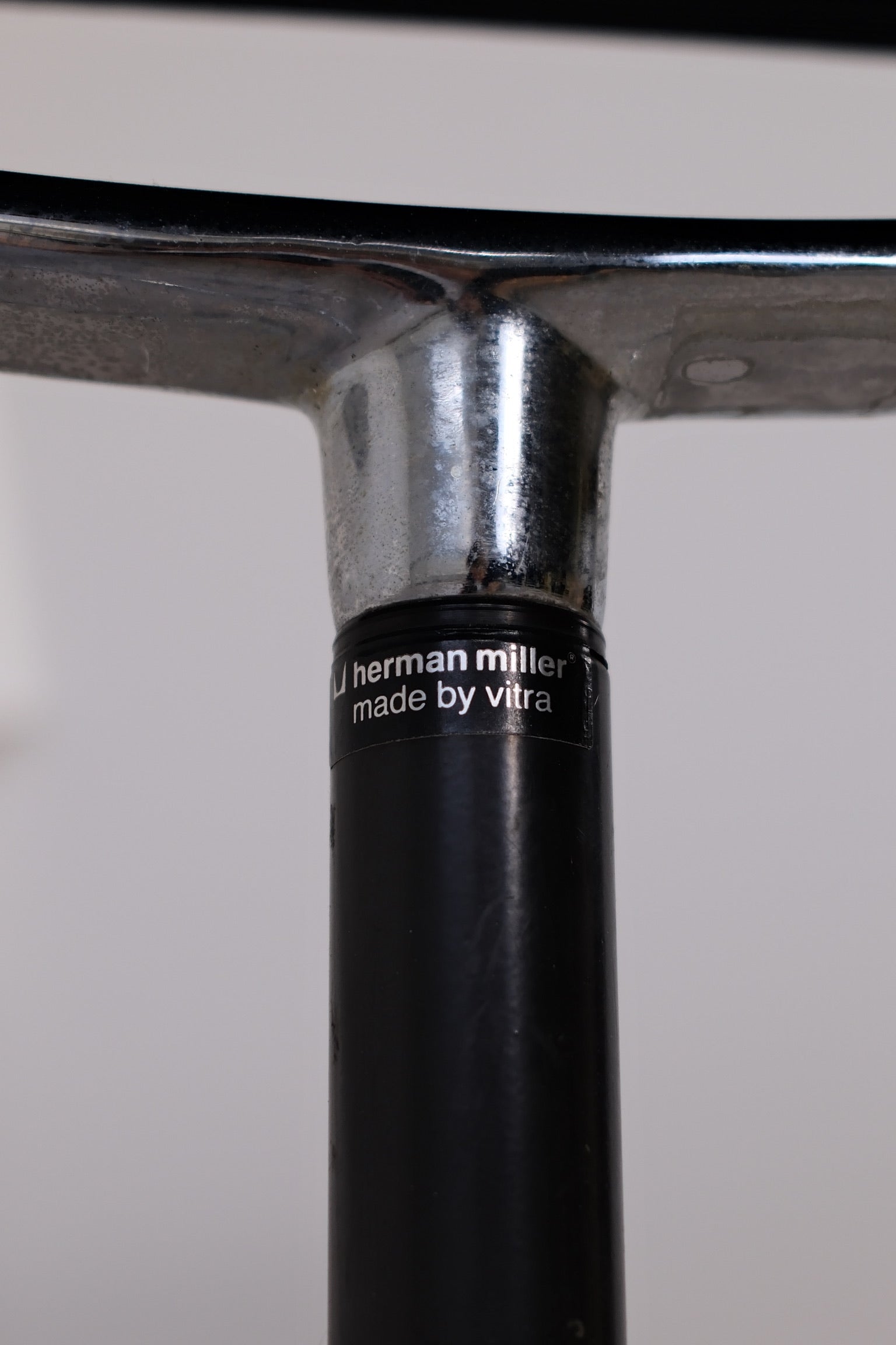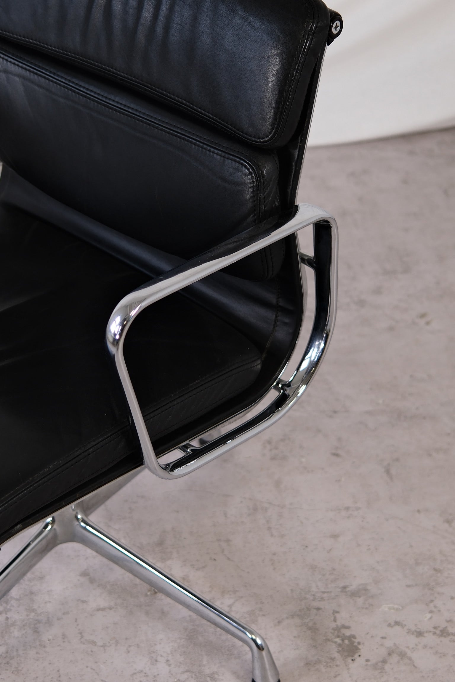 Iconic EA208 Soft Pad chair designed by Charles and Ray Eames for Herman Miller. This version features a polished aluminum frame with black leather upholstery, offering a perfect balance of comfort and precision. A timeless piece that works equally well in office, lounge, or meeting spaces.