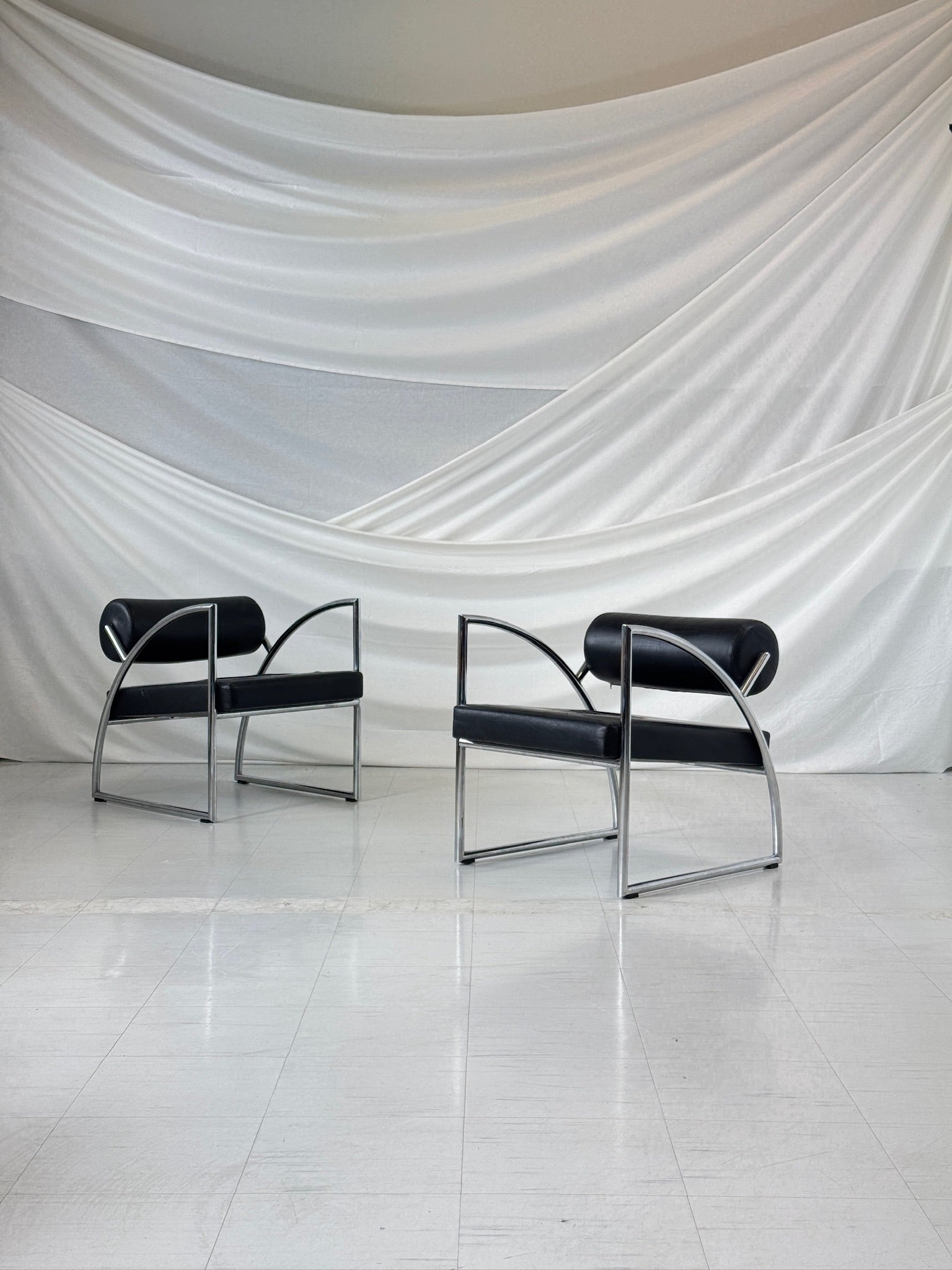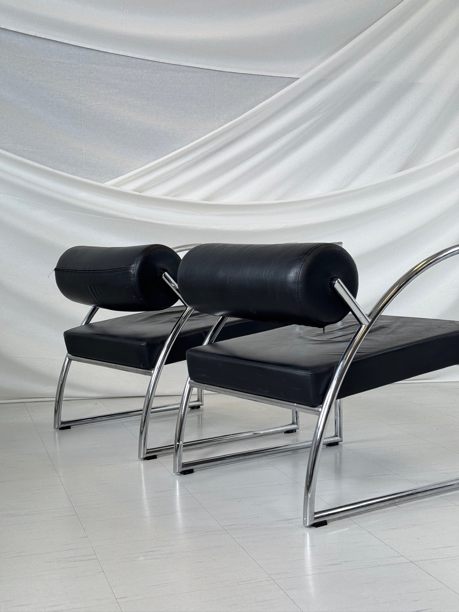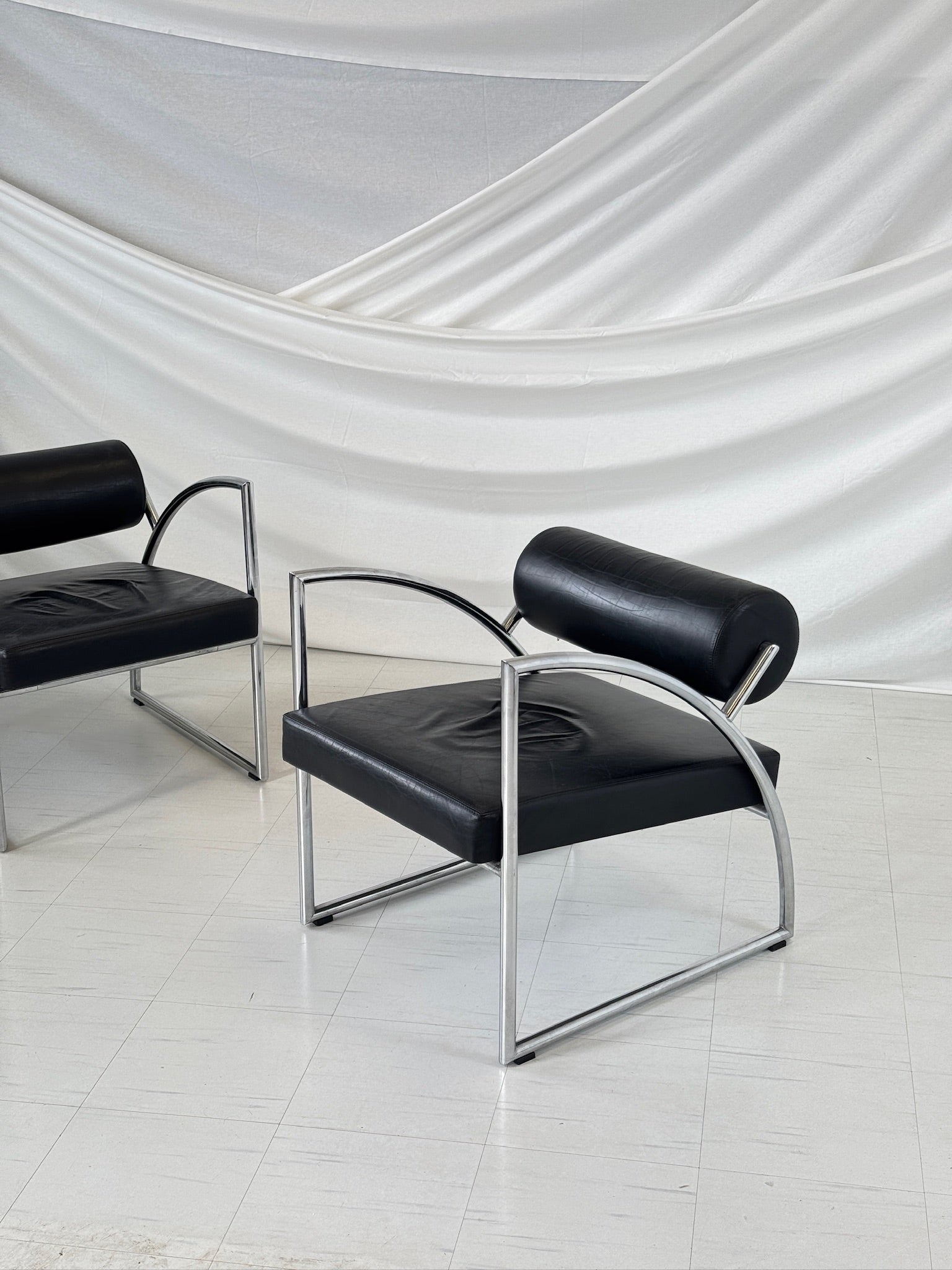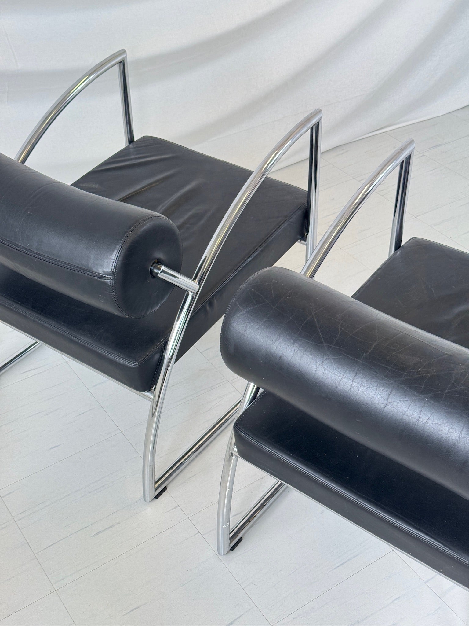 Torben Skov によるデンマークモダンラウンジチェア 2脚。 1980年代にデンマーク人デザイナー、トーベン・スコヴィンによってデザインされた、この希少なラウンジチェアは、スカンジナビアの機能主義を体現する、すっきりとしたラインが特徴です。クロームメッキのスチールパイプフレームと、洗練されたブラックレザーの張地が印象的な組み合わせです。大胆でありながらミニマルなシルエットで、曲線を描くアームレストと低めのプロポーションが、快適さと構造の両方を強調しています。