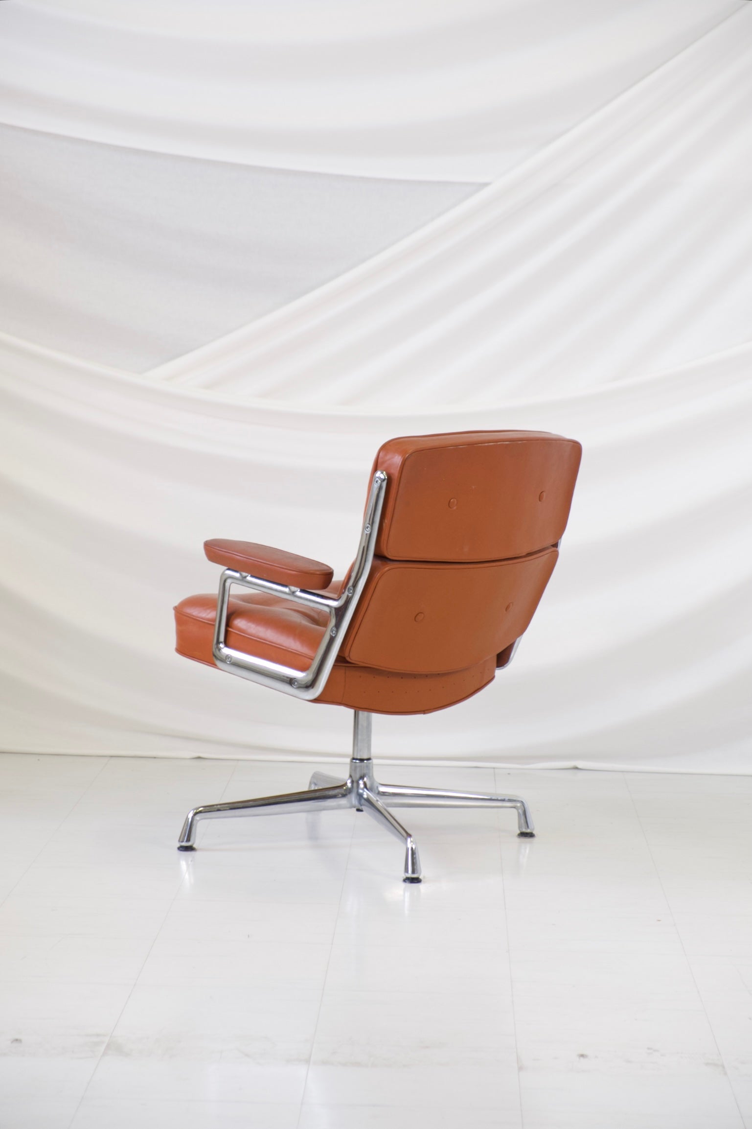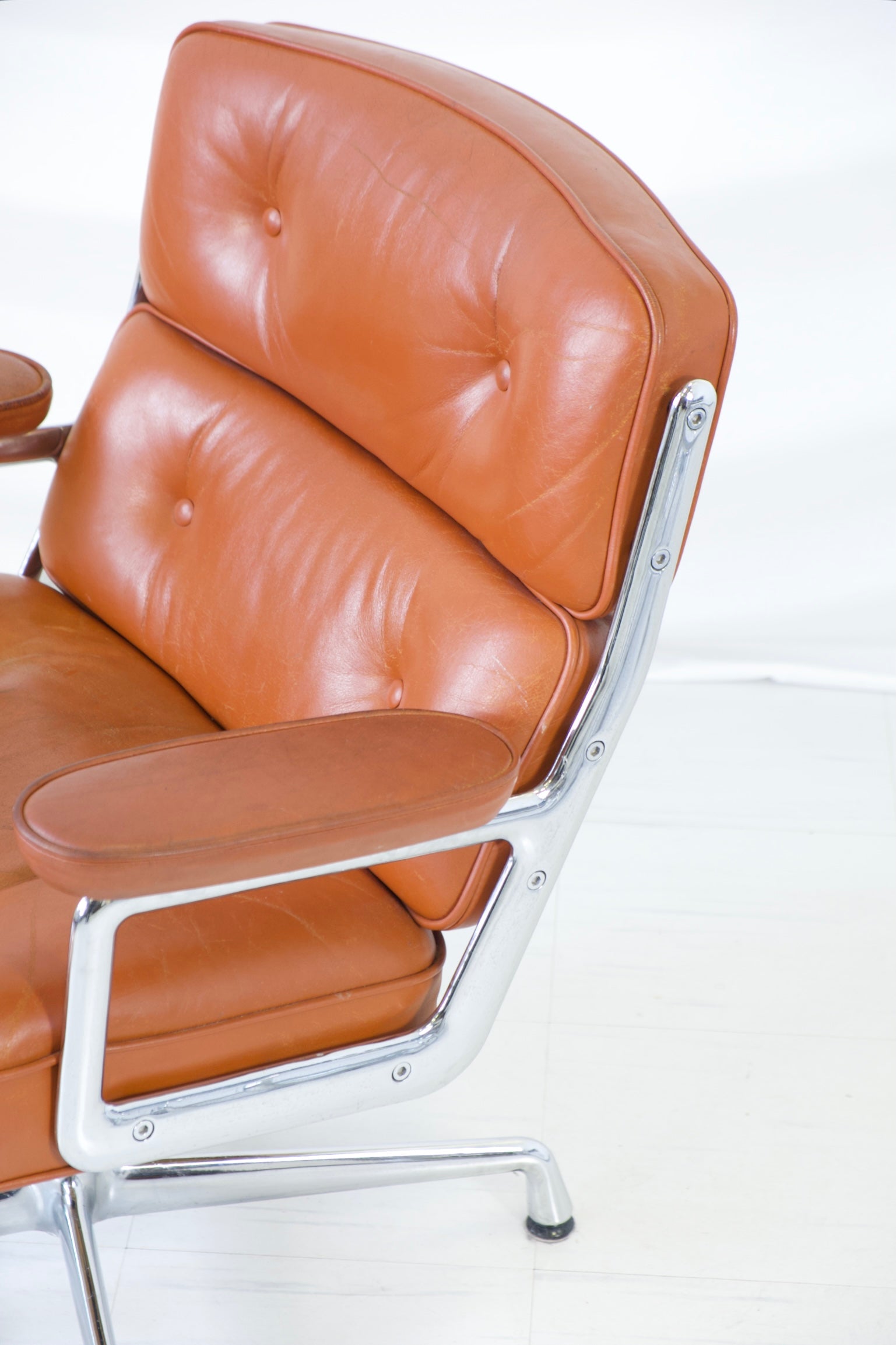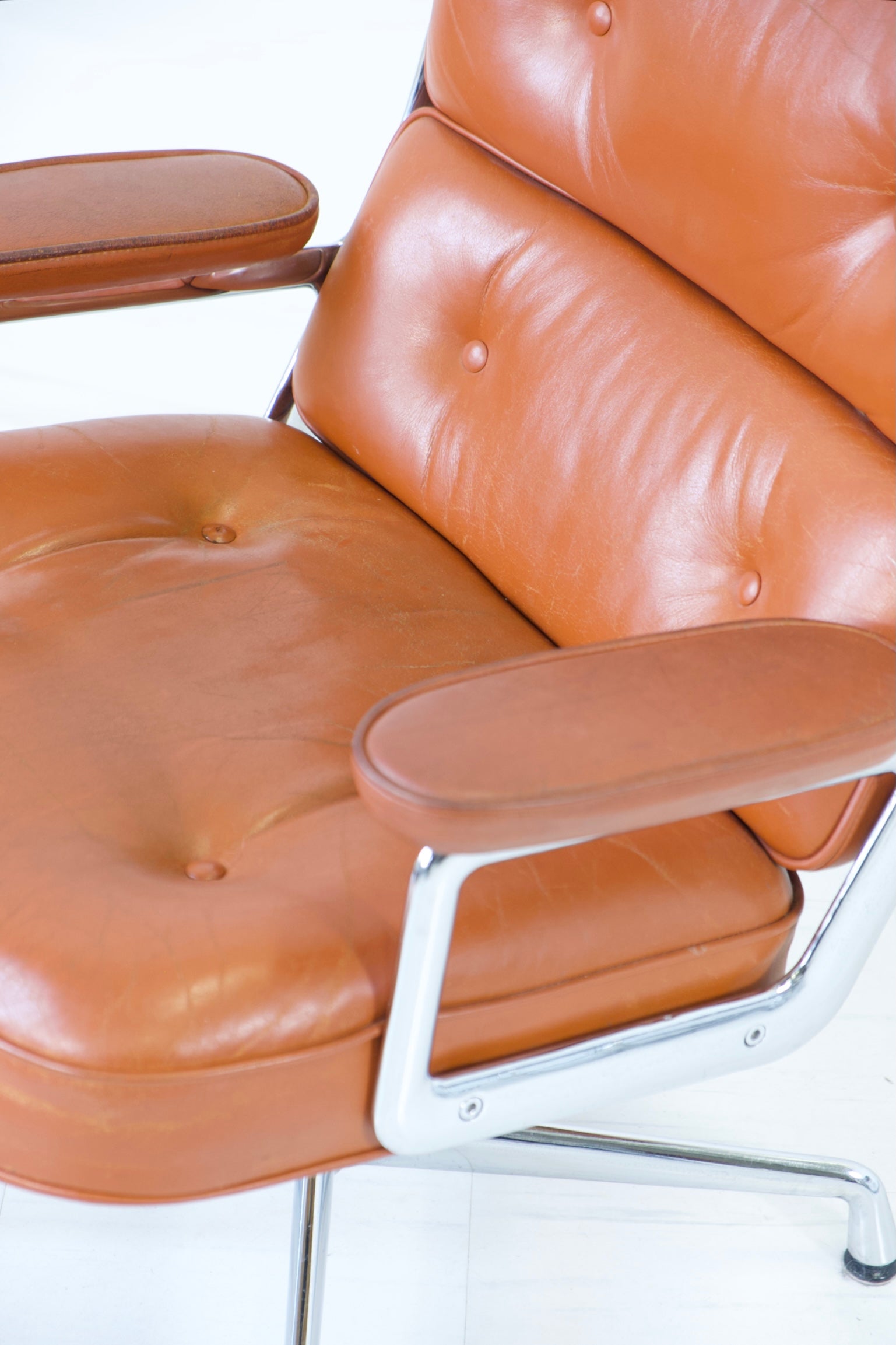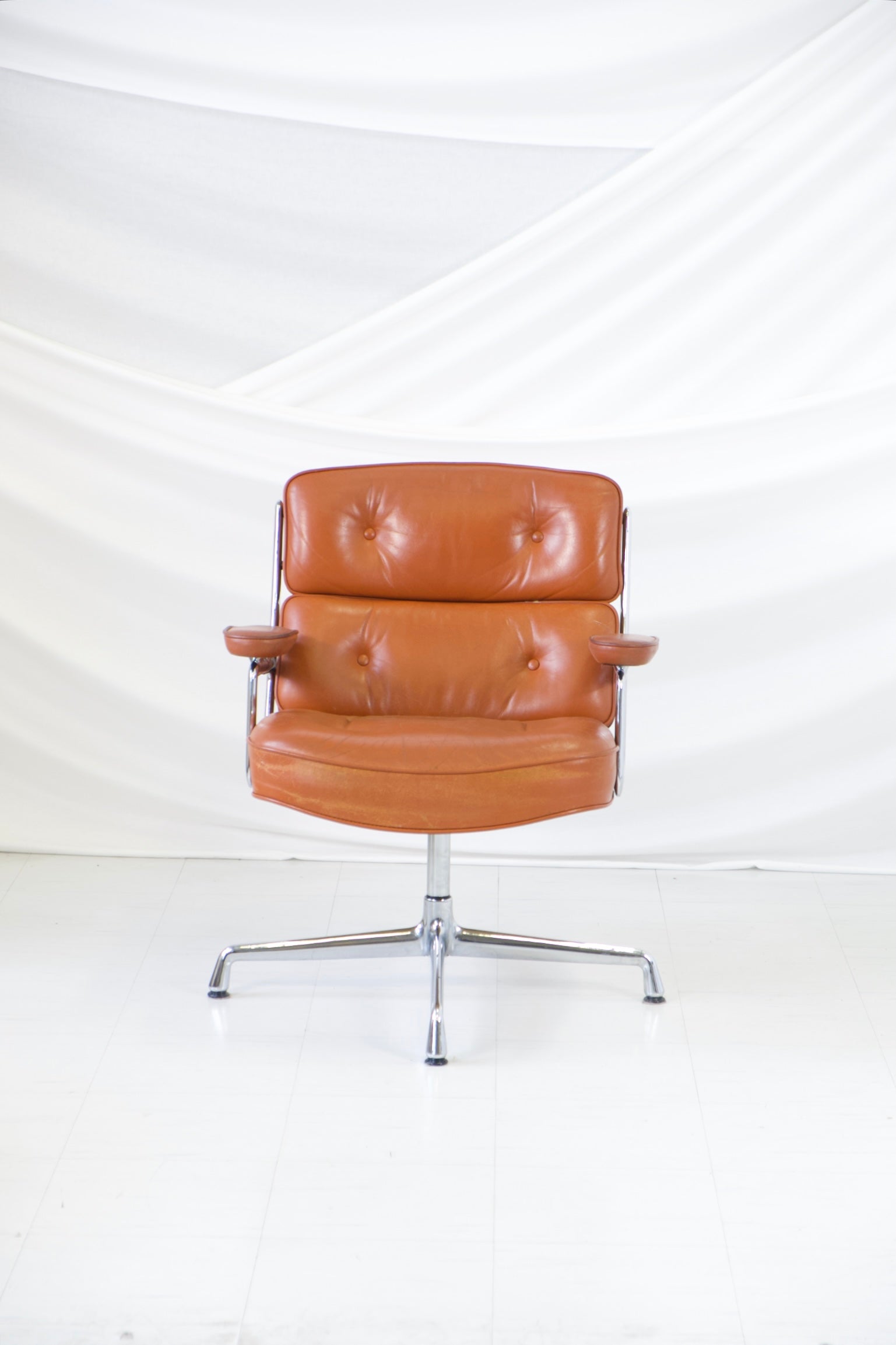 美しい古色を帯びたコニャックレザーの張地と、磨き上げられたクロームフレームが特徴のこのチェアは、たっぷりとしたクッション性と人間工学に基づいたフォルムが、ミッドセンチュリーデザインの洗練された洗練さを体現しながら、いつまでも快適な座り心地を提供します。