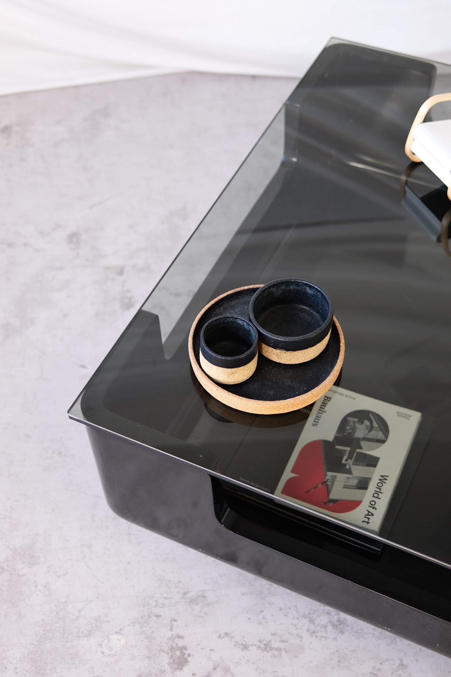 Designed by Finnish designer Eero Aarnio, this sculptural coffee table captures the playful futurism that defined his work in the 1960s and 70s. The bold geometric form, molded from glossy black fiberglass, features integrated open storage on all sides, topped with a thick smoked glass surface.
