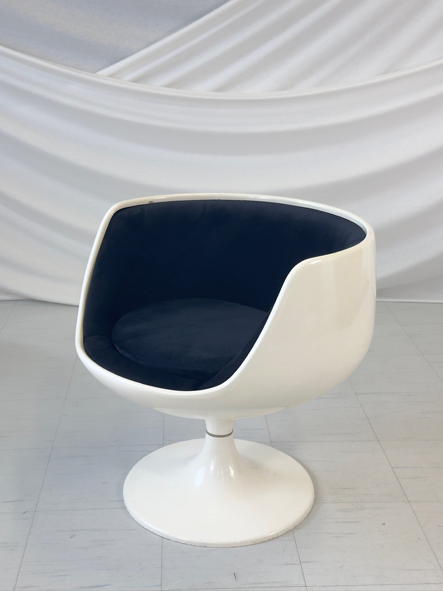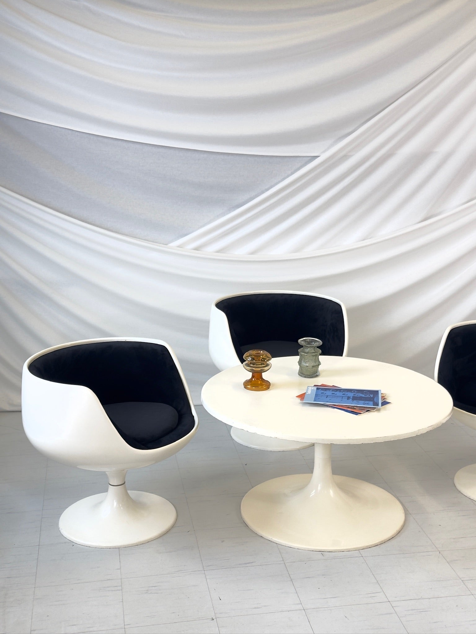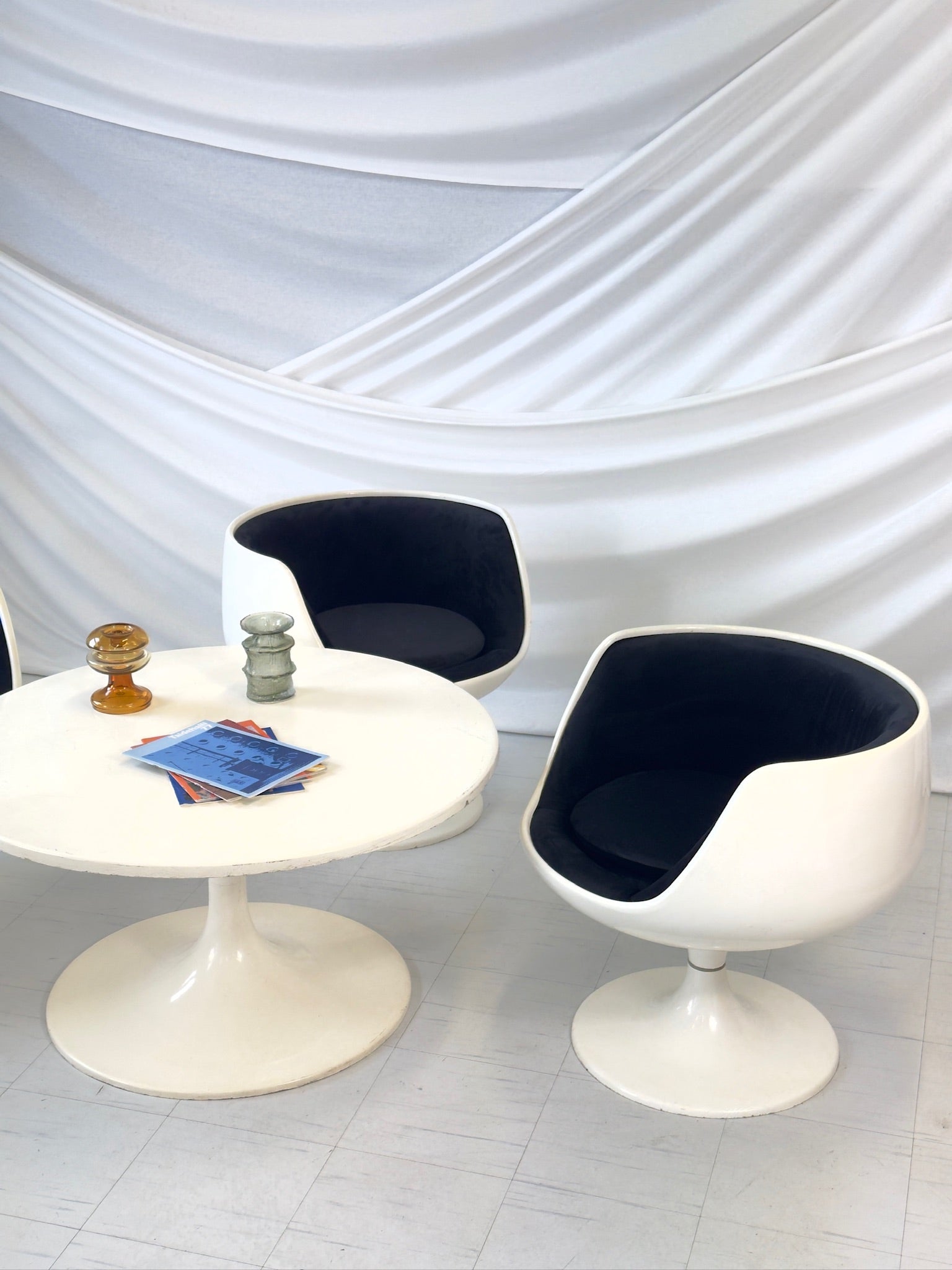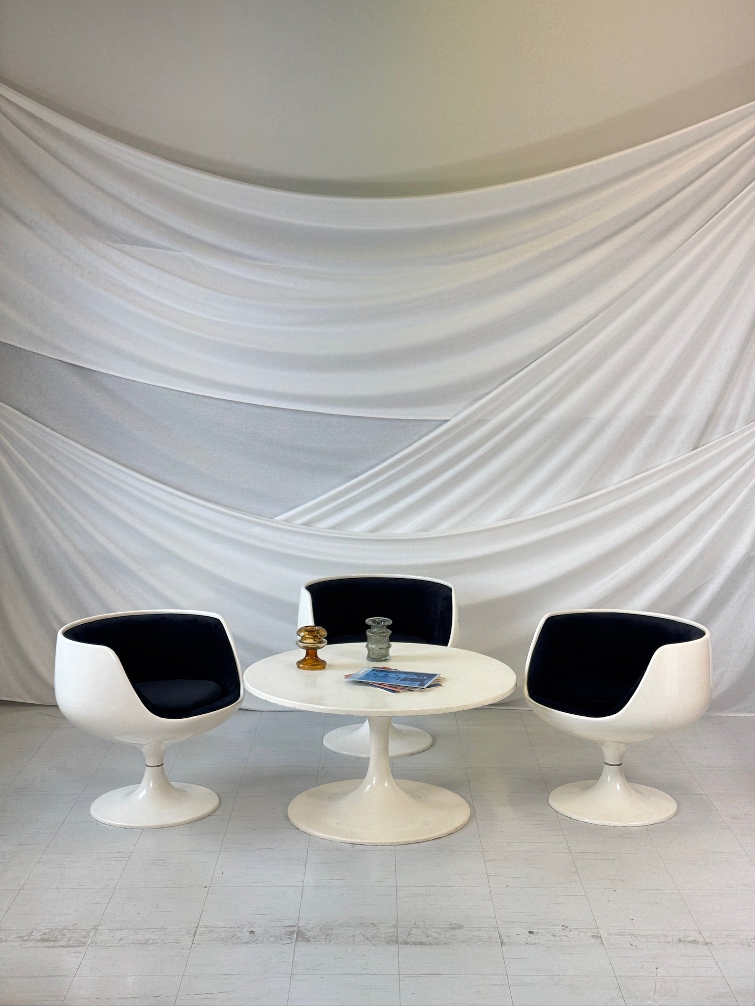 1970年代にエーロ・アールニオがデザインした、希少で魅惑的なラウンジセット。光沢のある白いファイバーグラス製の「コニャック」回転椅子3脚と、新しく張り替えられた黒いベルベットの内装が特徴です。彫刻的で宇宙時代を彷彿とさせるこれらの象徴的な椅子は、アールニオの有機的なフォルムと未来的なデザインへの情熱を反映しています。