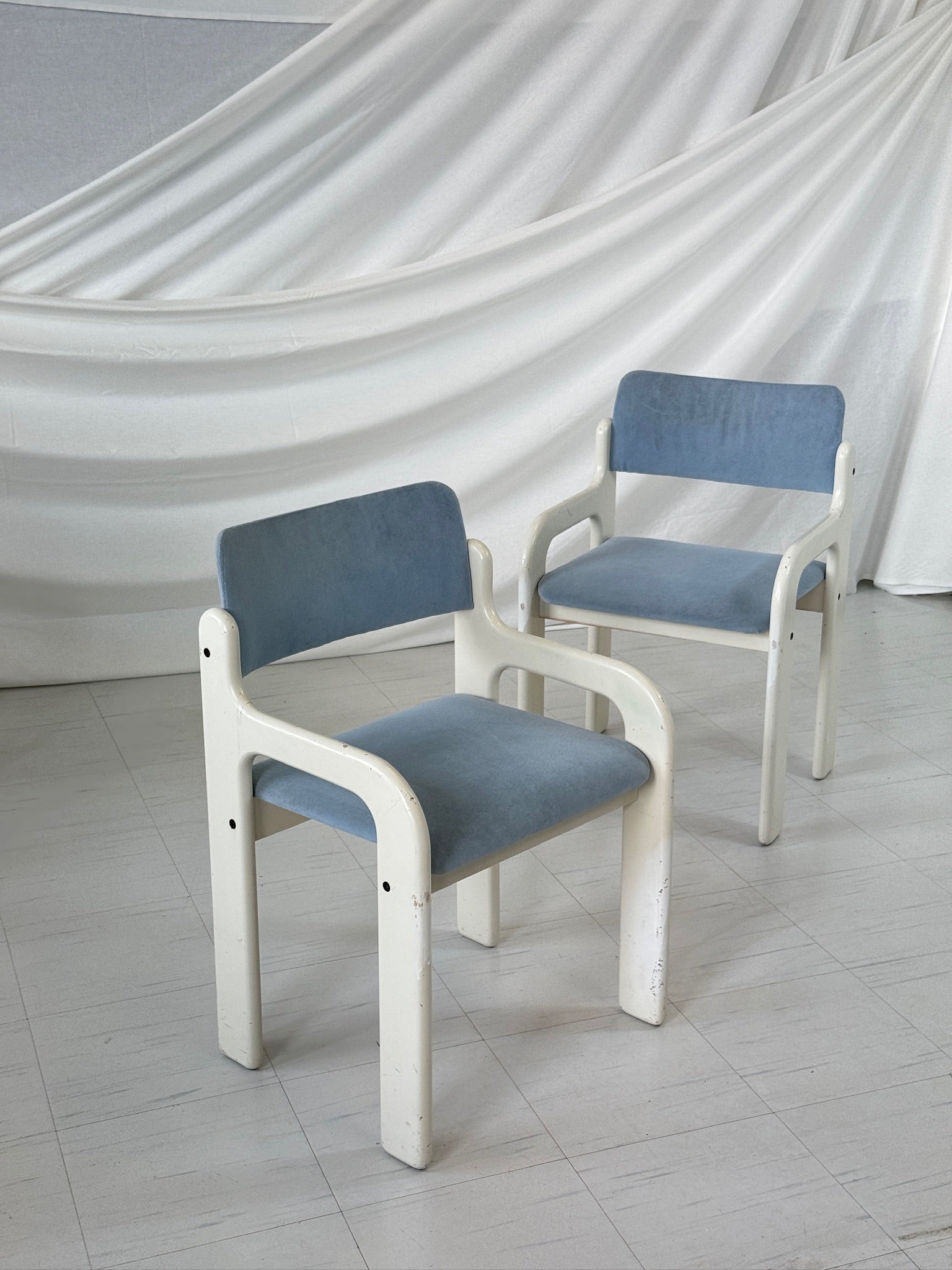 1970年代にフィンランド人デザイナー、エーロ・アールニオがAskoのためにデザインしたフラミンゴチェアは、スカンジナビアのミニマリズムと遊び心のあるフォルムを融合させた彫刻的なアイコンです。滑らかで緩やかな曲線を描く木製フレームは鮮やかな白に塗装され、鮮やかなブルーのファブリックで覆われた吊り下げ式の座面と背もたれを支えています。有機的なシルエットと大胆な色彩の調和が、どんなモダンなインテリアにも映える逸品です。