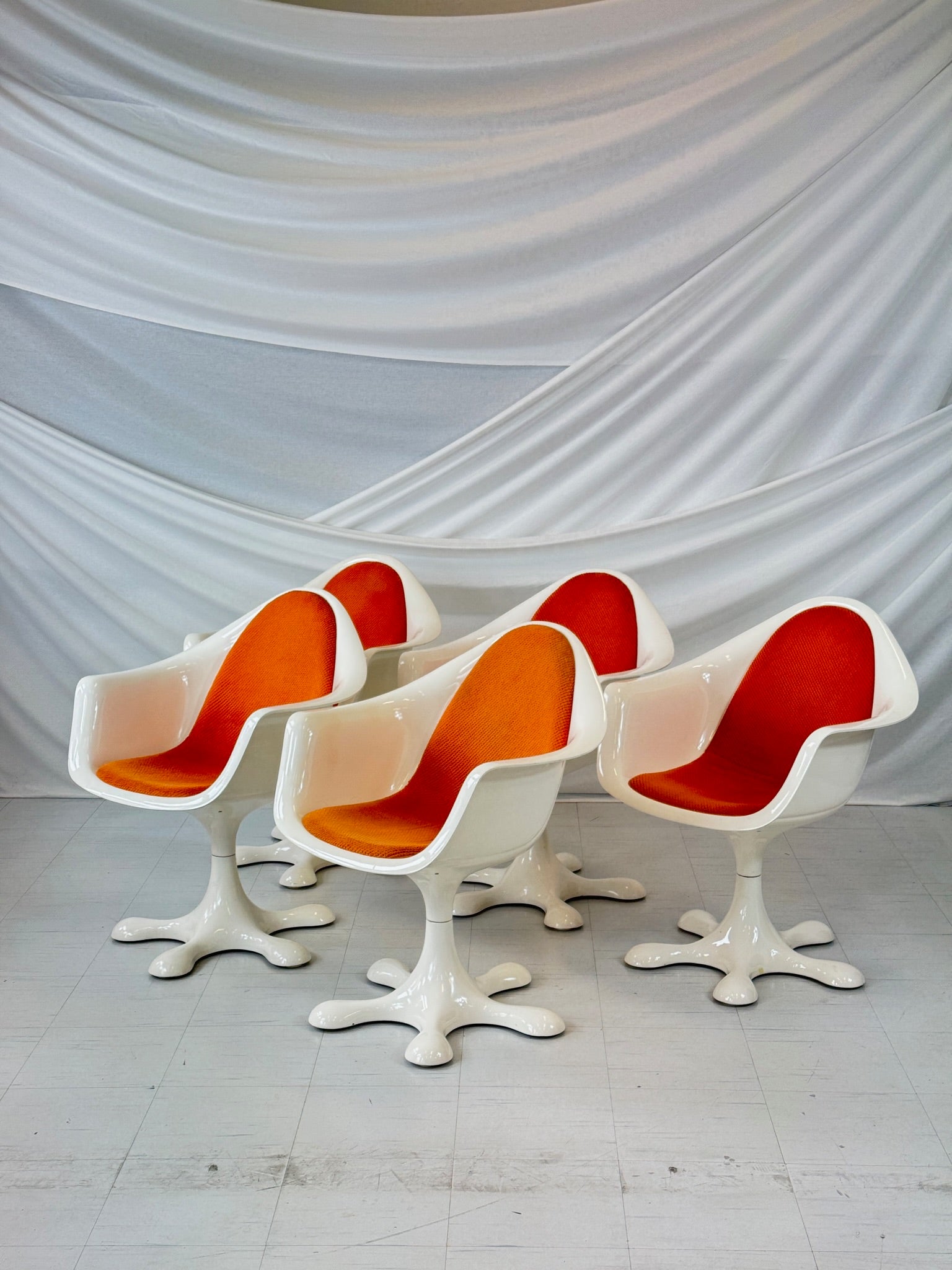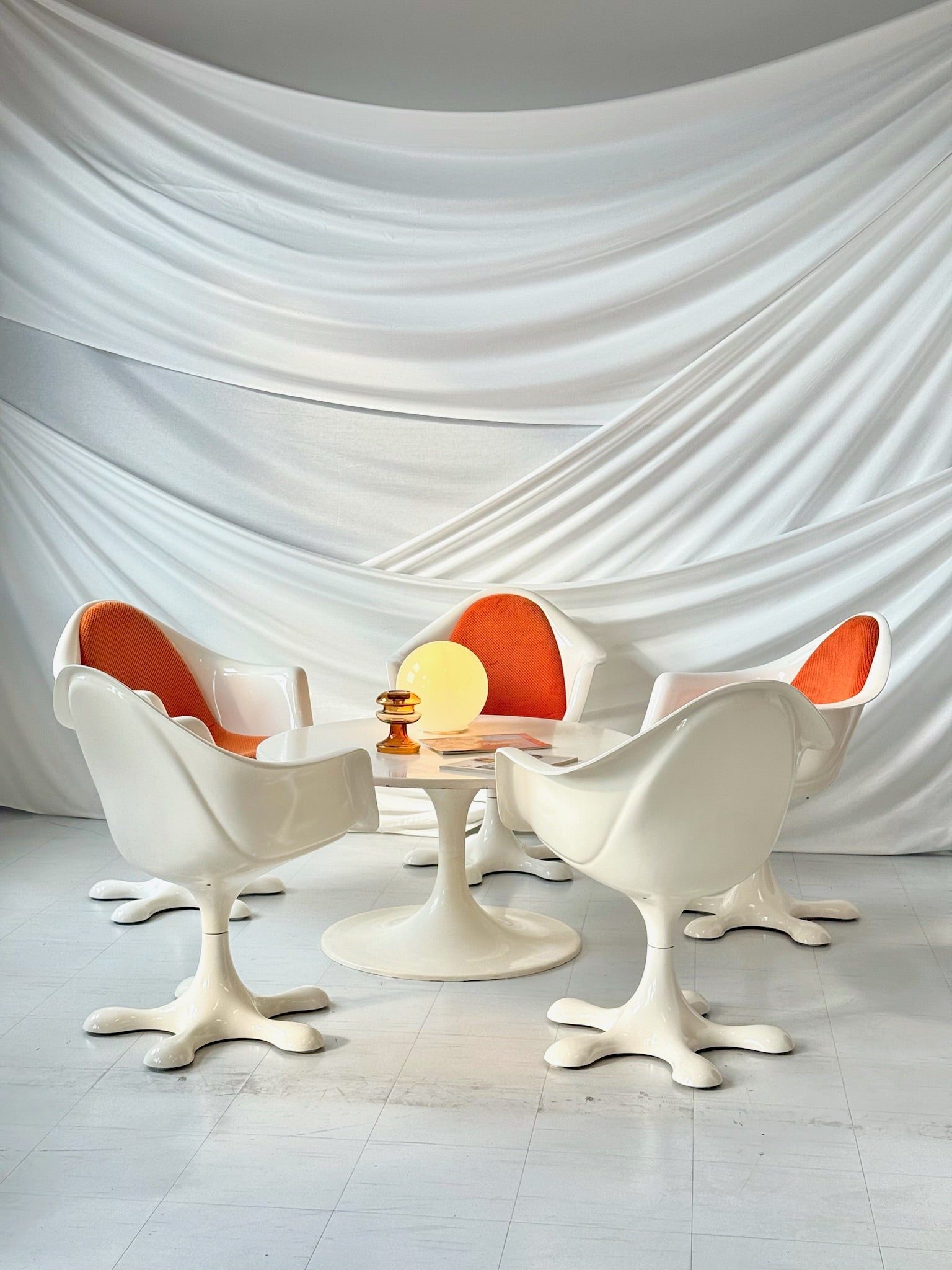 フィンランドの著名なデザイナー、エーロ・アールニオが1970年代初頭にデザインした、希少なオリオンチェア5脚セット。彫刻的なフォルムと遊び心のある機能性を兼ね備えた、宇宙時代の家具デザインの真髄を体現した、この回転椅子はまさに逸品です。