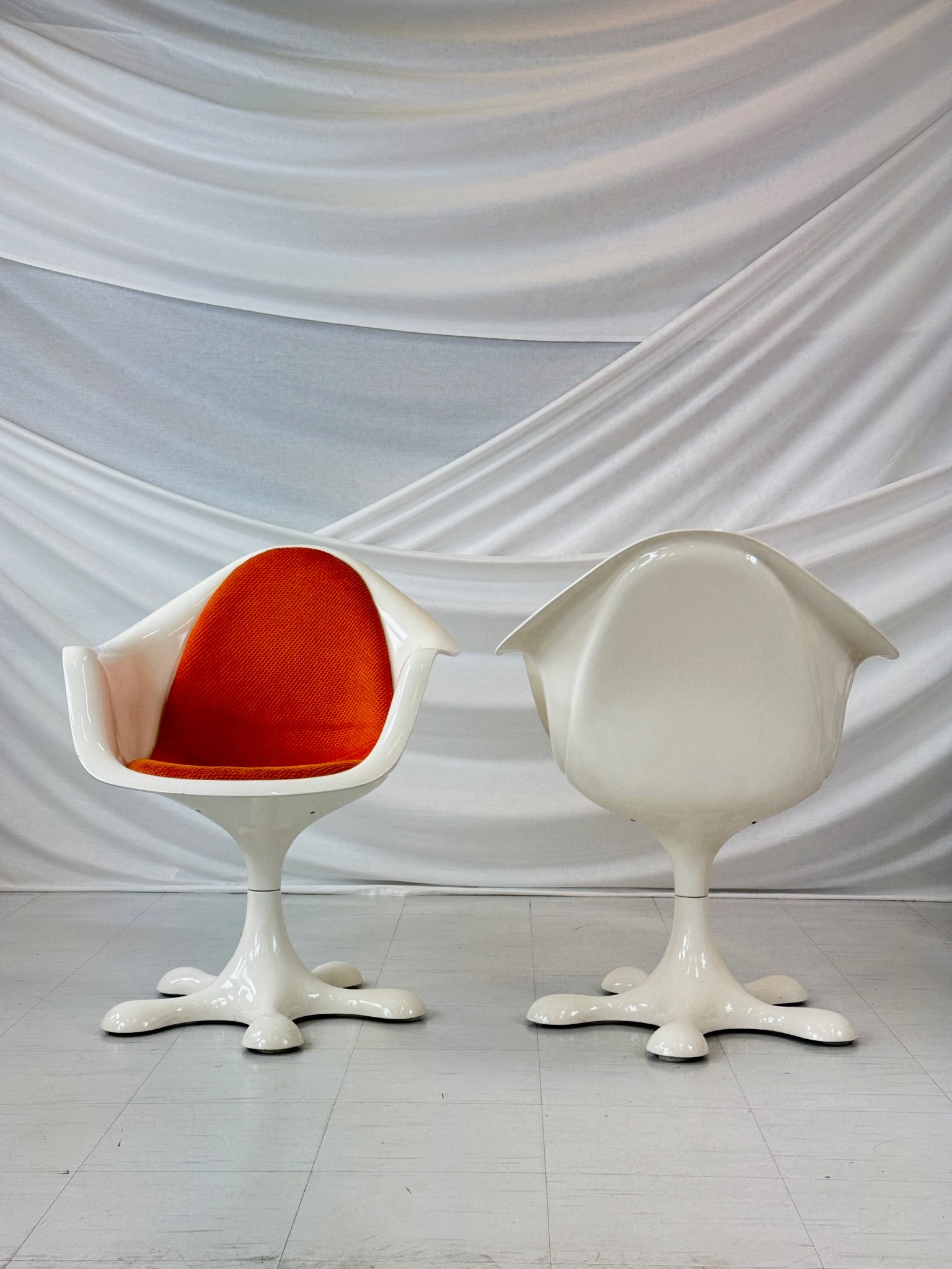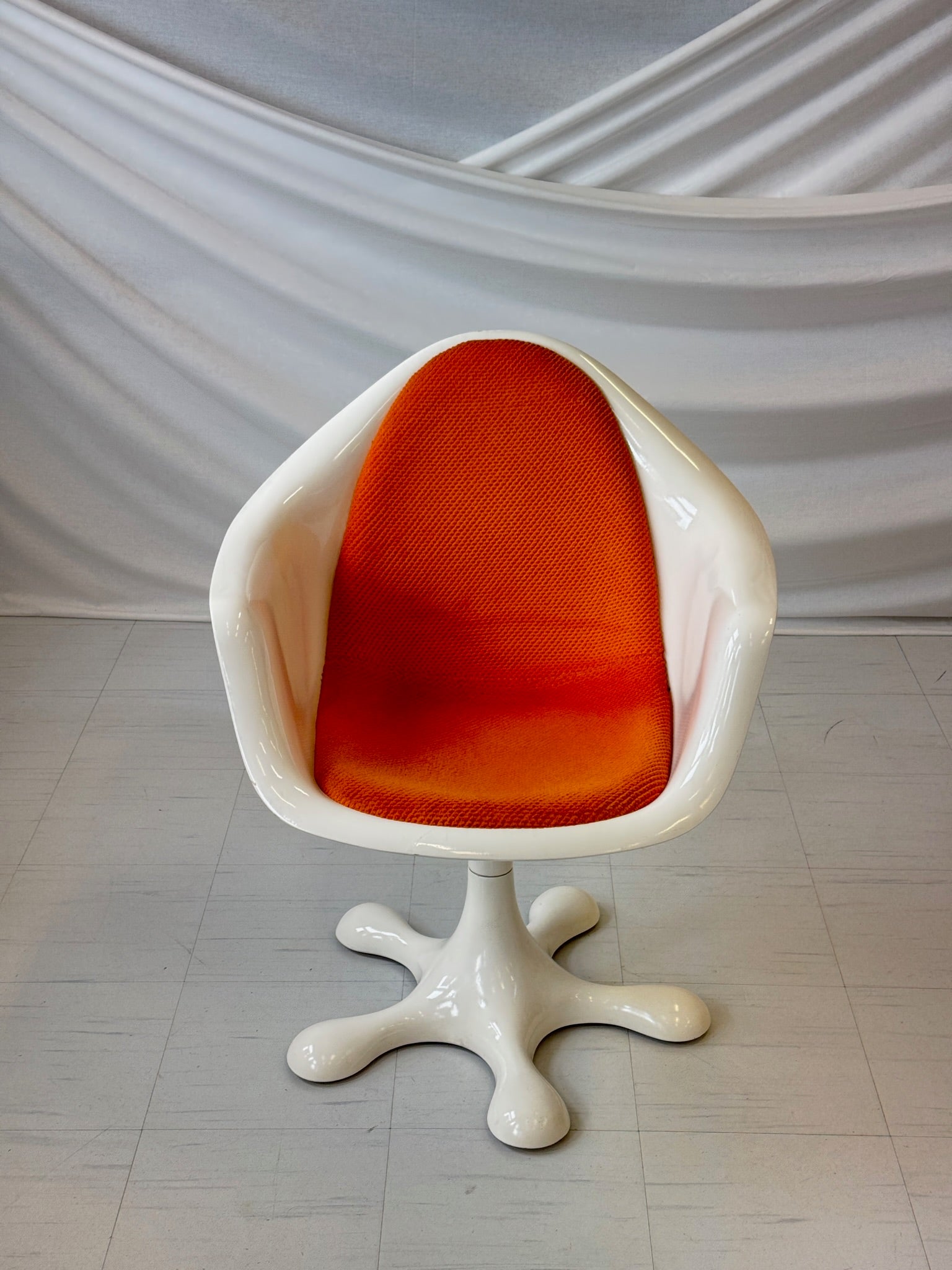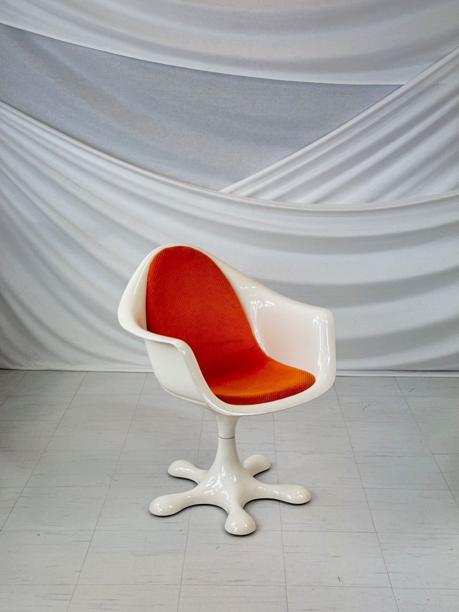 各チェアは、光沢のある白いプラスチック/ファイバーグラスのシェルと、特徴的な5つ星のオーガニックベース、そして滑らかなフレームに映える鮮やかなオレンジ色のファブリック張りが特徴です。スムーズに回転し、驚くほど人間工学に基づいた設計のため、ダイニングチェア、アクセントチェア、あるいは印象的なデザインが求められるクリエイティブなインテリアに最適です。