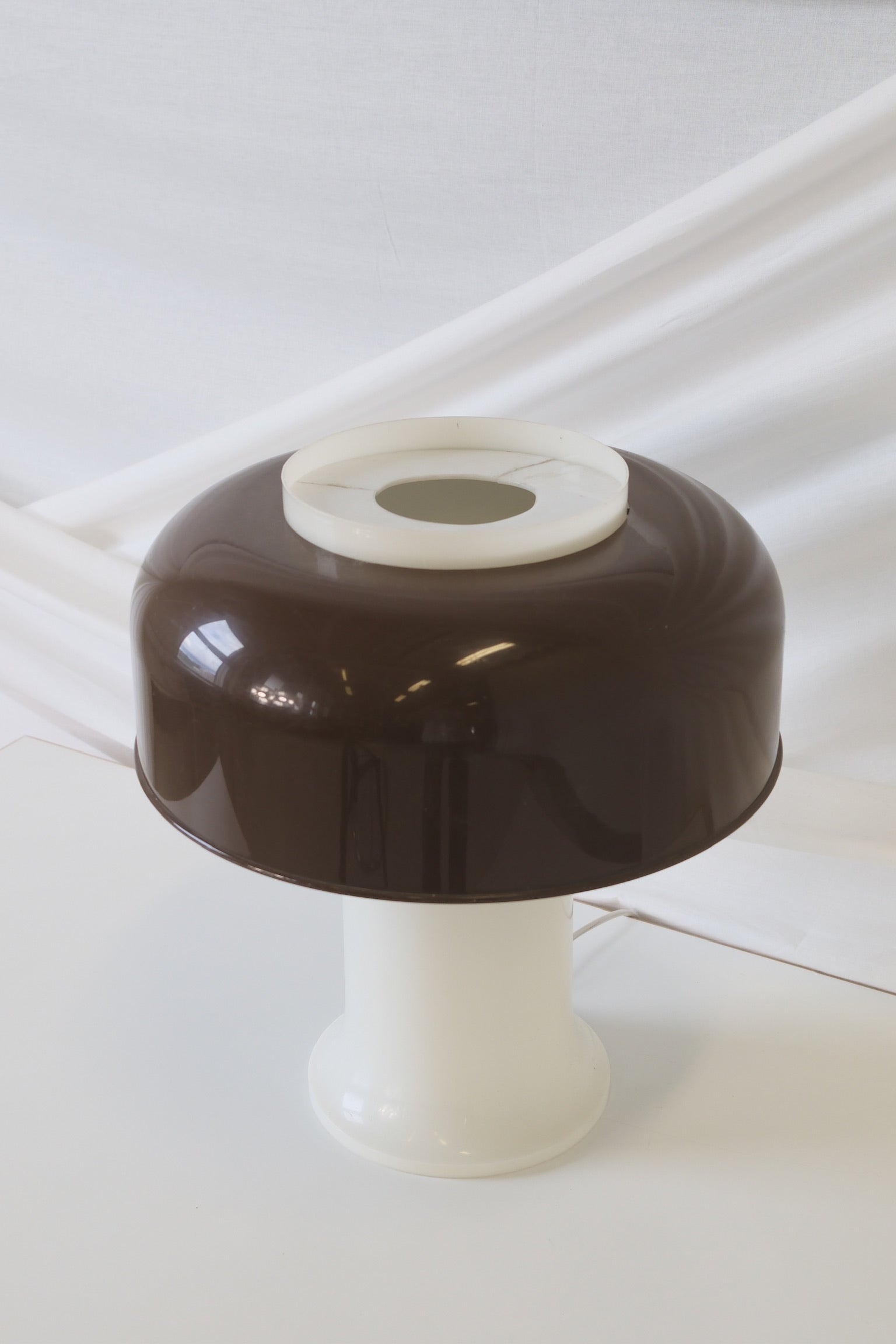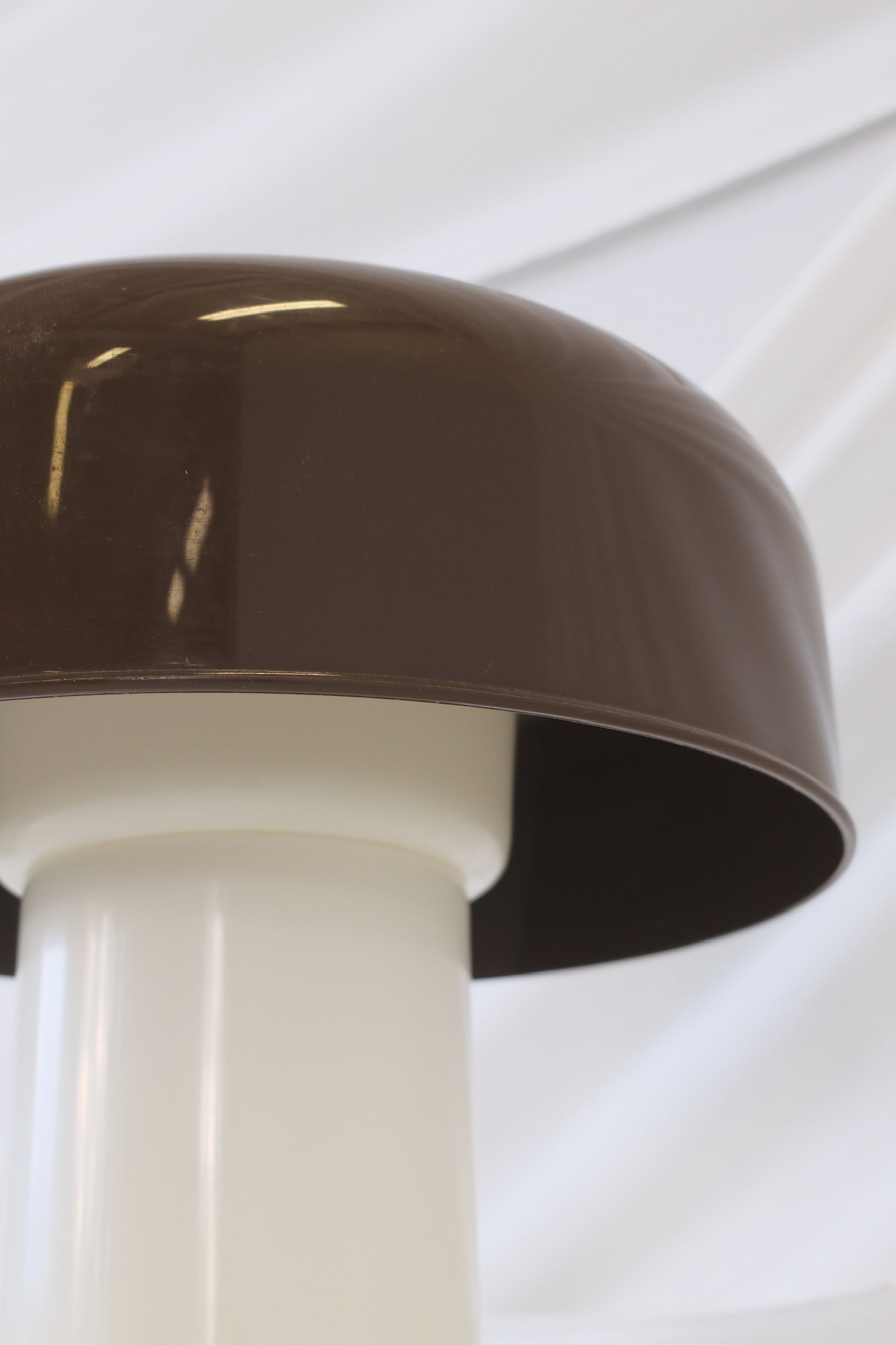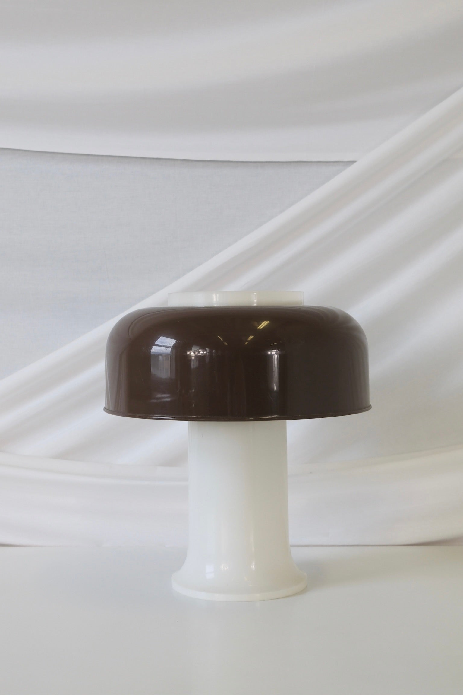 1970年代にスウェーデンのFagerhults社で製造されたこのヴィンテージのスペースエイジ・テーブルランプは、当時の遊び心と機能性を兼ね備えた美しいデザインです。光沢のあるブラウンのプラスチックドームと白い円筒形のベースが特徴で、クリーンで未来的なシルエットはミニマルでありながら大胆さも兼ね備えています。まさにスカンジナビアデザインの真髄と言えるでしょう。