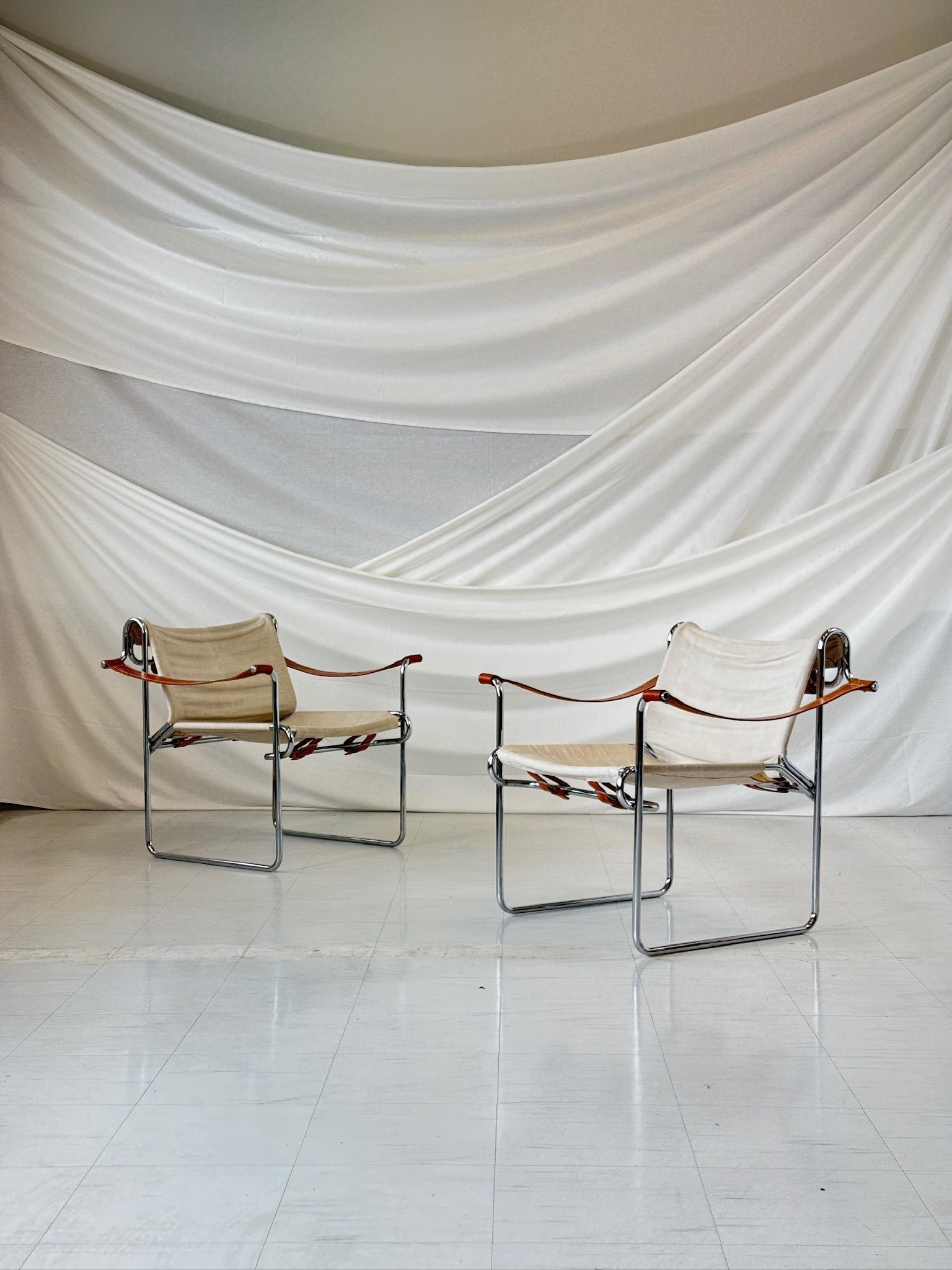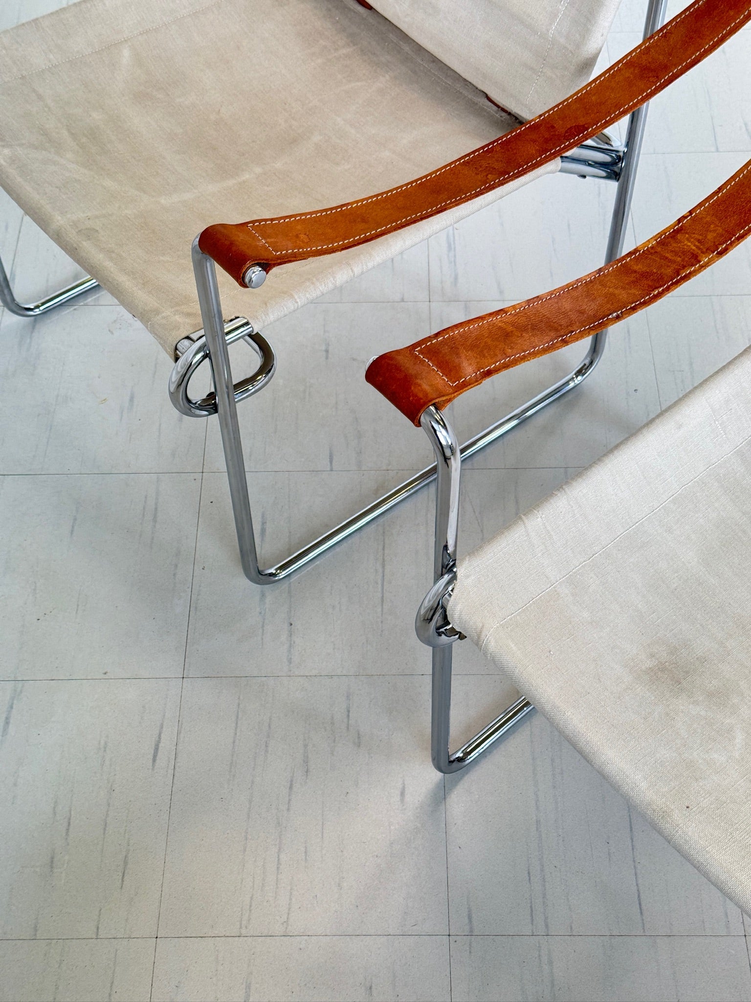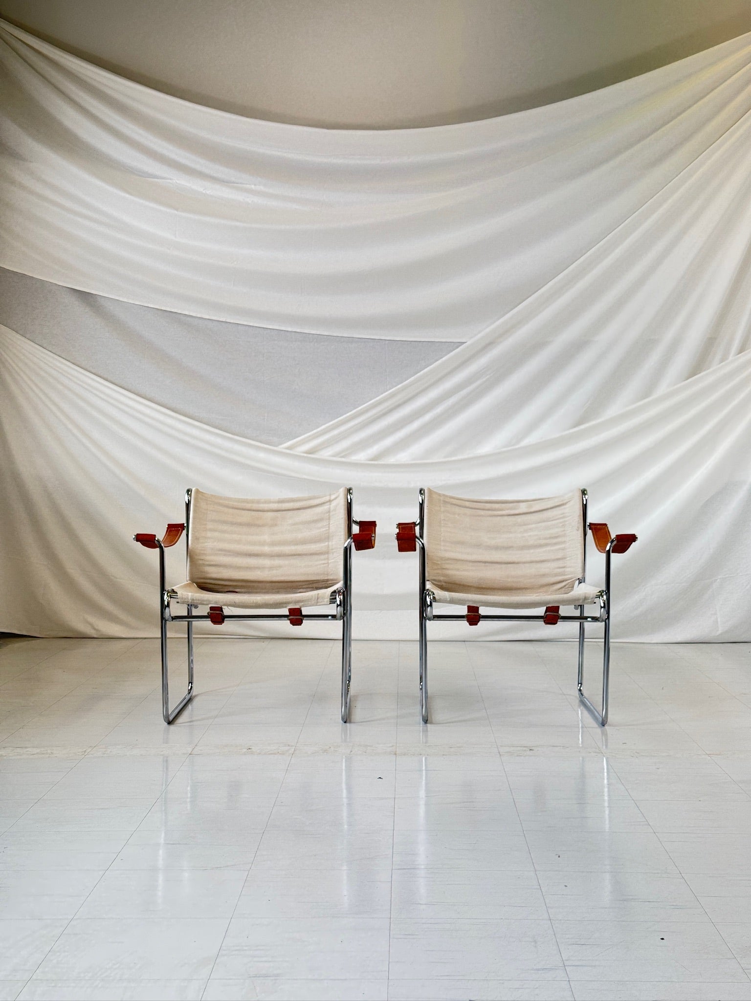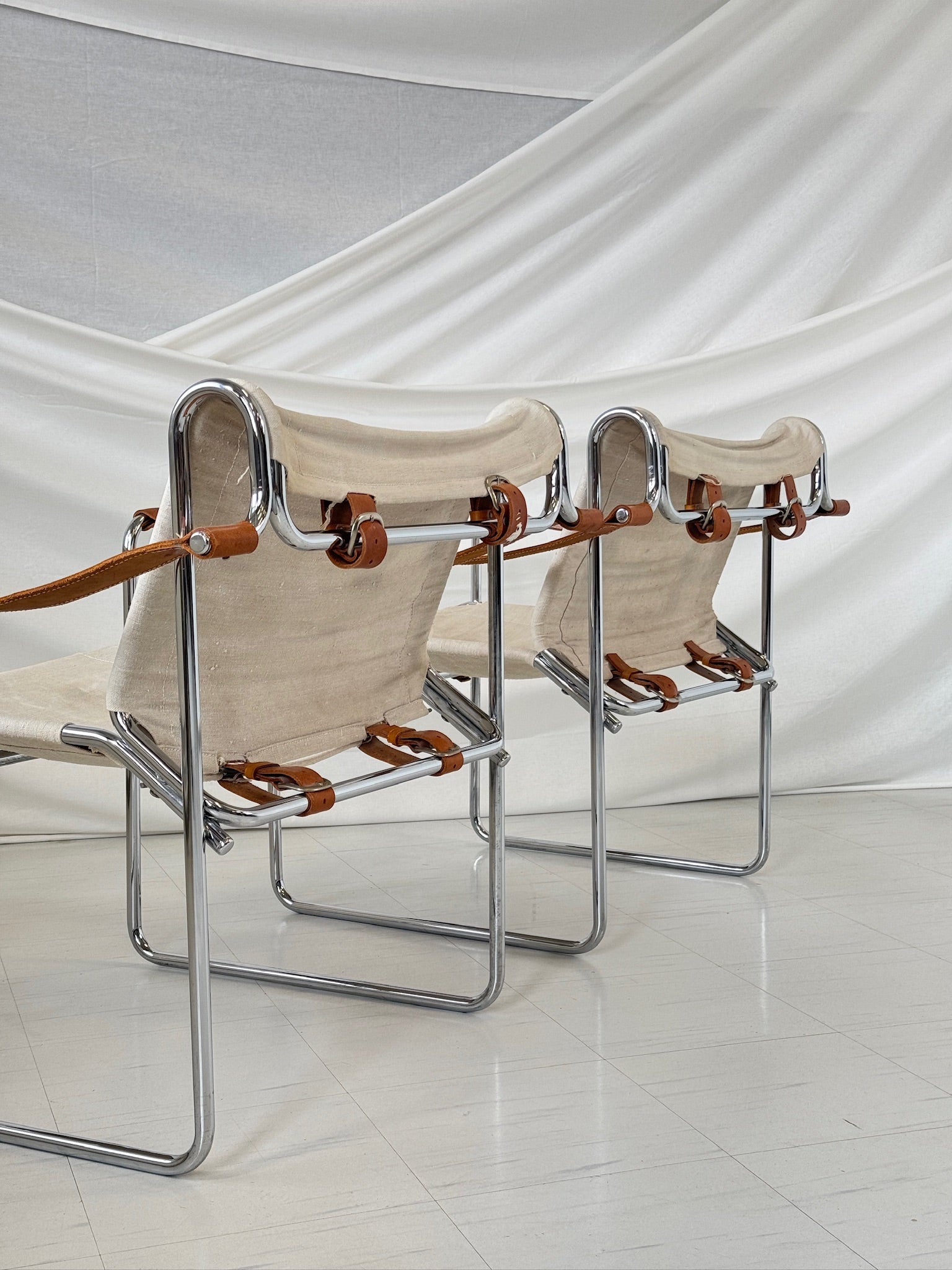 このペアはヴィンテージとして良好なコンディションです。リネン生地には多少の摩耗と経年による自然な風合いが見られますが、無傷できれいな状態を保っています。クロームフレームは構造的に堅牢で、表面にわずかな傷があるのみです。詳細については、詳細な写真をご請求ください。