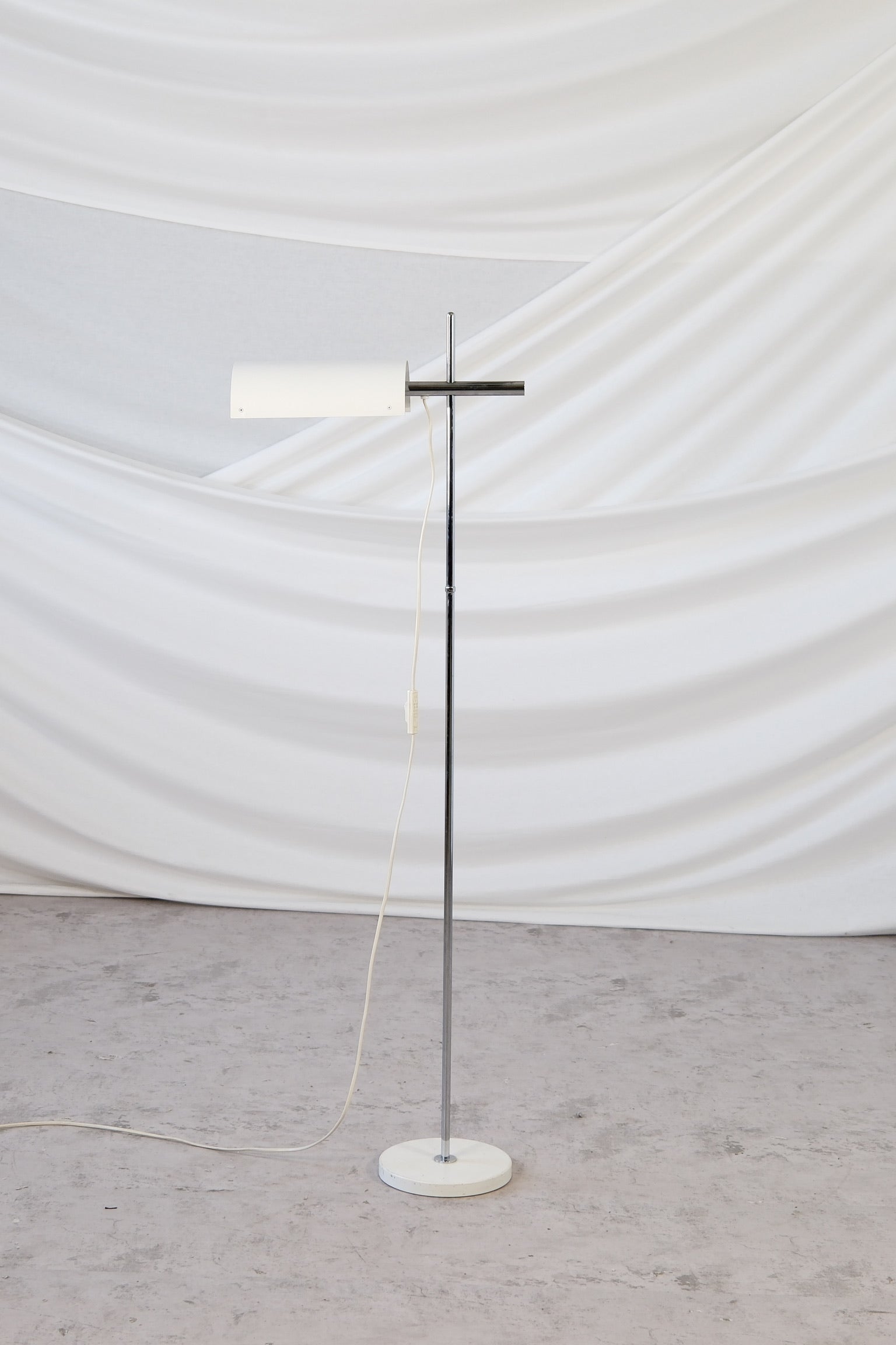 Designed by Ben af Schultén for Artek, this minimalist floor lamp embodies the refined functionality of Finnish modern design. With its clean lines, white lacquered shade, and chrome-plated steel frame, the lamp provides a balanced, adjustable light ideal for reading or accent lighting.