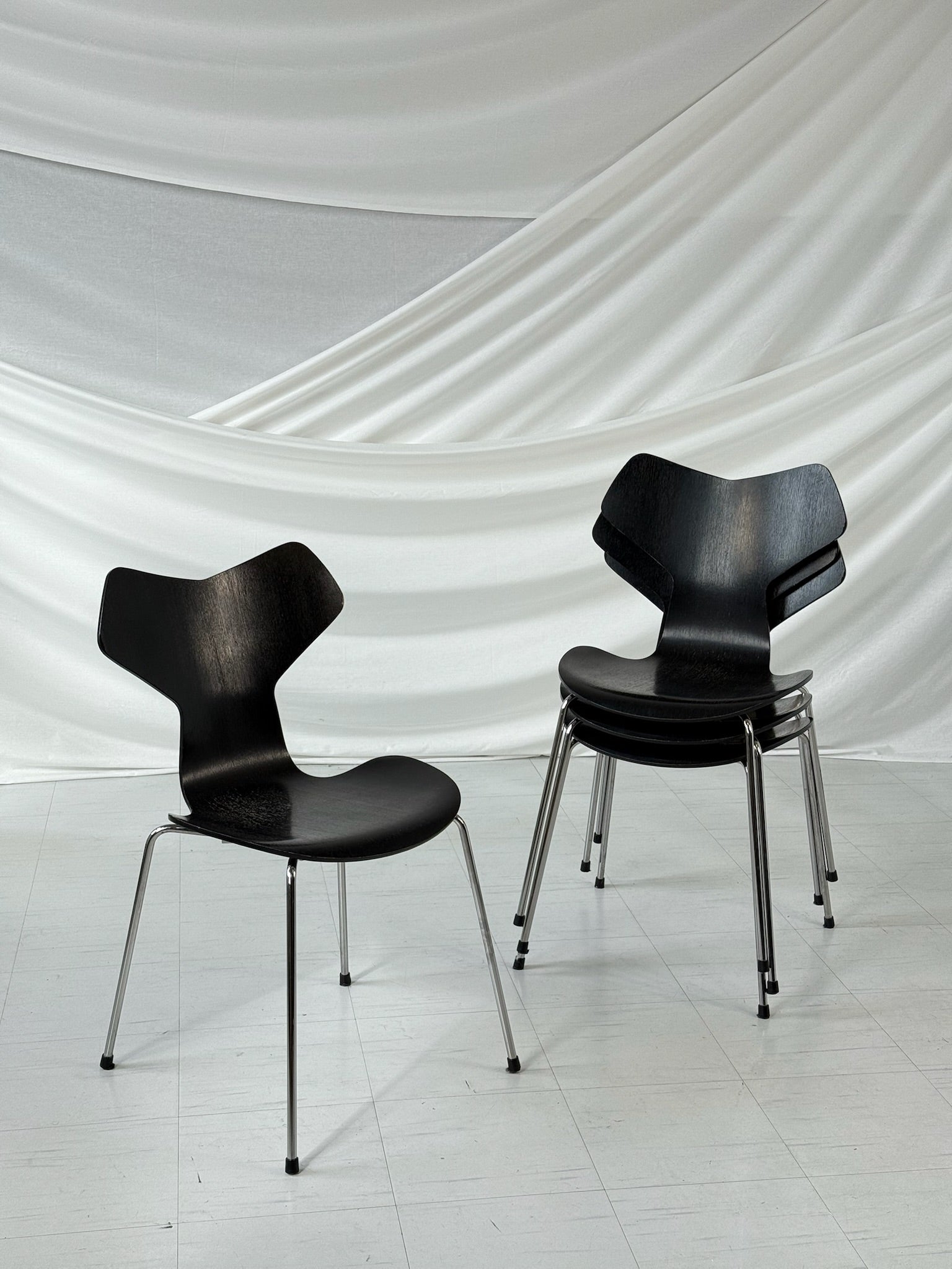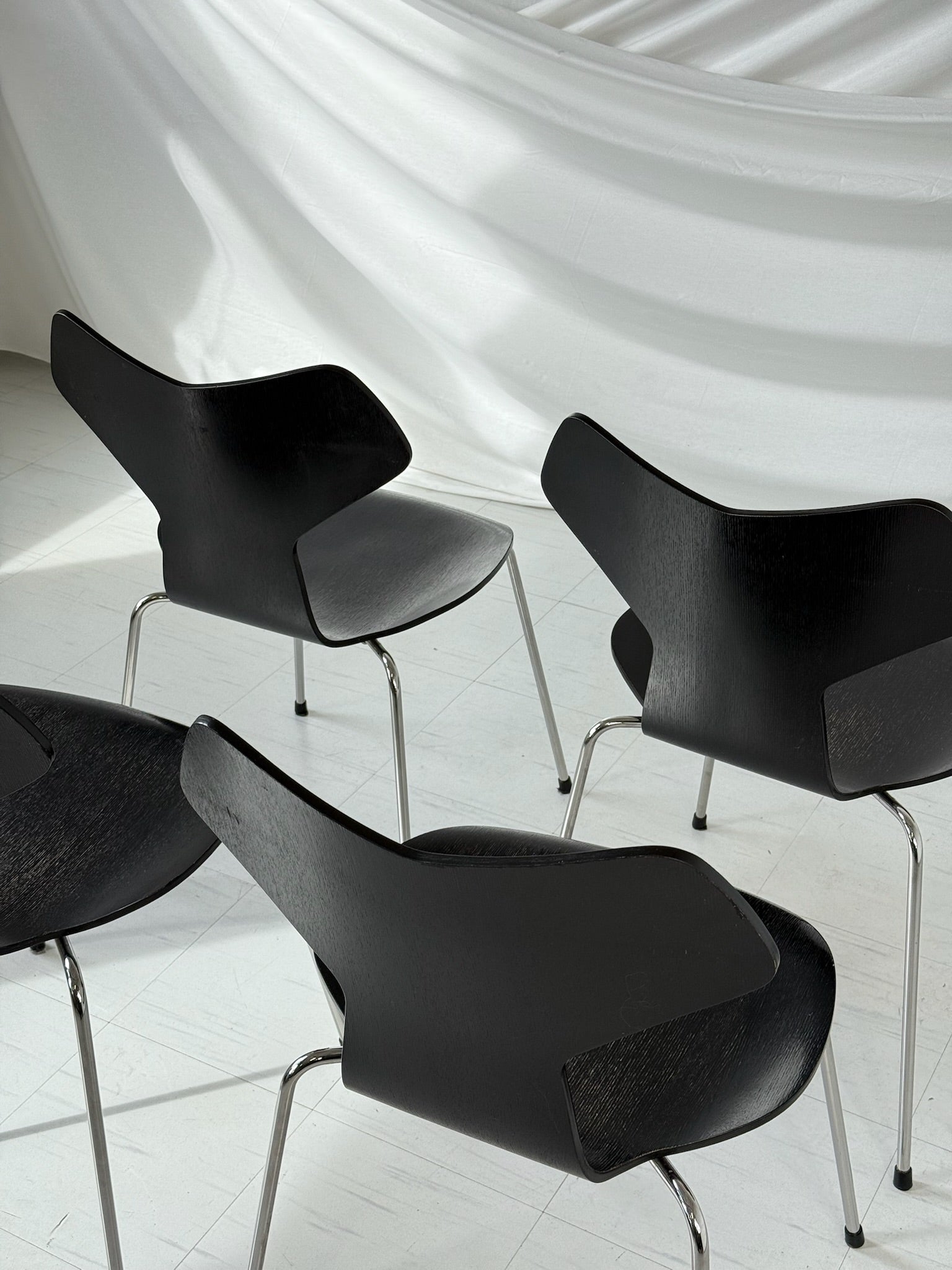 1957年にアルネ・ヤコブセンによってデザインされたグランプリチェアは、彫刻的な優雅さと日常的な機能性を融合させたデンマークデザインのアイコンです。このセットは、グランプリの特徴的なシルエットを大胆なブラックウッド仕上げで表現し、時代を超えた名作を現代的に解釈しています。