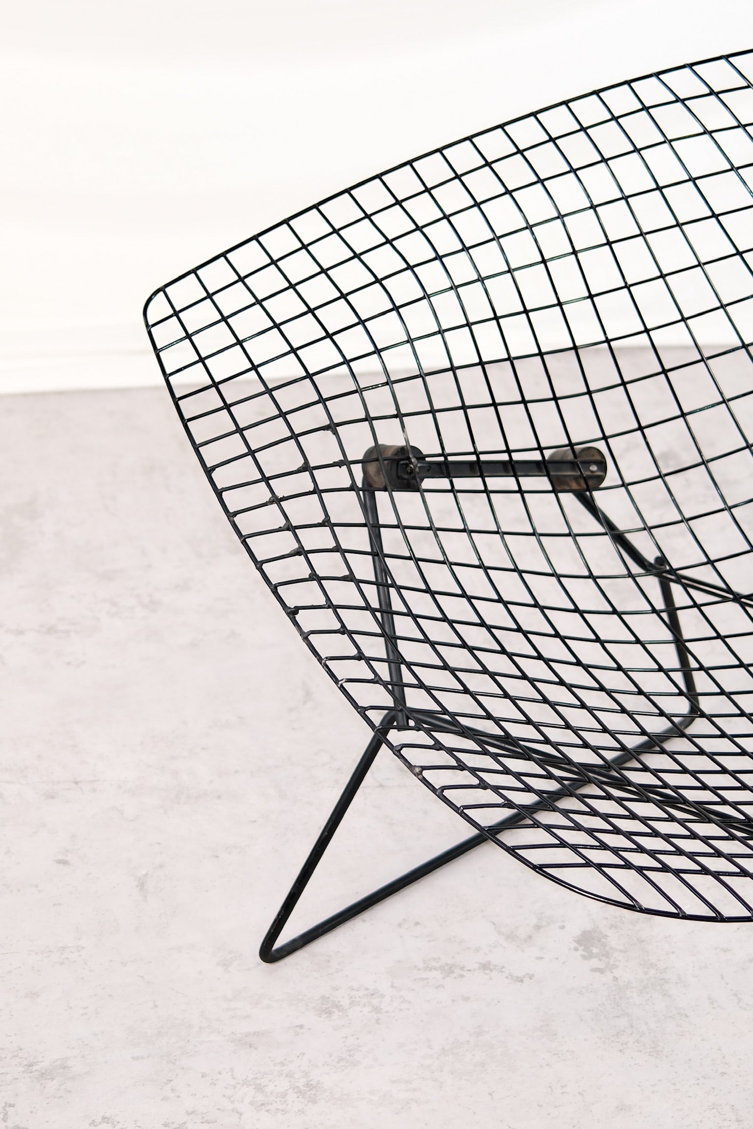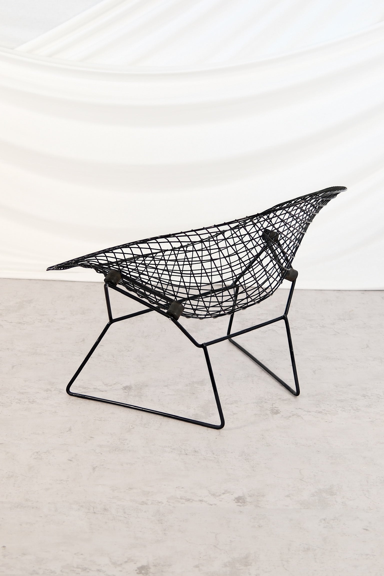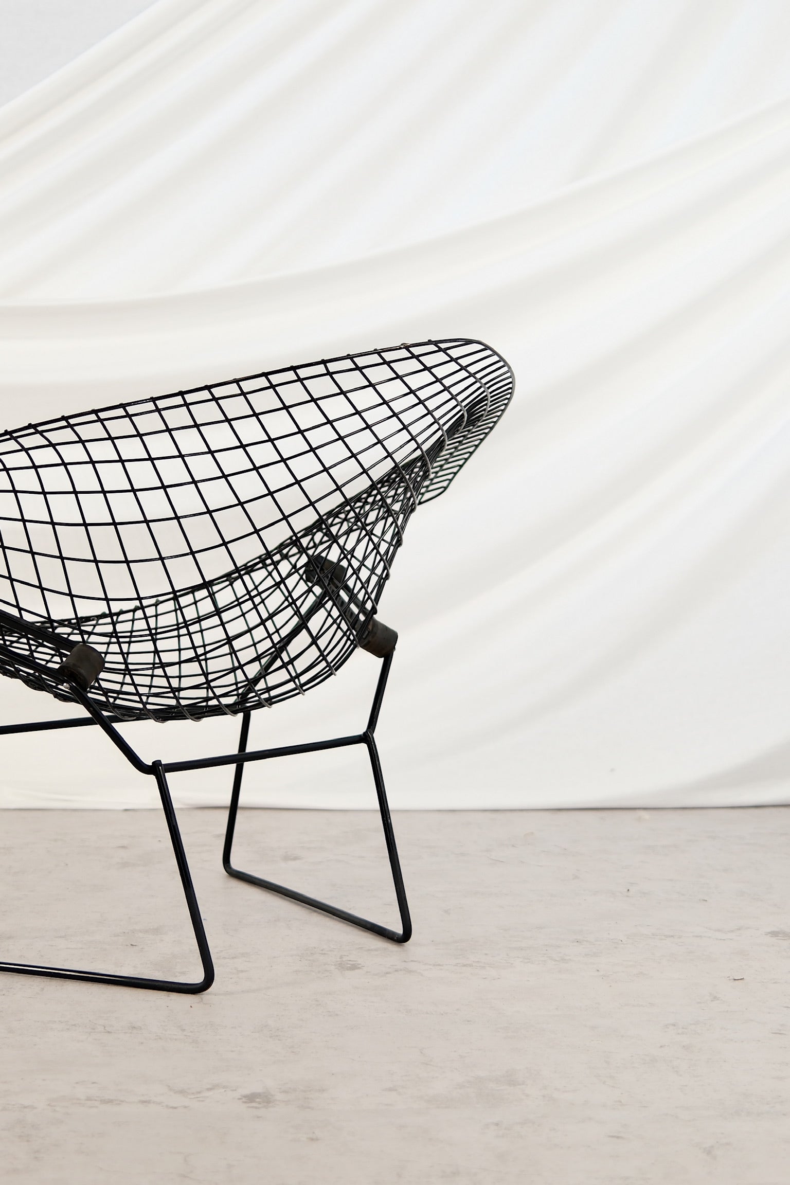 This example comes in black lacquered steel and features original rubber shock mounts, which make the seat flexible and significantly more comfortable compared to the standard Diamond Chair. Designed to be used with or without upholstery, the chair works beautifully as a statement piece in living rooms, studios, or modern interiors.