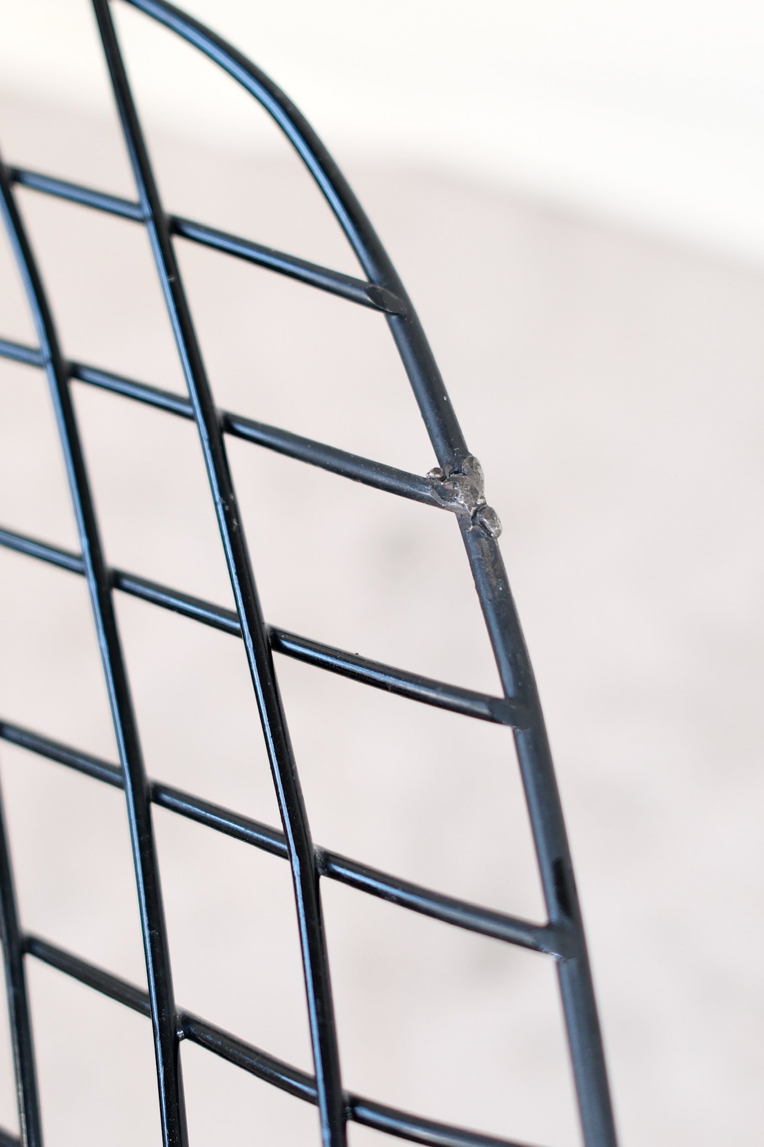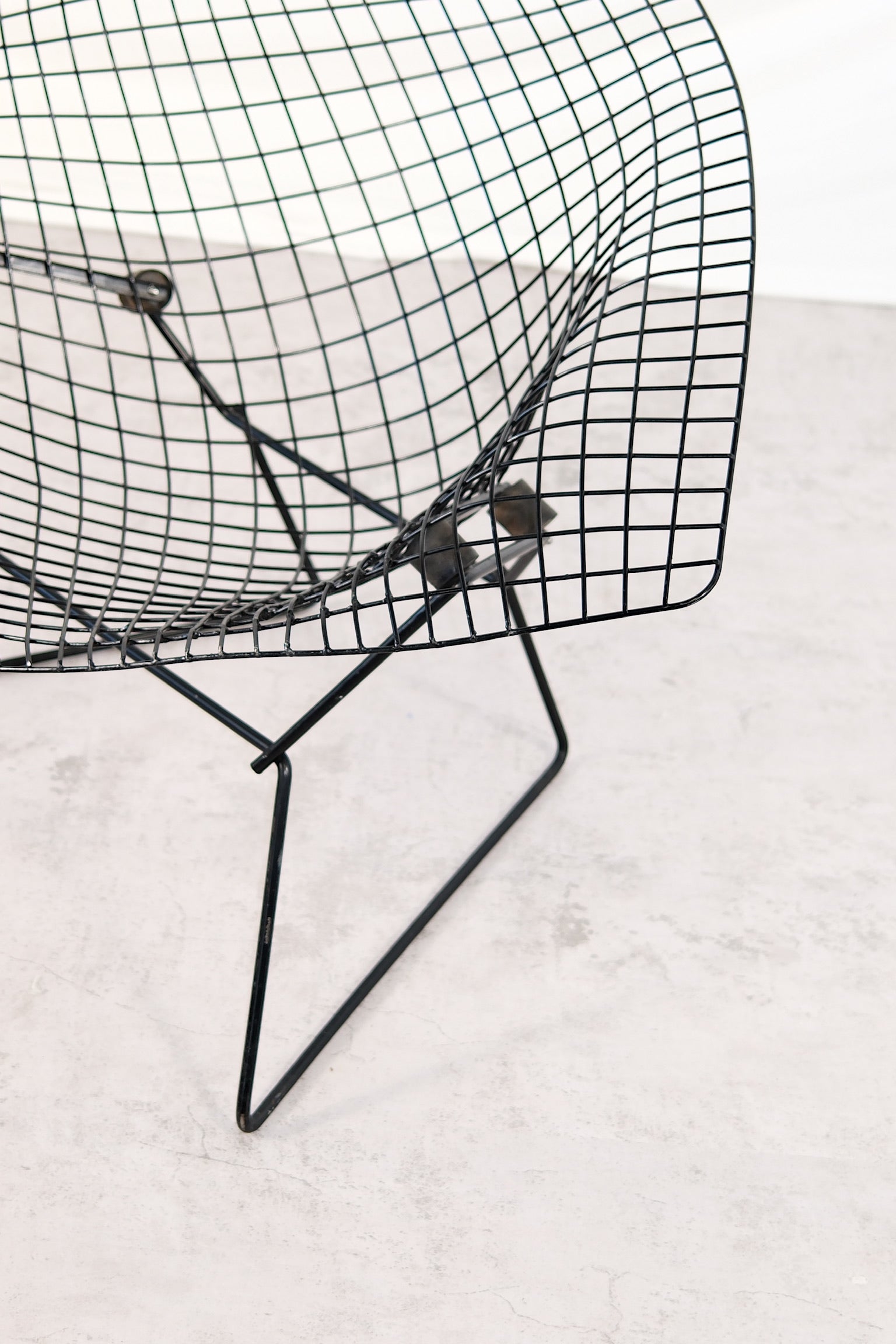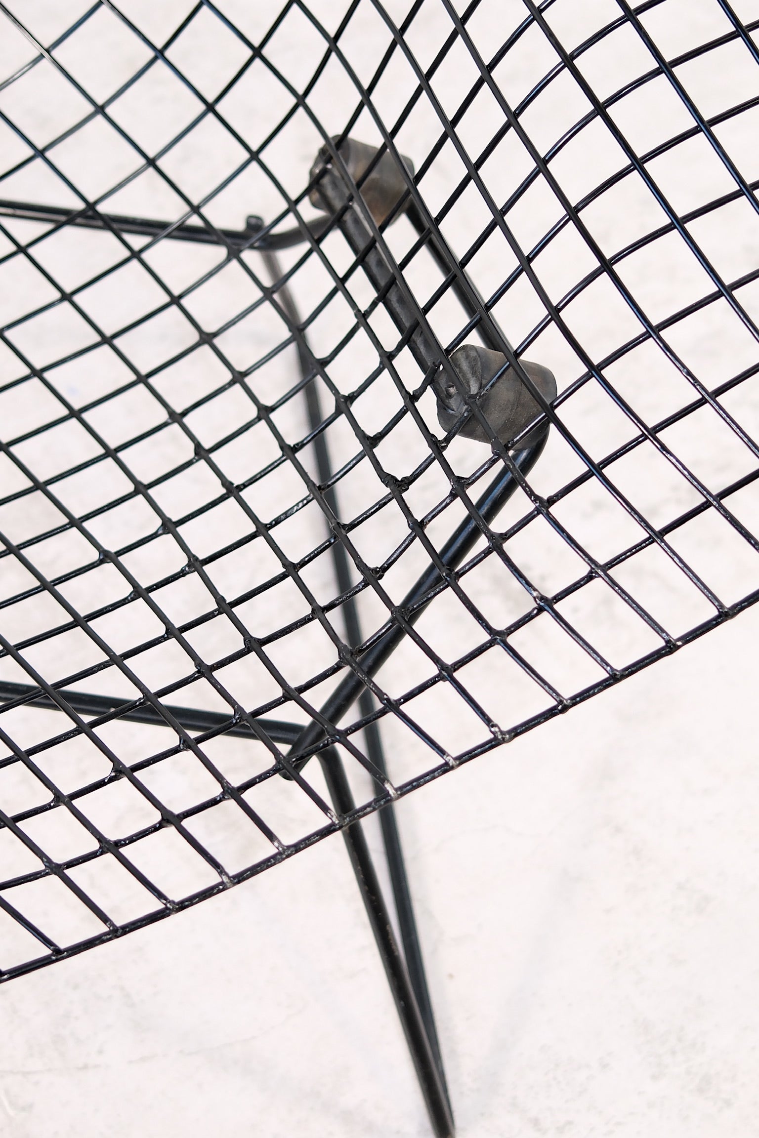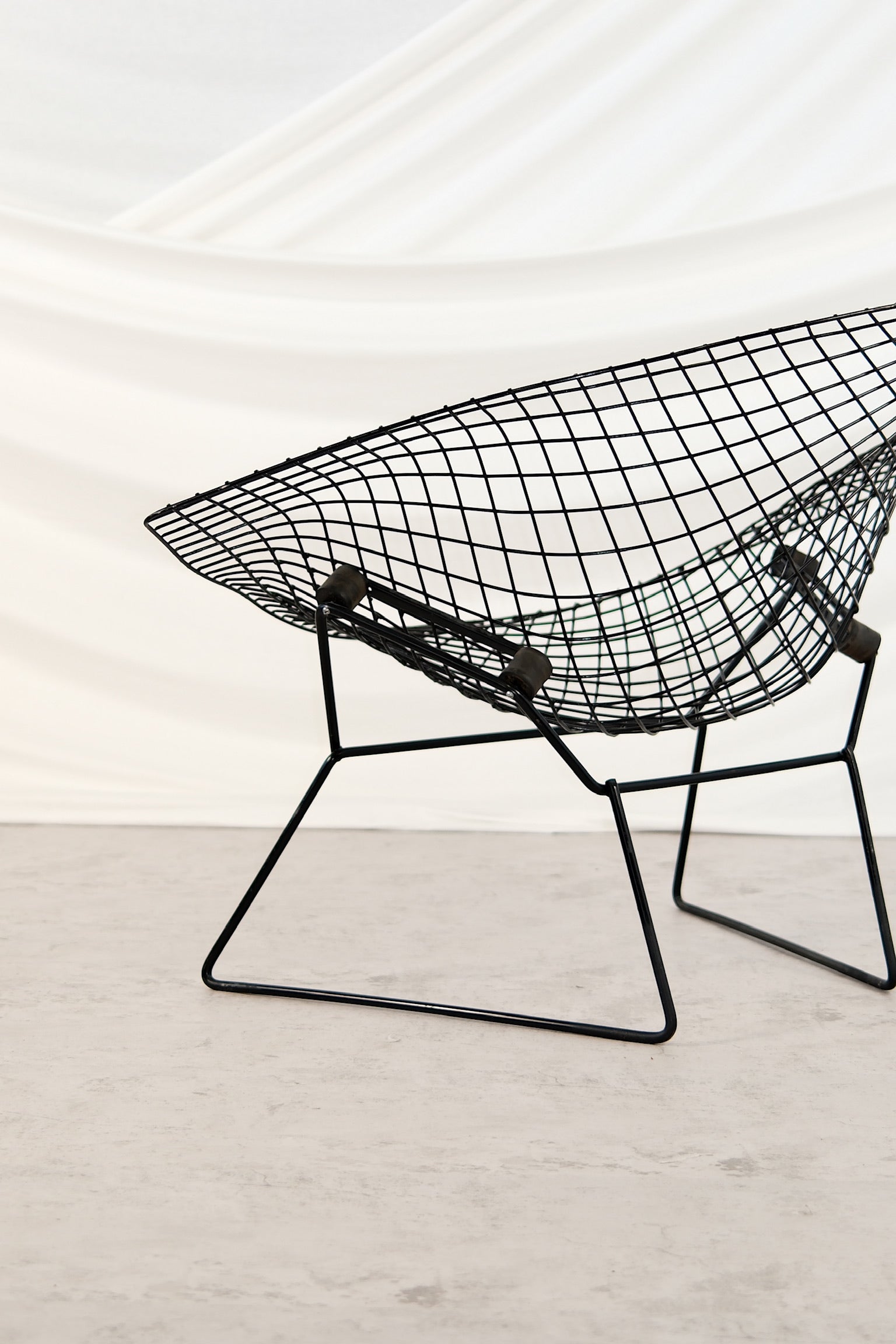 This example comes in black lacquered steel and features original rubber shock mounts, which make the seat flexible and significantly more comfortable compared to the standard Diamond Chair. Designed to be used with or without upholstery, the chair works beautifully as a statement piece in living rooms, studios, or modern interiors.