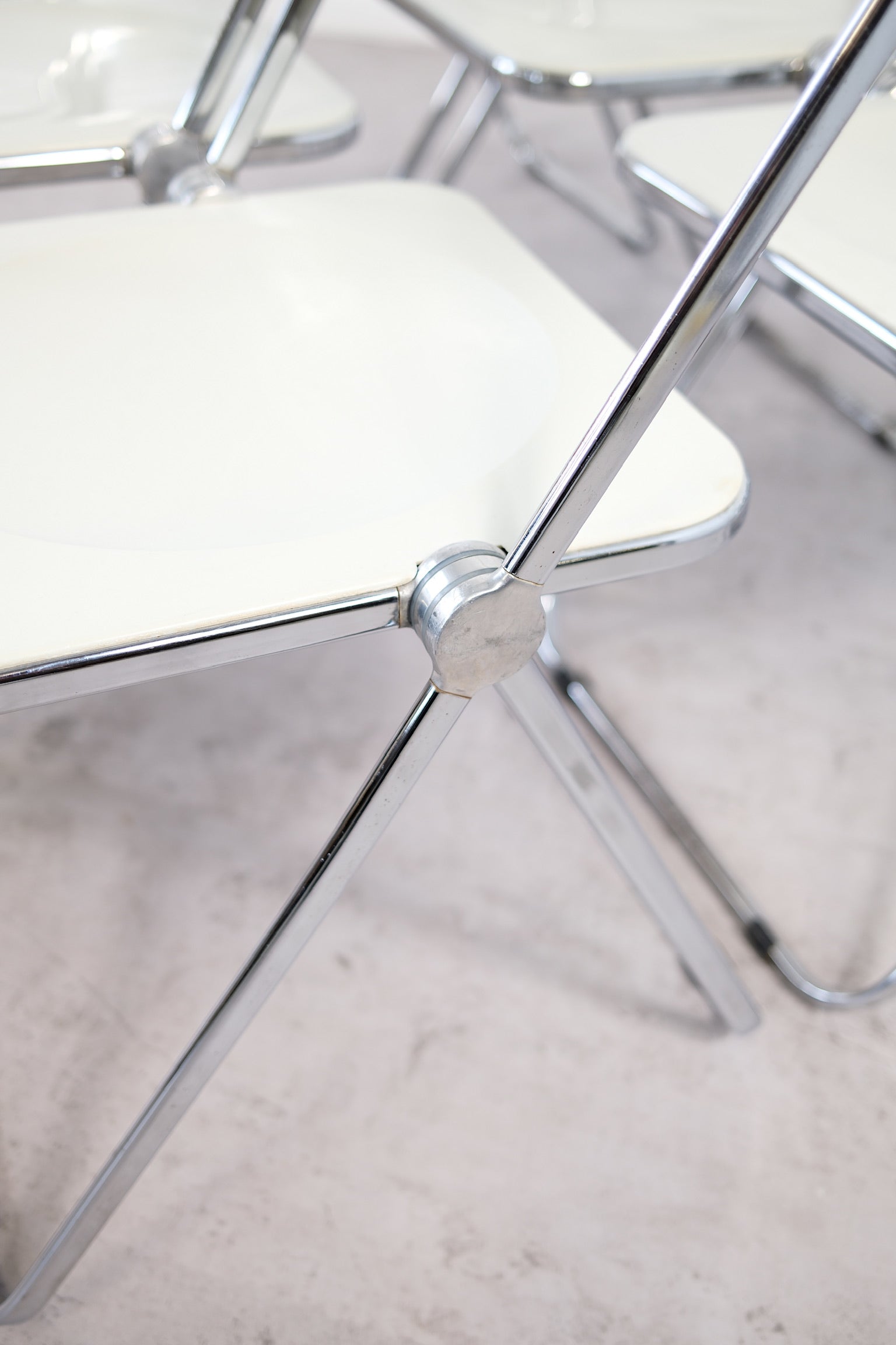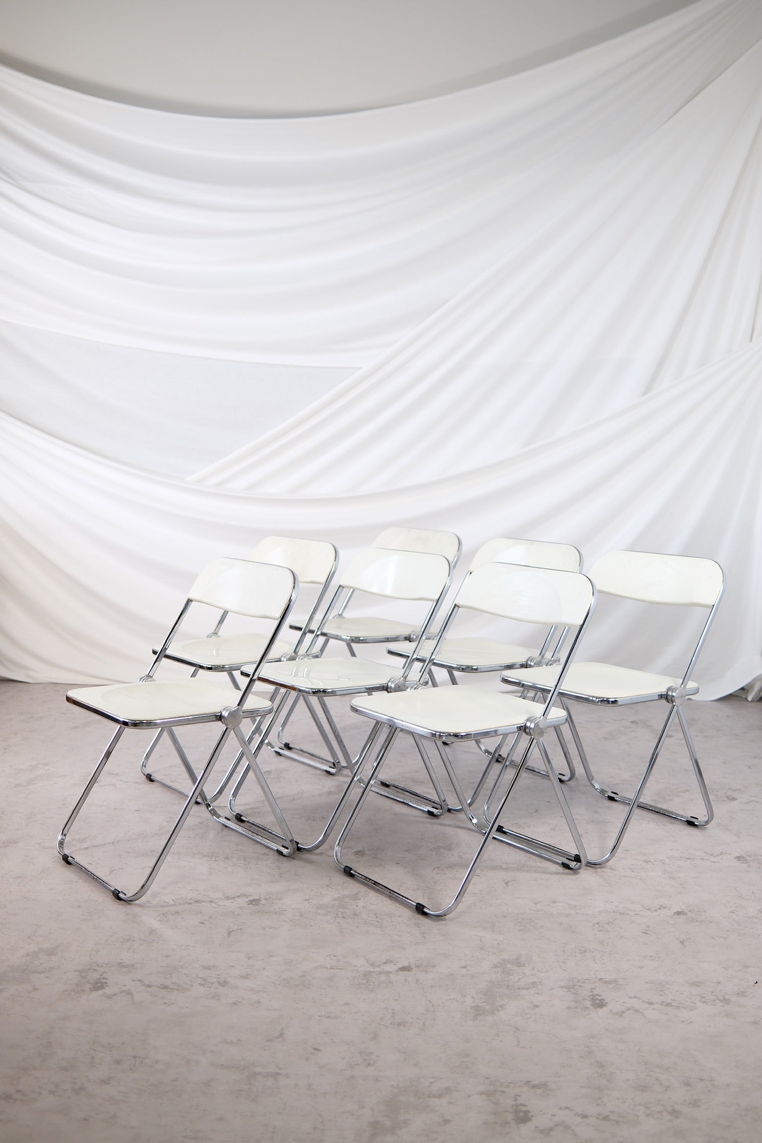 各チェアは、鮮やかなクローム仕上げのチューブラーフレームと白いプラスチック製の座面と背もたれを備え、まさに「プラスチックの新時代」を象徴する存在です。このデザインの真髄は、革新的な3枚板ヒンジ機構にあります。この機構により、エレガントなフォルムを損なうことなく、驚くほどスリムに折りたたむことができ、収納も容易です。