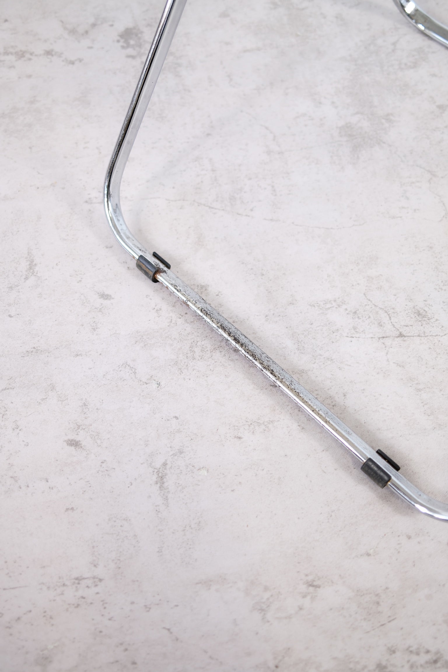 この7脚の椅子セットは、年代相応の良好なヴィンテージコンディションです。美しい本物の古色とクロームフレームの若干の腐食など、経年による使用感はありますが、独特の風合いが、その真正さと歴史を物語っています。プラスチックの表面にわずかな傷と微妙な変色が見られます。折りたたみ機構は完全に機能します。詳細については、詳細な写真をご請求ください。