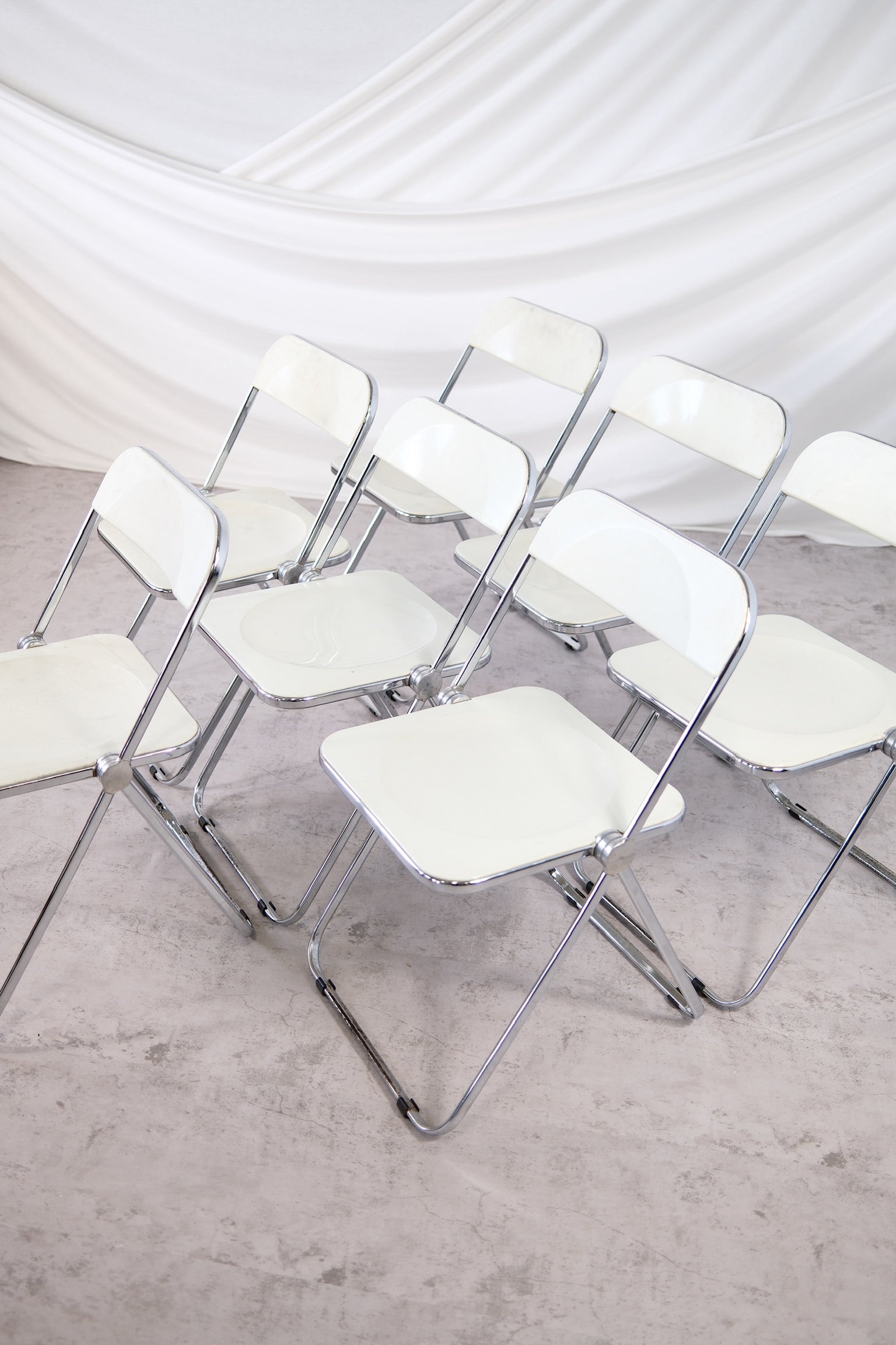ジャンカルロ・ピレッティが1970年代にアノニマ・カステッリのためにデザインした、象徴的なプリア折りたたみ椅子7脚の印象的なセット。洗練されたミニマリズムと革新的なエンジニアリングの完璧な調和を体現した、イタリアンデザインの真に傑作と言えるでしょう。