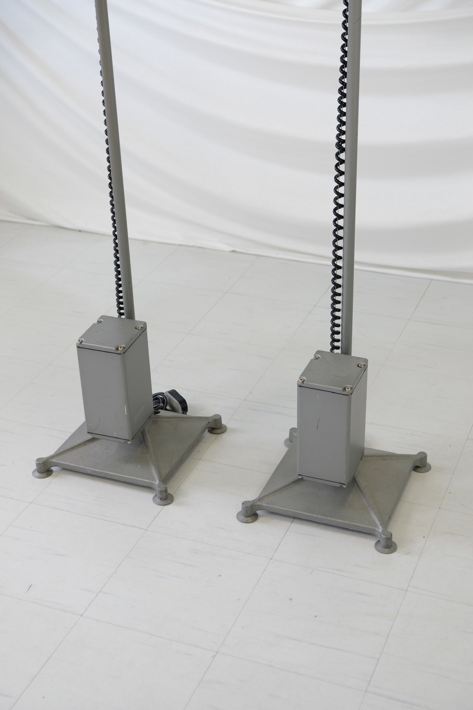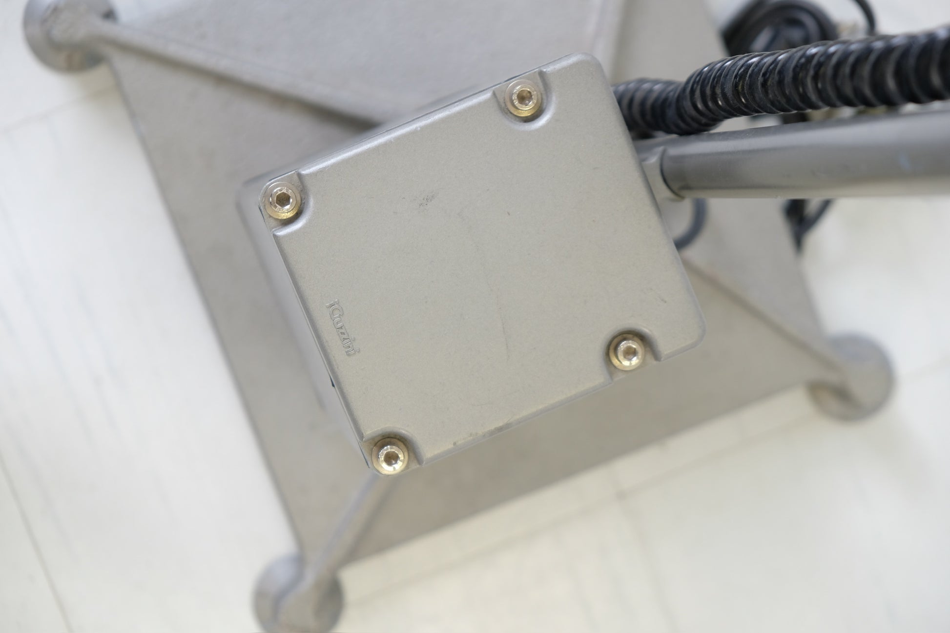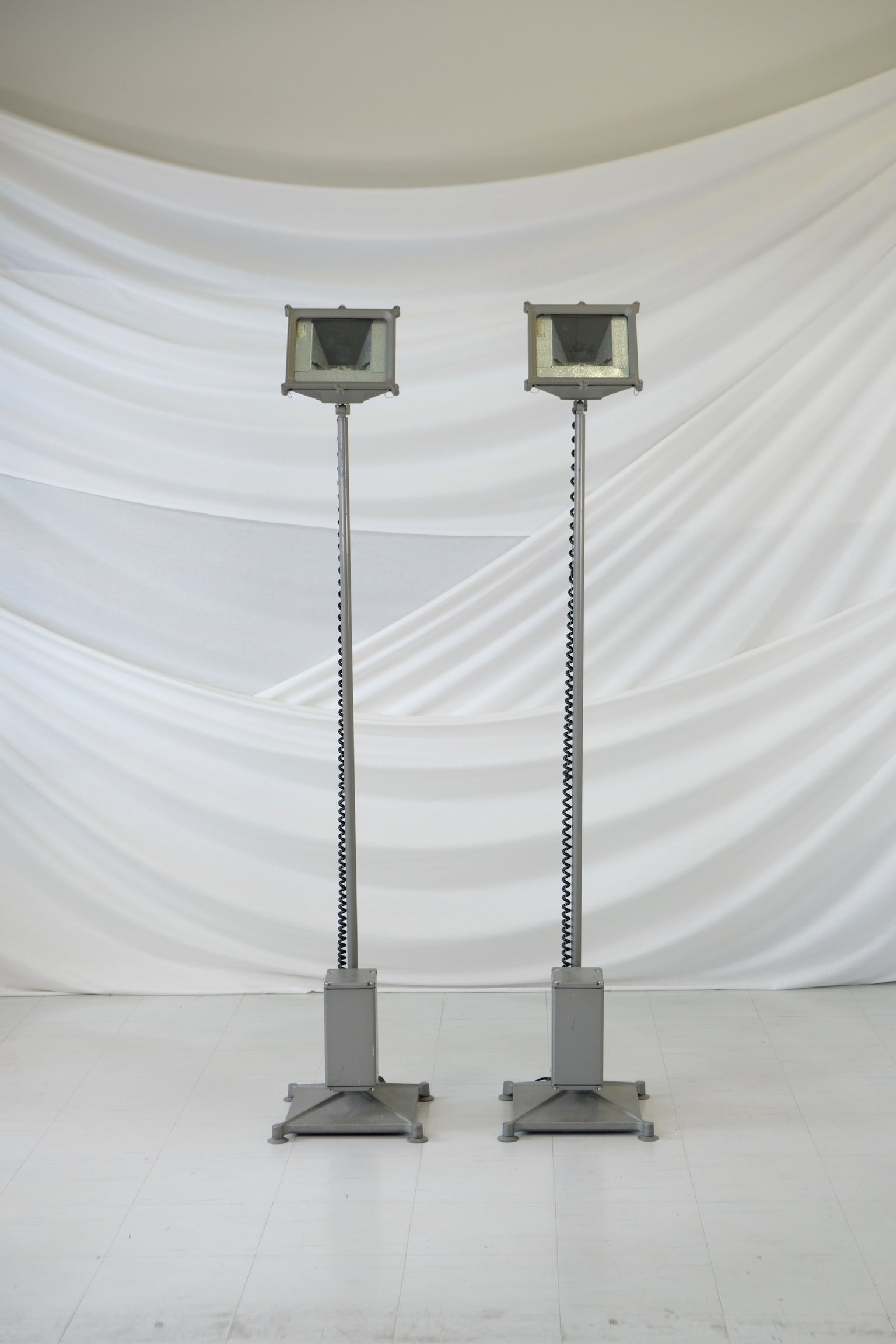 堅牢な投光照明スタイルのランプは、重厚な鋳物製ベース、調整可能な四角いリフレクター、そしてステムに沿って施されたコイル状のケーブルが特徴です。元々は工業用または建築用にデザインされましたが、今では大胆な彫刻作品として、ロフトスタイルのインテリア、ギャラリー、あるいはデザイン重視の空間にも最適です。