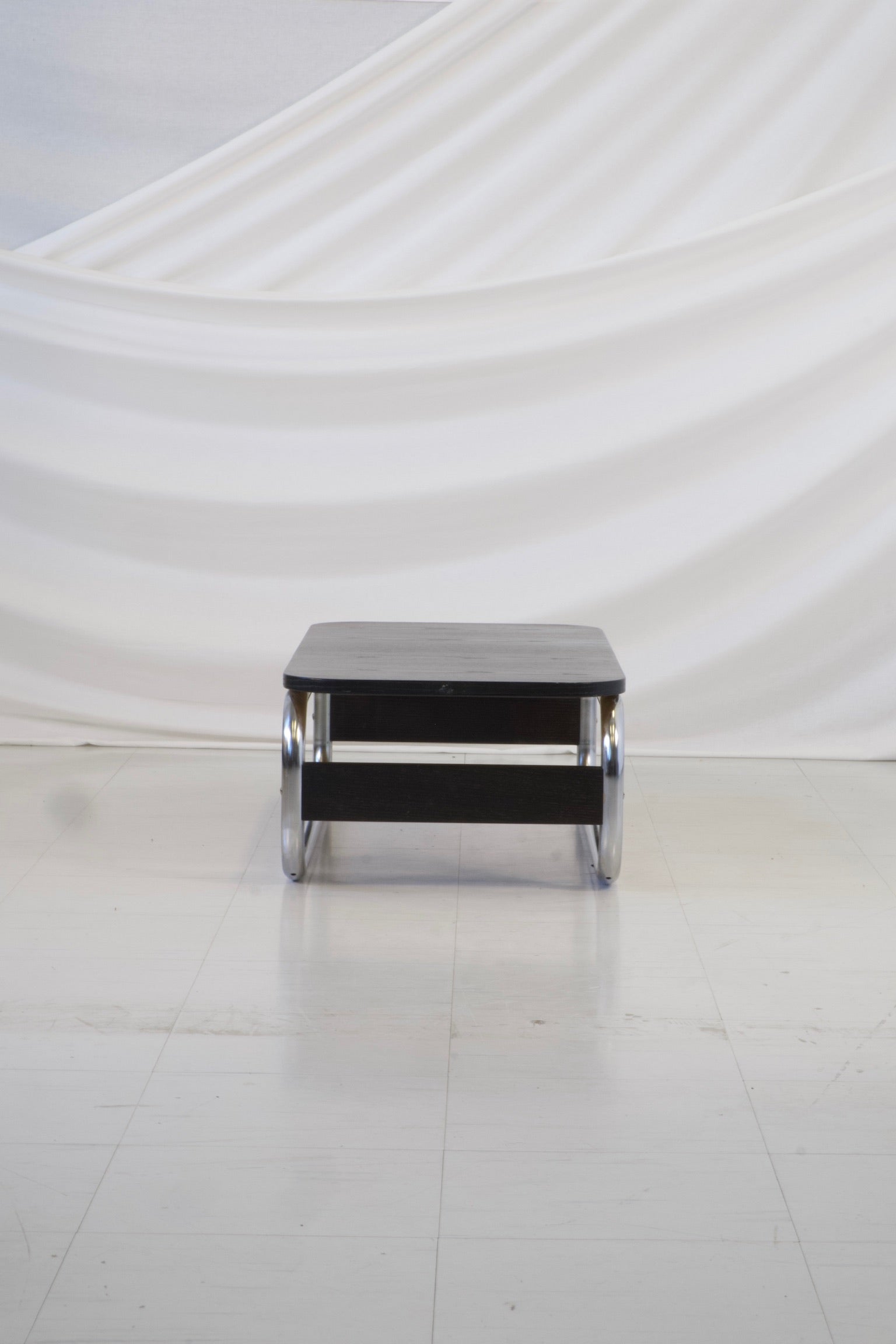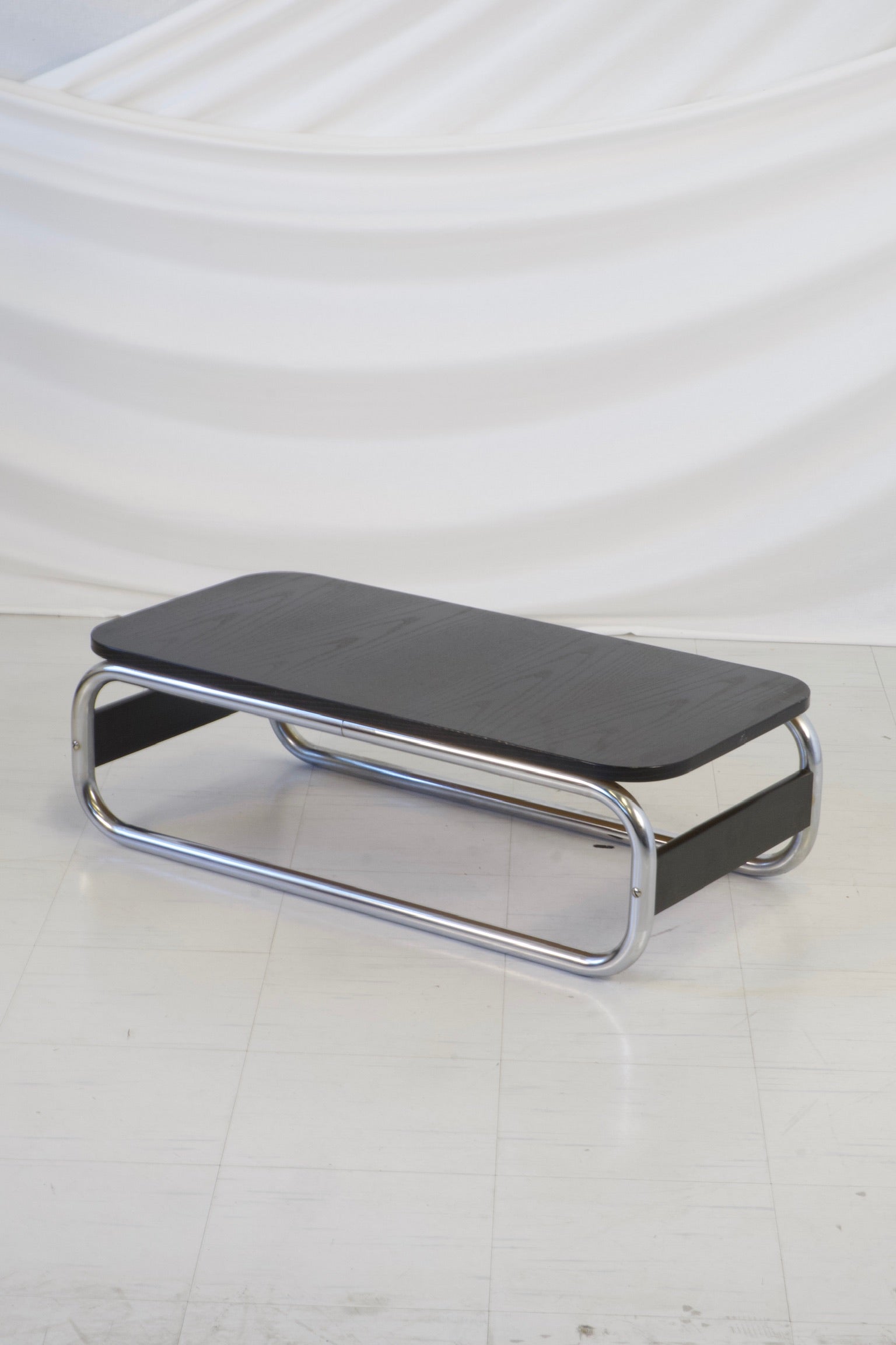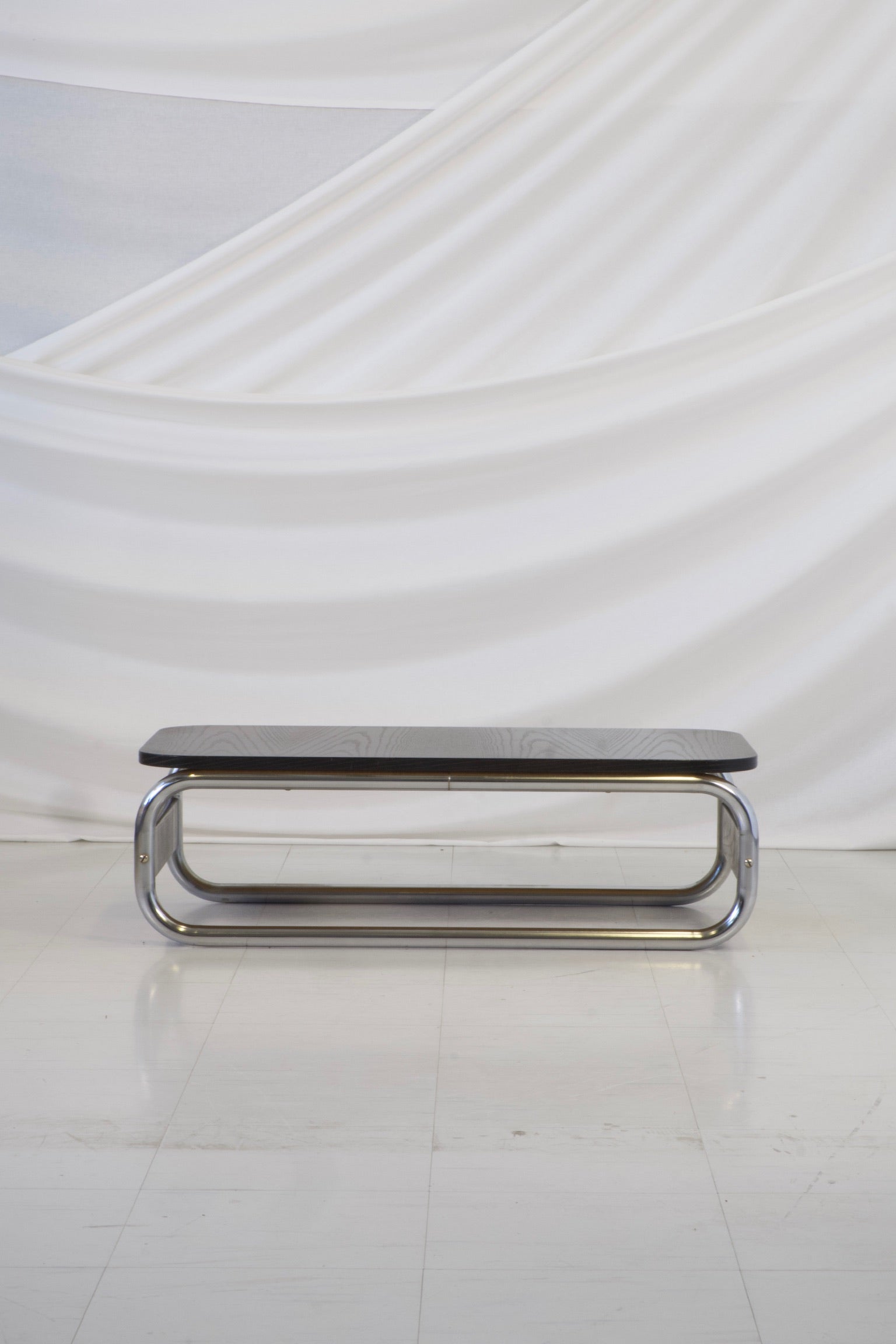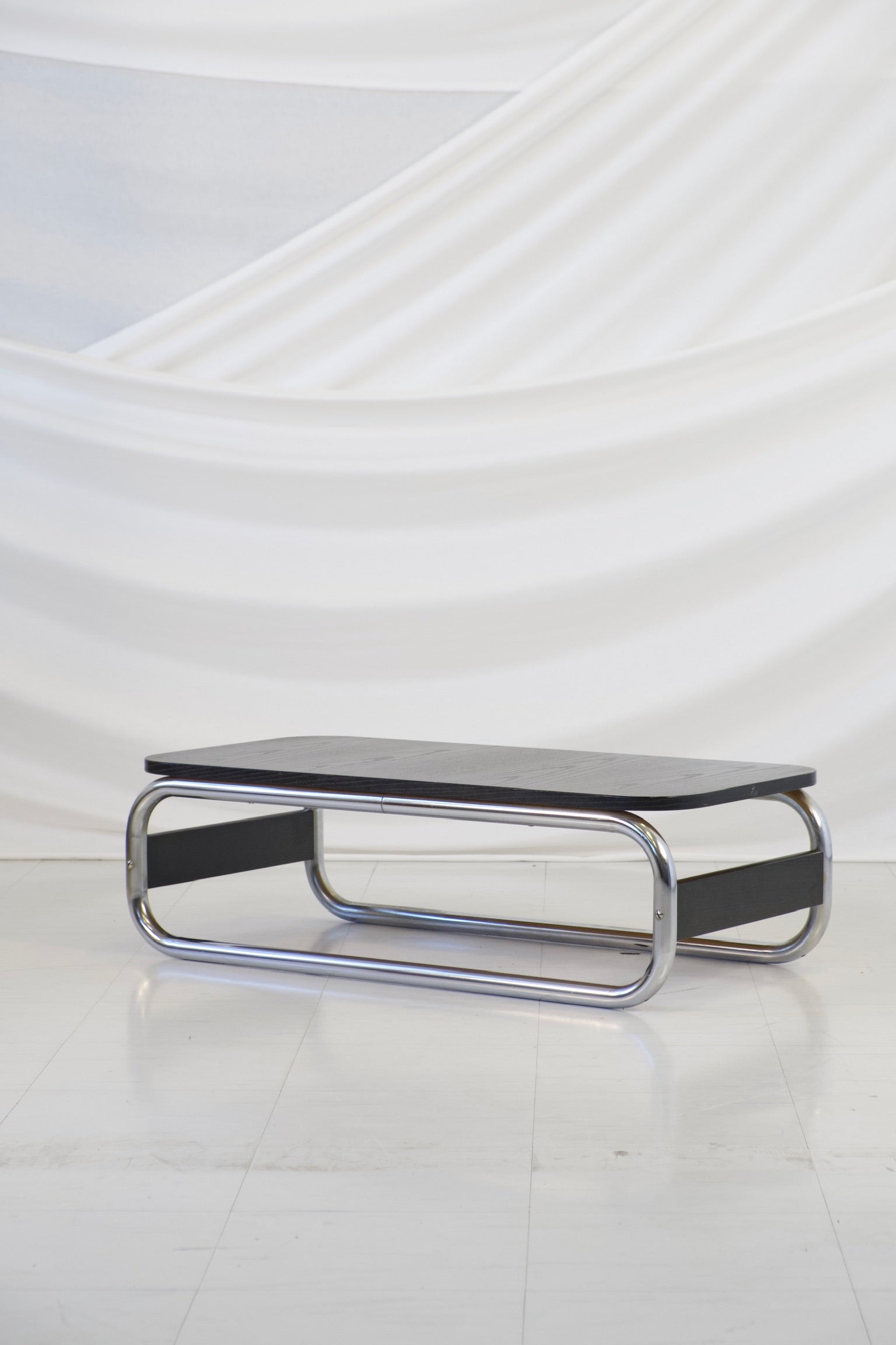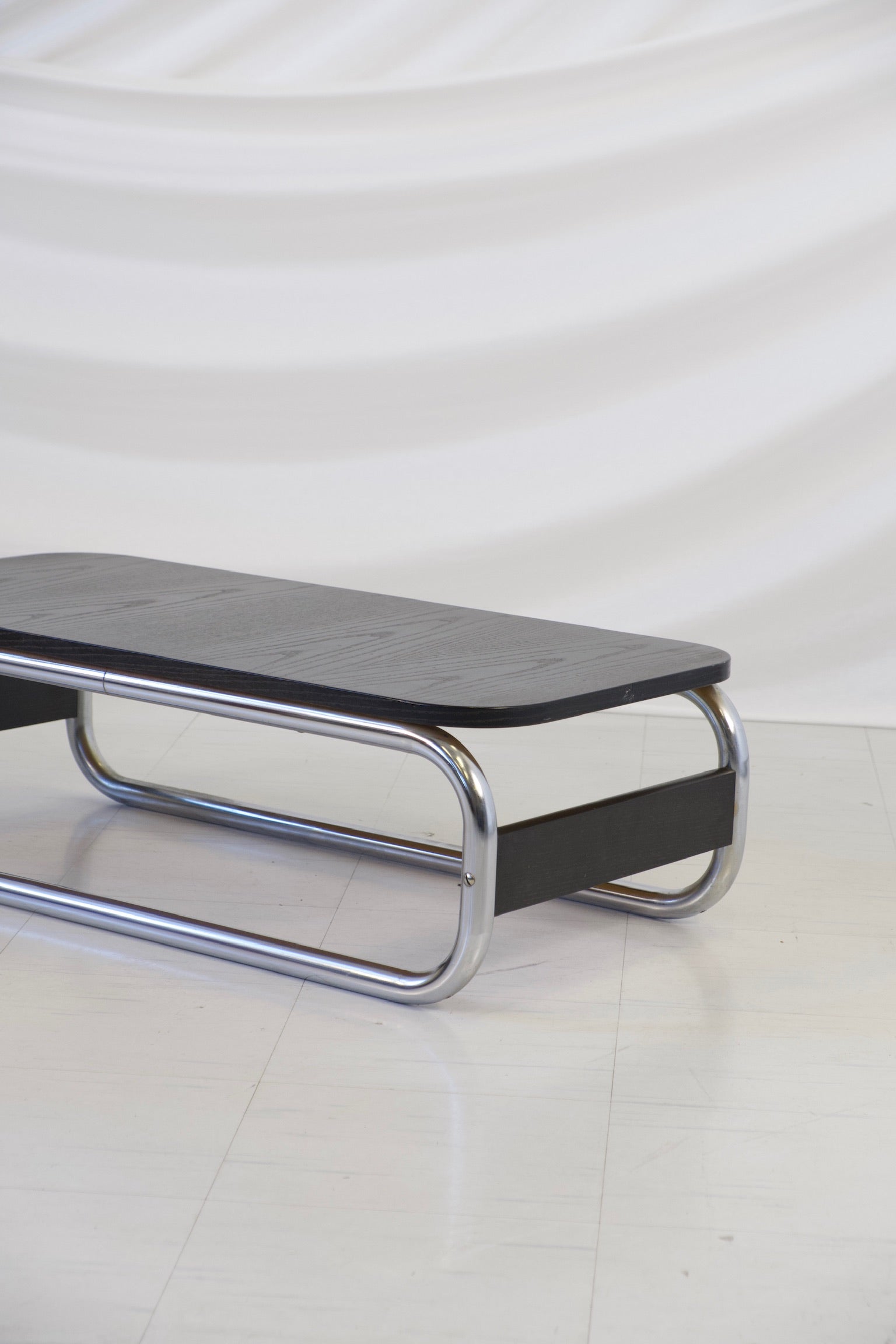1970年代の印象的なヴィンテージIKEA Impalaコーヒーテーブル。当時を象徴する大胆なチューブ状のクロームデザインが際立っています。洗練されたブラックの木製天板と、丸みを帯びたクローム仕上げの脚がエレガントなループ構造を形成しています。
