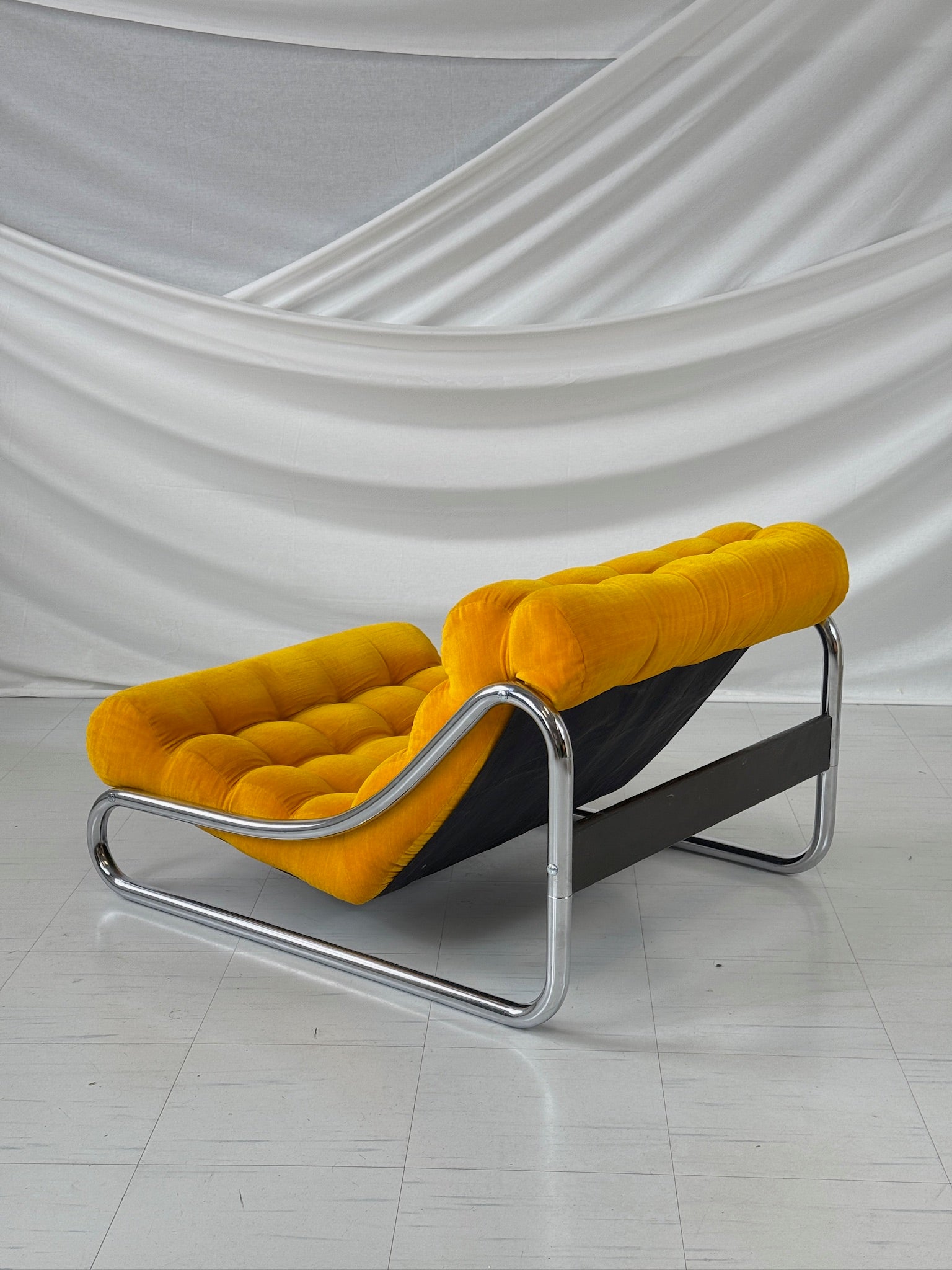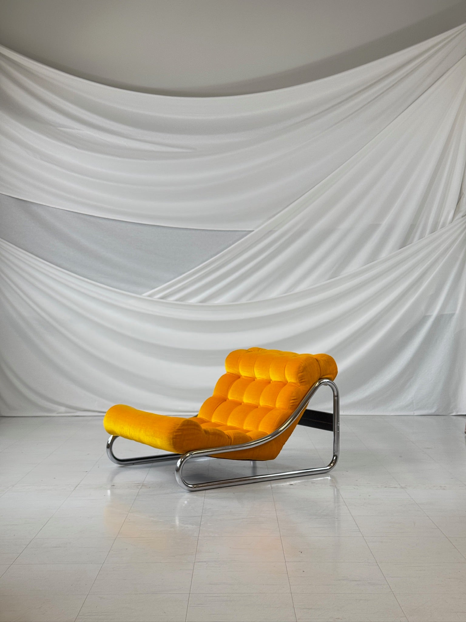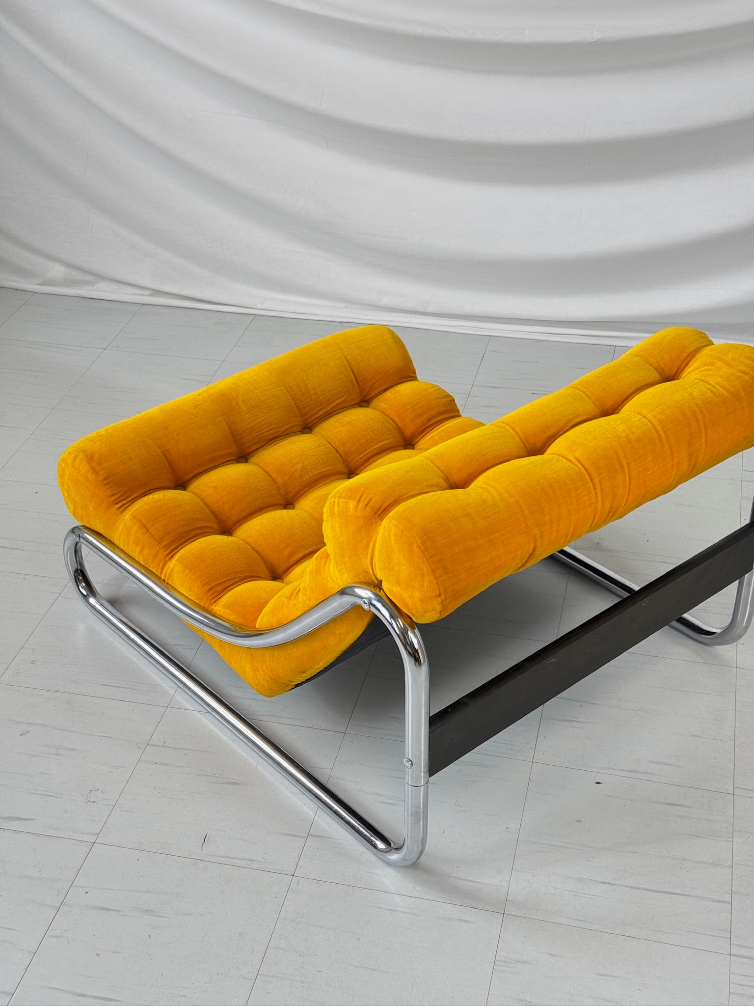 1970年代にデザインされたImpalaラウンジチェアは、IKEAを代表するヴィンテージデザインの一つです。彫刻的なクロームチューブフレームと低めのプロポーションが特徴で、宇宙時代を彷彿とさせる曲線美と、人間工学に基づいたゆったりとしたフォルムが融合しています。深めの座面と鮮やかなイエローのタフテッドベルベットの張地が、印象的なビジュアルと抜群の座り心地を両立させています。 スウェーデンのIKEAで製造。廃盤モデル。