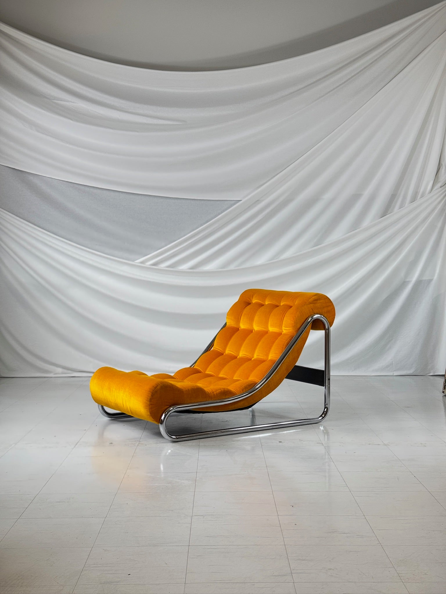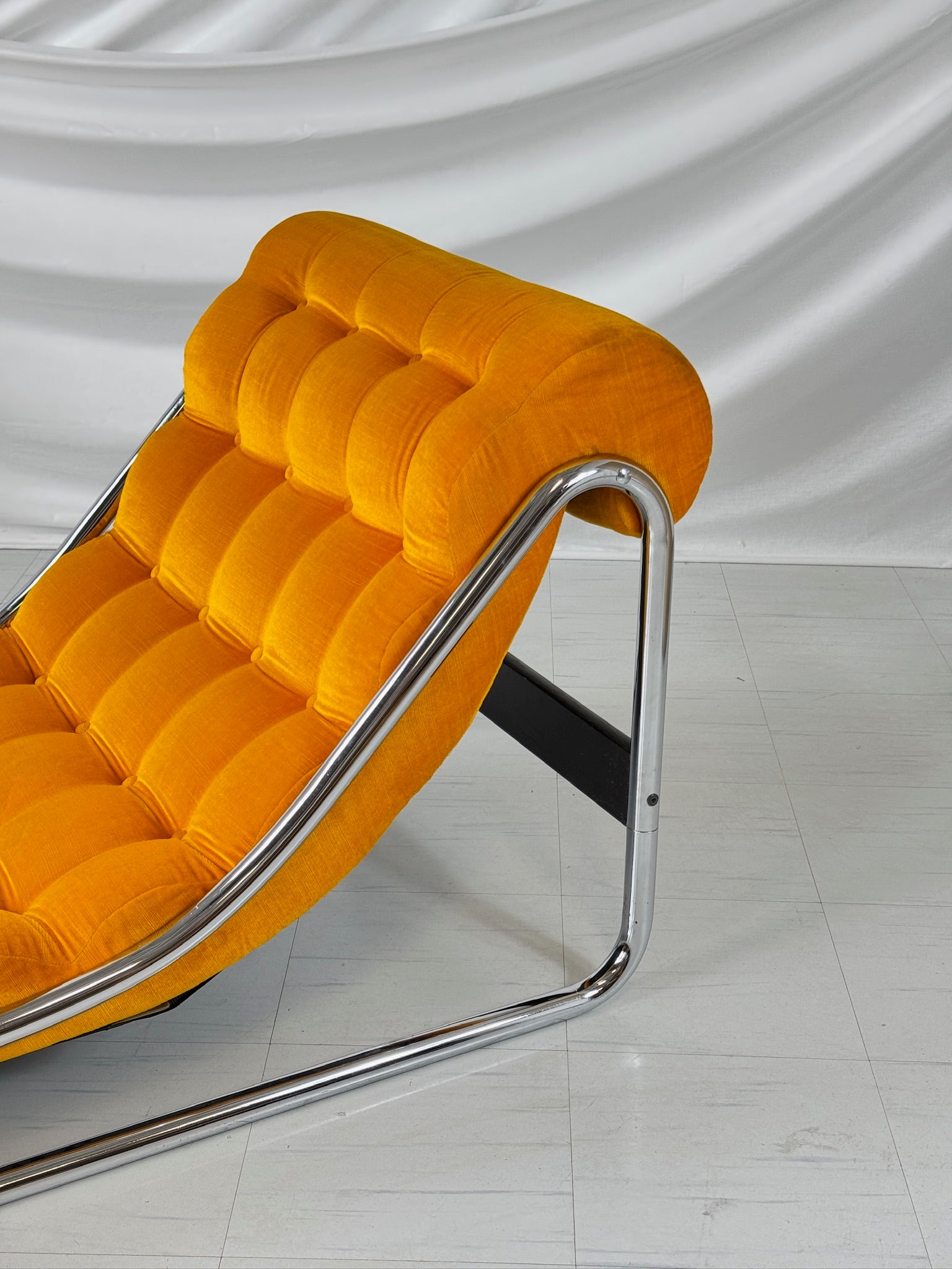 ヴィンテージ品として良好なコンディションです。クロームフレームには、経年によるわずかな摩耗と古色の変化が見られますが、使用感はごくわずかです。ベルベットの張り地は鮮やかで贅沢な質感で、使用感は最小限です。詳細については、詳細な写真をご覧ください。