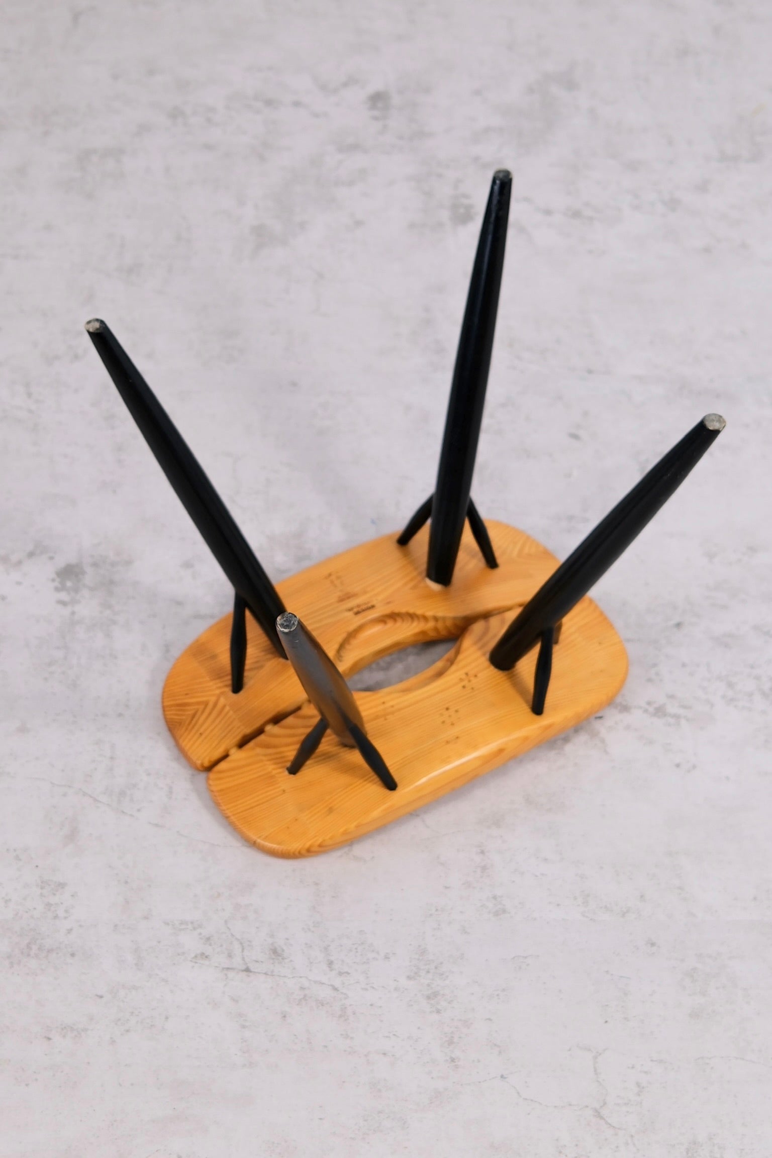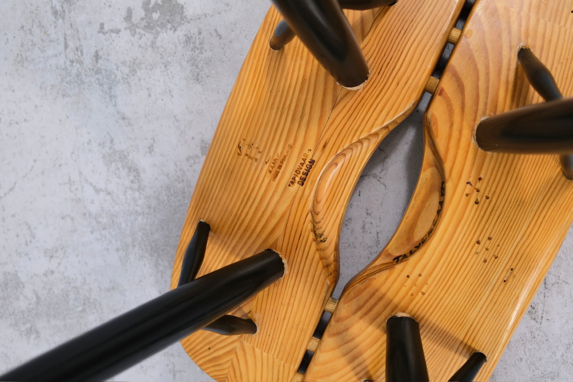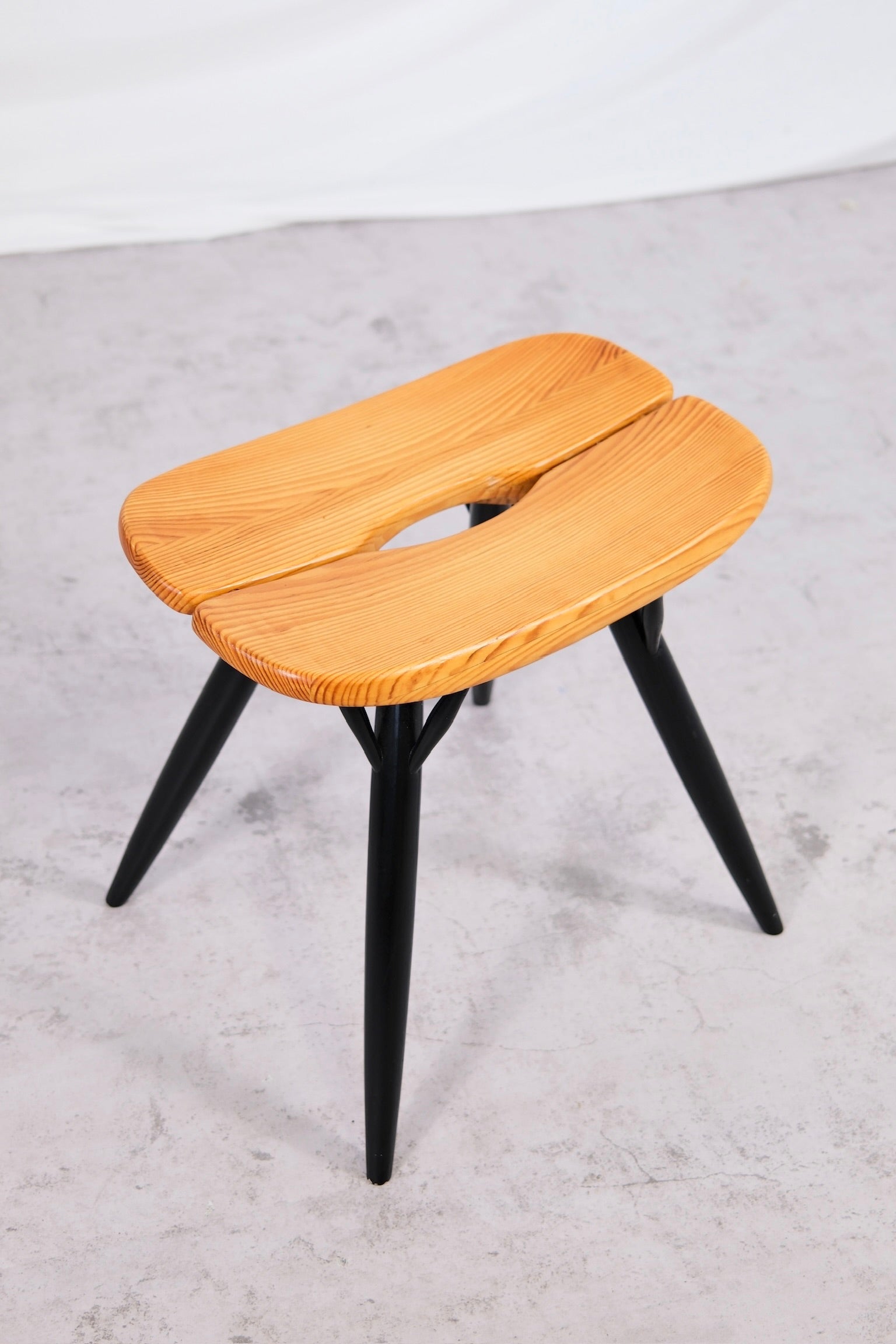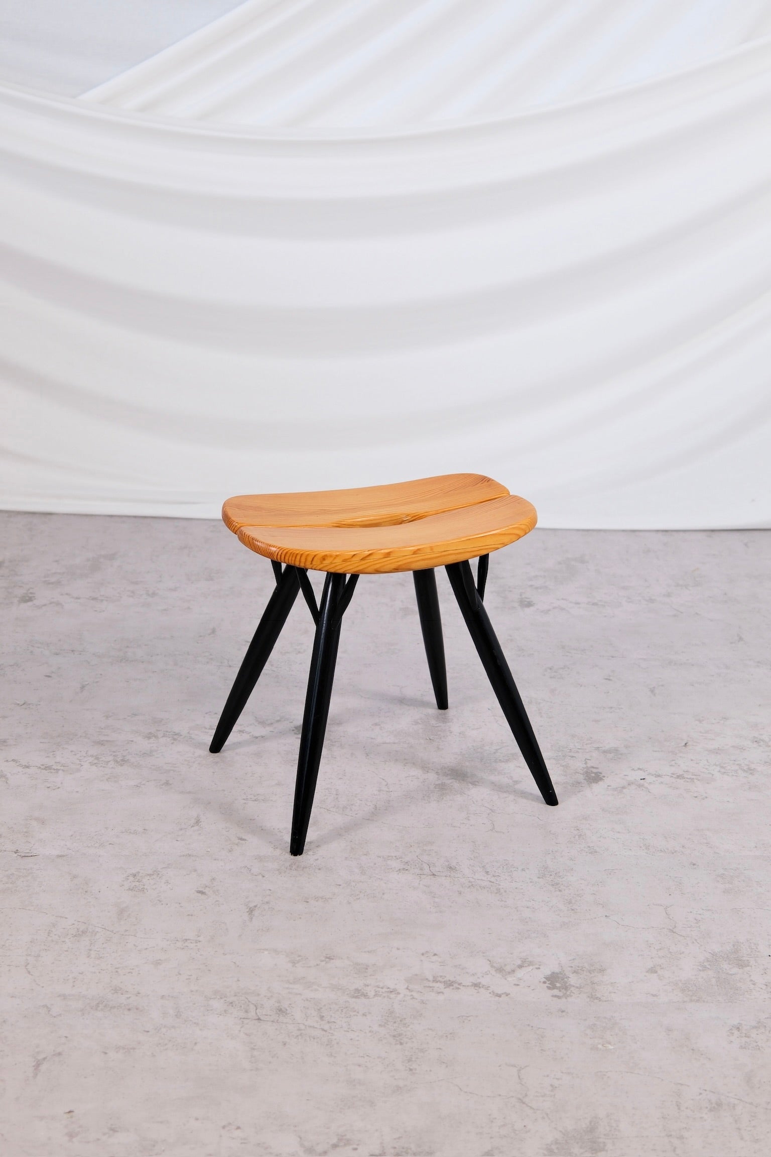 Classic Pirkka stool designed by Ilmari Tapiovaara for Laukaan Puu in the 1950s. This iconic Finnish design combines a pine seat with lacquered birch legs, showcasing Tapiovaara’s ability to merge traditional craftsmanship with modern form.