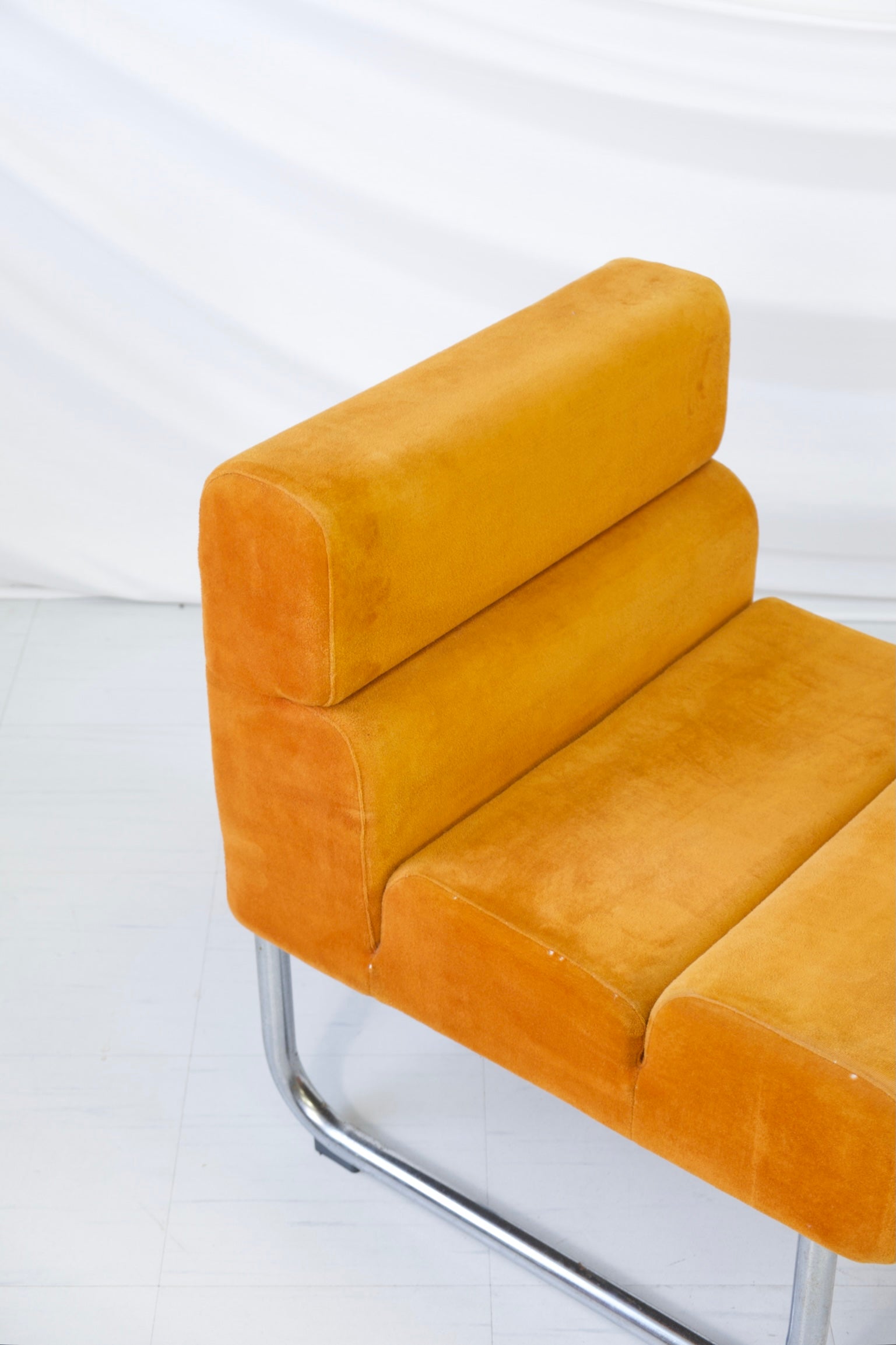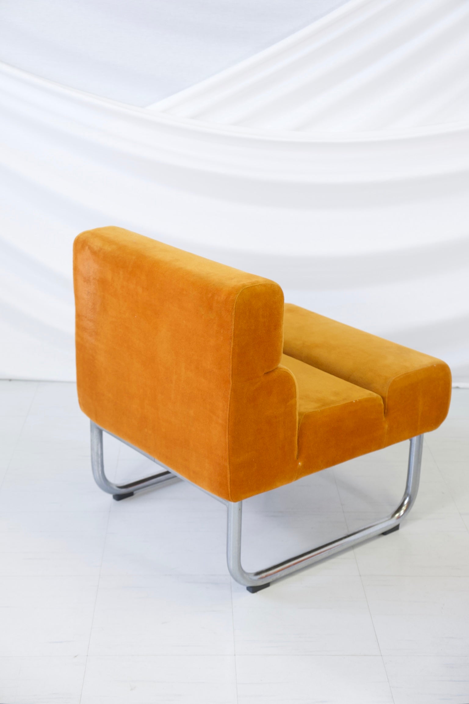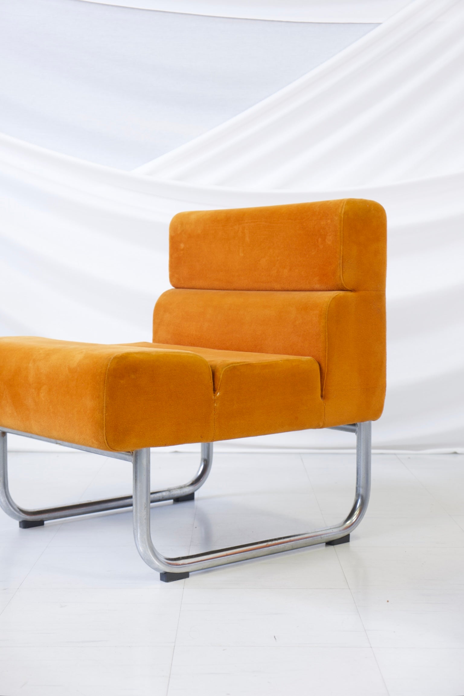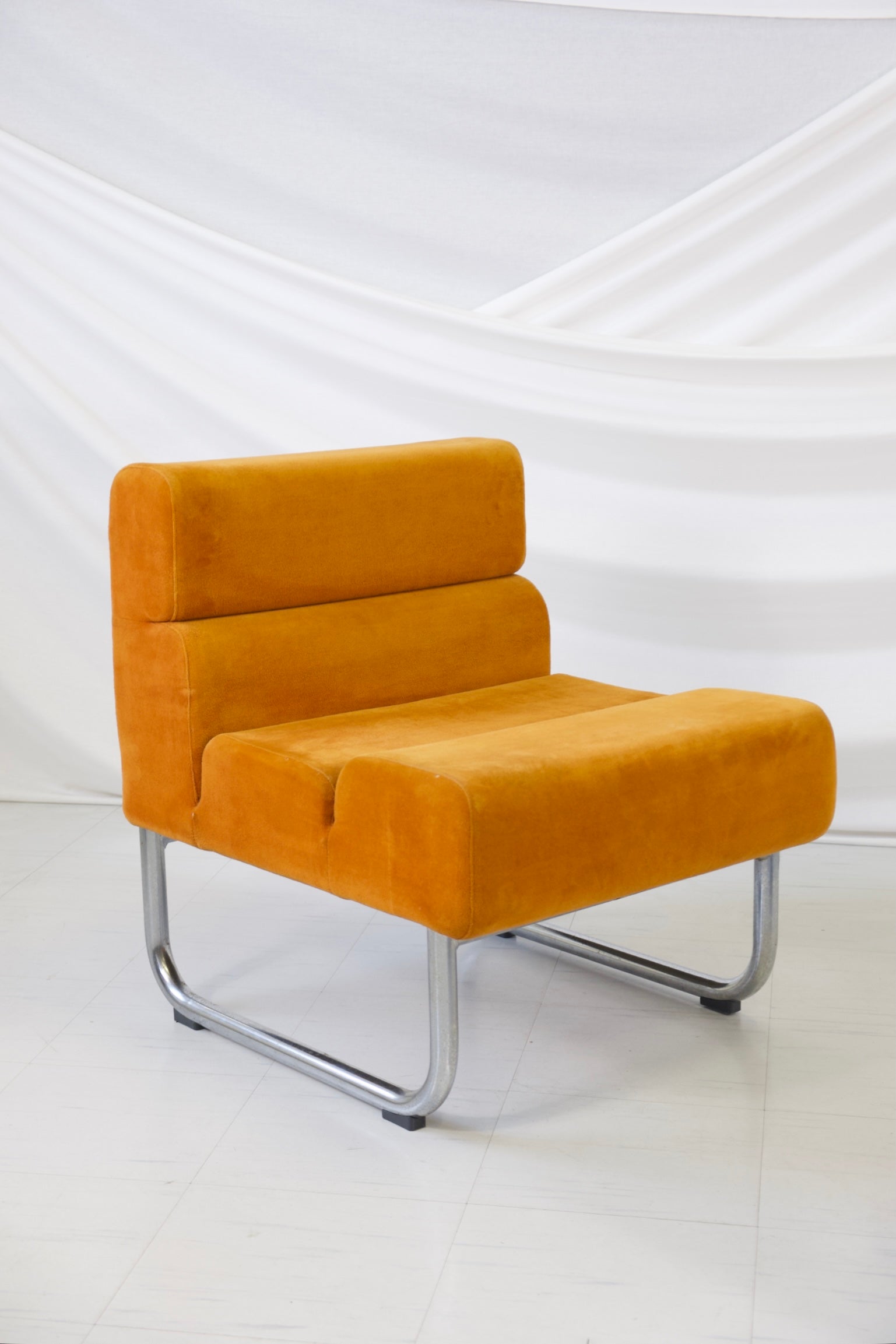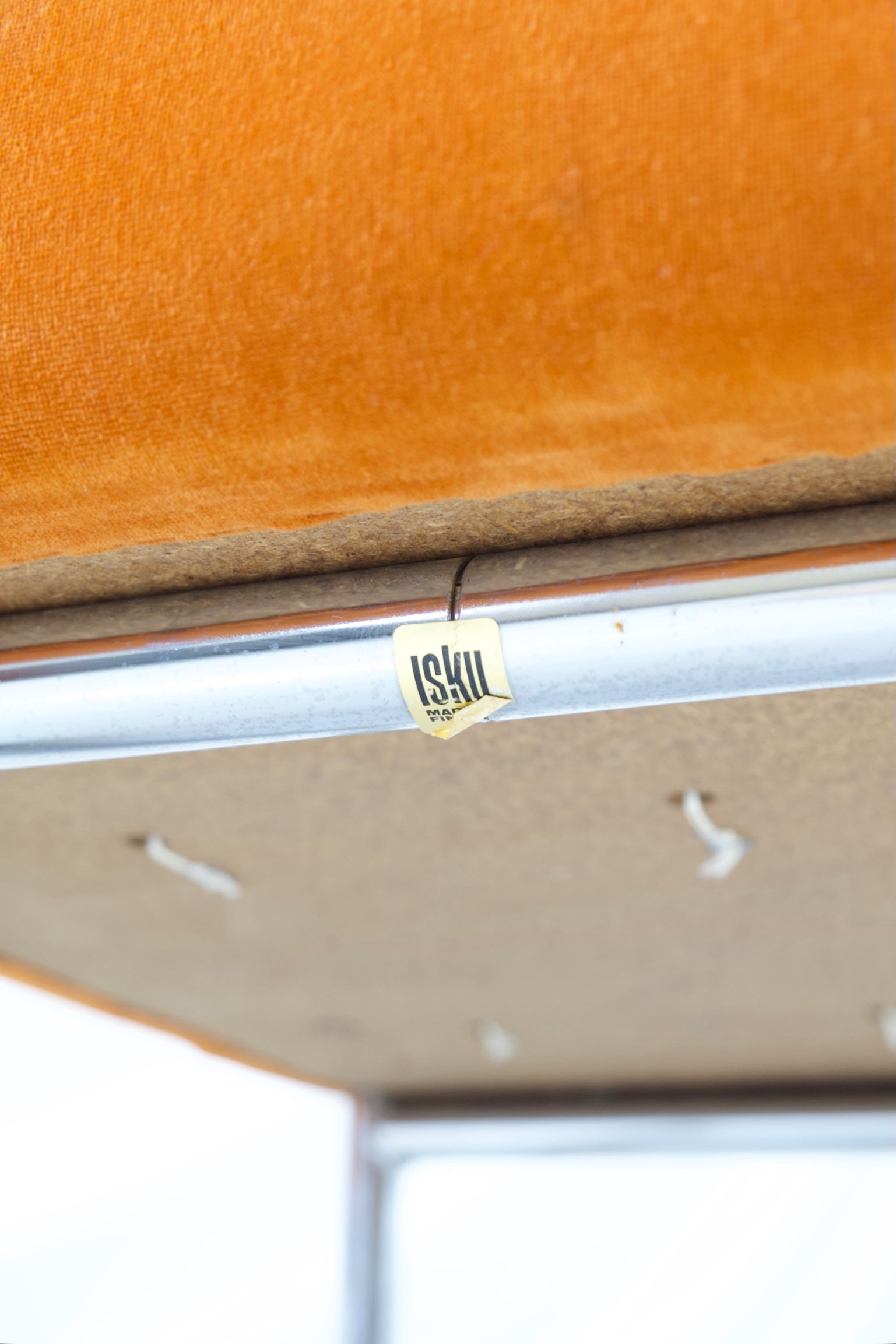 ライモ・ラサネンが1970年代にフィンランドのイスクー社のためにデザインした、 Funkkisラウンジチェア4脚セット。鮮やかなオレンジ色の張地とクローム管状のフレームが特徴的なこれらの印象的な作品は、フィンランドのモダニズムを特徴づける洗練されたラインと大胆な色彩を体現しています。
