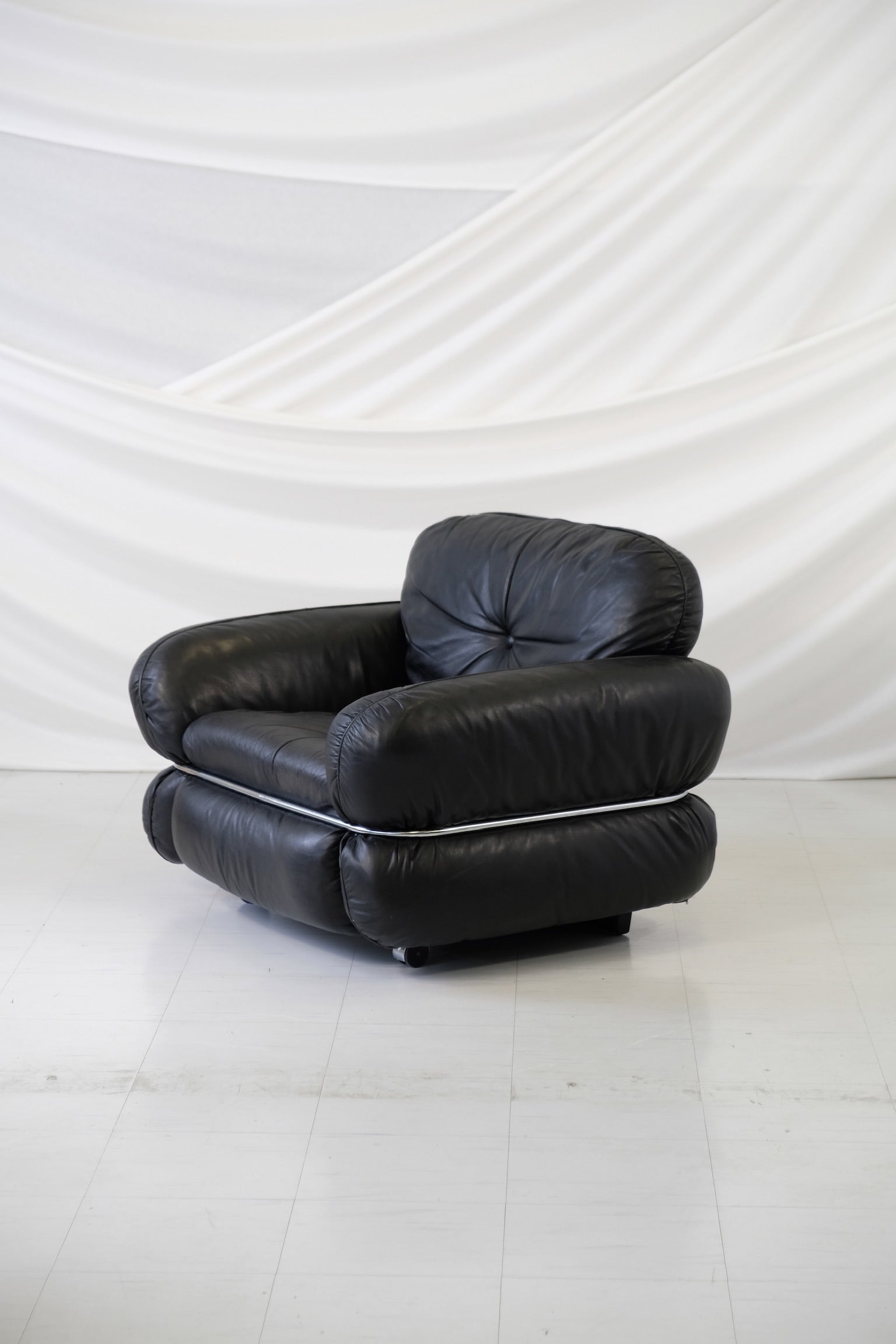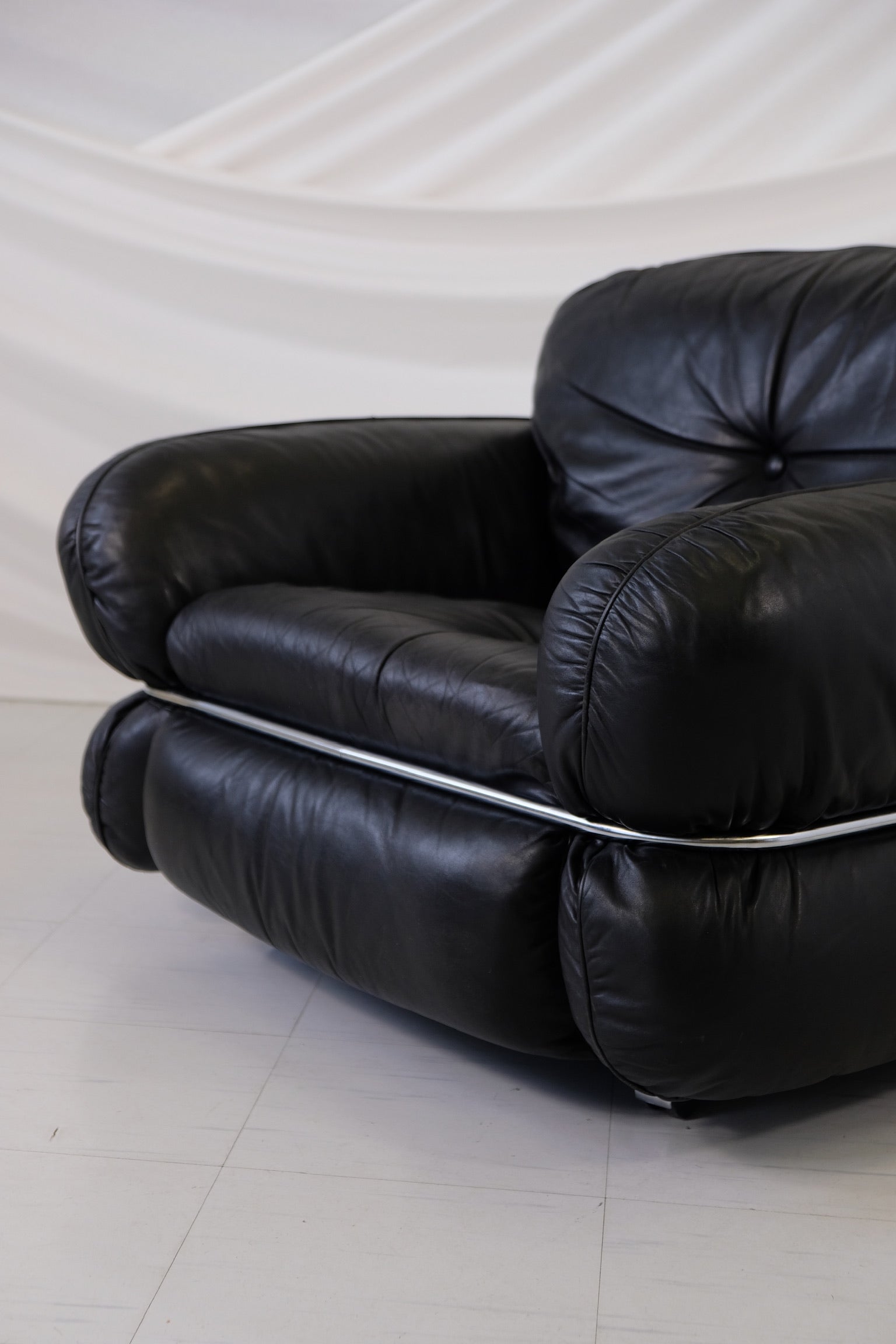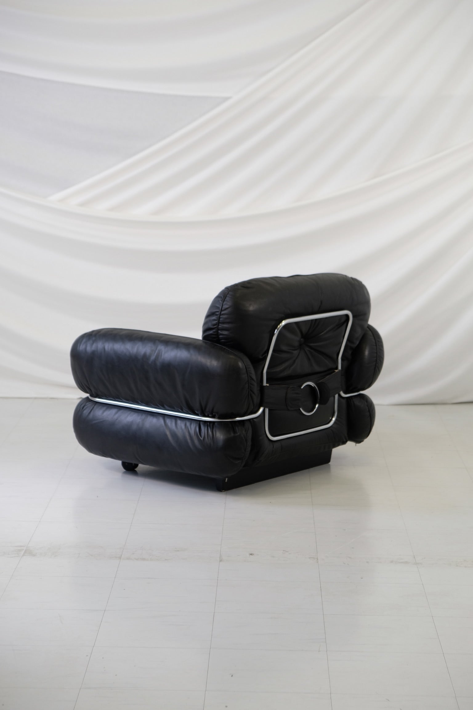 クルト・ヴィッツヨがIskuのためにデザインした「ハンニバル」アームチェアは、1970年代のフィンランドデザインの古典的名作であり、同シリーズのソファの大胆なラインと贅沢な座り心地を彷彿とさせます。贅沢な黒のレザー張りと、座面を包み込む特徴的なクロームチューブラーフレームが特徴で、彫刻的なフォルムと深い座り心地を両立しています。単独で存在感を放つアイテムとして、あるいはソファと合わせてセットでお使いいただくのもおすすめです。