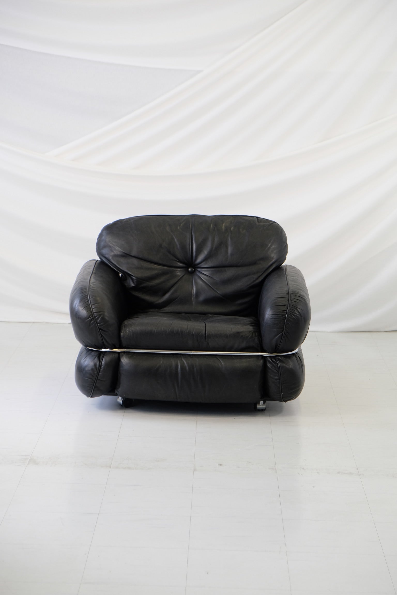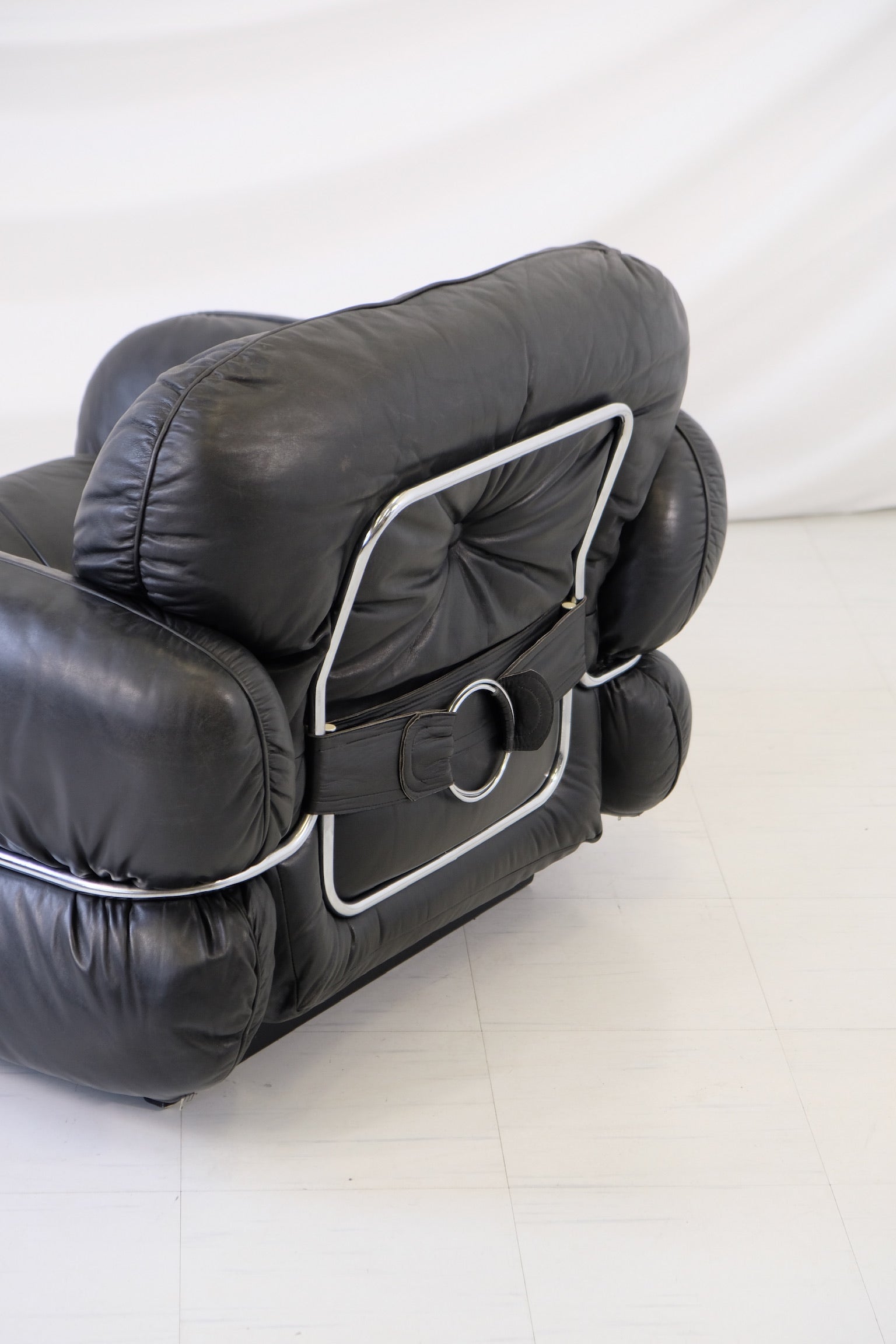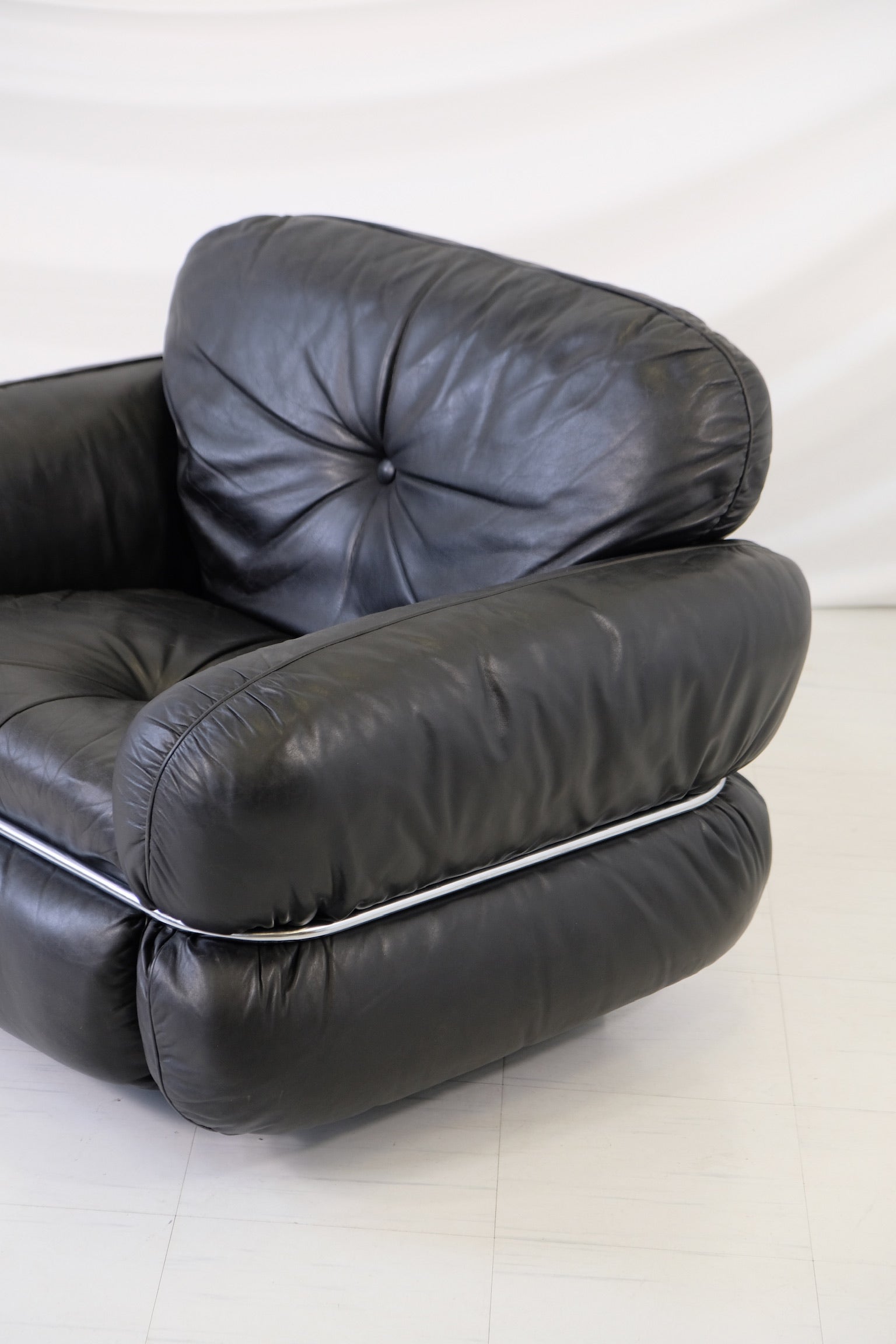クルト・ヴィッツヨがIskuのためにデザインした「ハンニバル」アームチェアは、1970年代のフィンランドデザインの古典的名作であり、同シリーズのソファの大胆なラインと贅沢な座り心地を彷彿とさせます。贅沢な黒のレザー張りと、座面を包み込む特徴的なクロームチューブラーフレームが特徴で、彫刻的なフォルムと深い座り心地を両立しています。単独で存在感を放つアイテムとして、あるいはソファと合わせてセットでお使いいただくのもおすすめです。