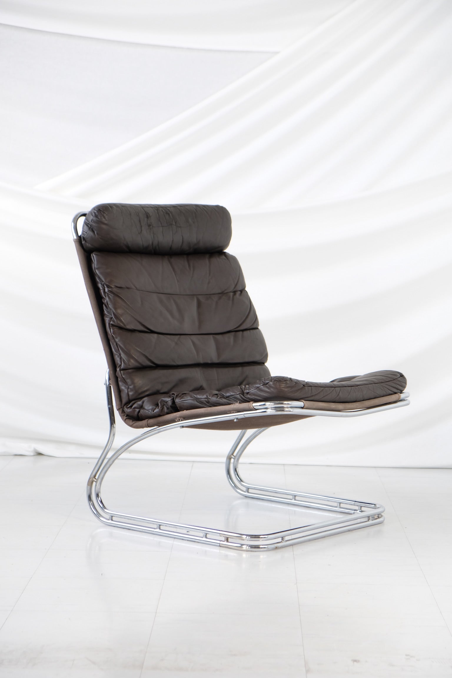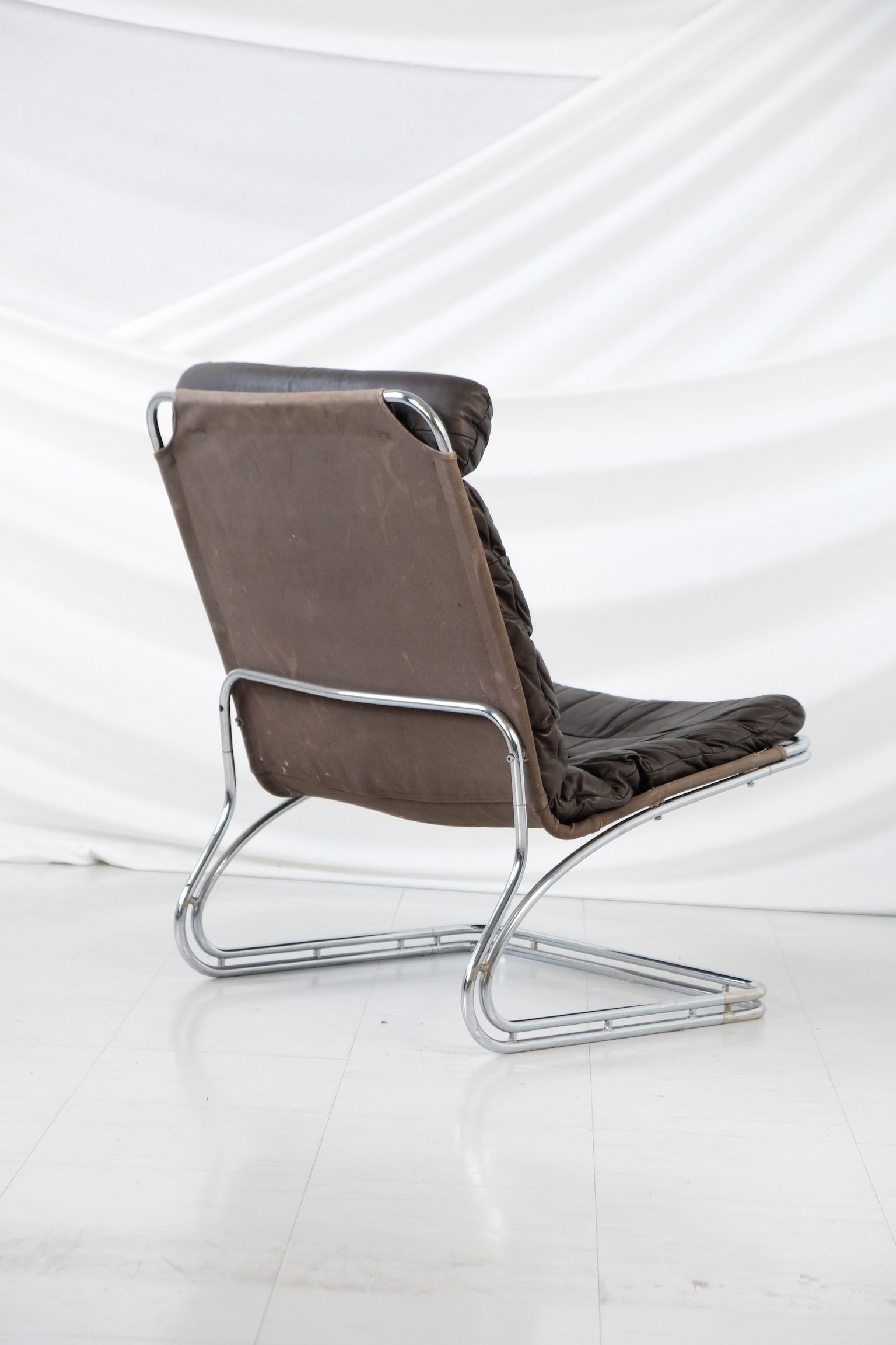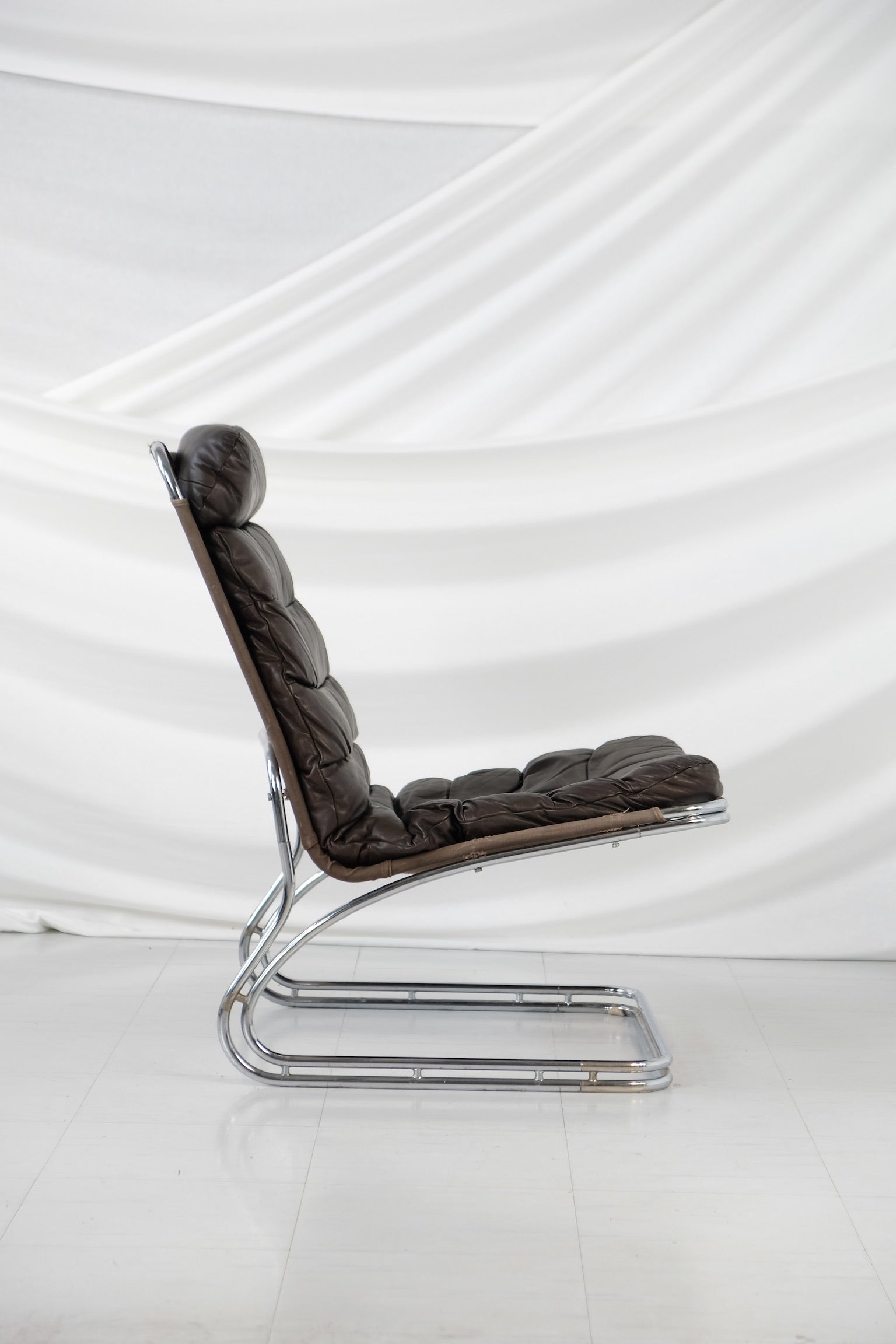 ジョン・モーテンセンがデンマークのThams Kvalitetのためにデザインした、1970年代のヴィンテージラウンジチェア「Fuga」。洗練された片持ち式のクロームメッキスチールフレームが、オリジナルのダークブラウンレザー張りのフローティングシートを支えています。たっぷりとしたクッションと高めの背もたれが抜群の座り心地を提供し、流線型のシルエットは当時の北欧モダニズムデザインを反映しています。リビングルーム、読書コーナー、オフィスなど、スタイリッシュな存在感を放つアイテムです。