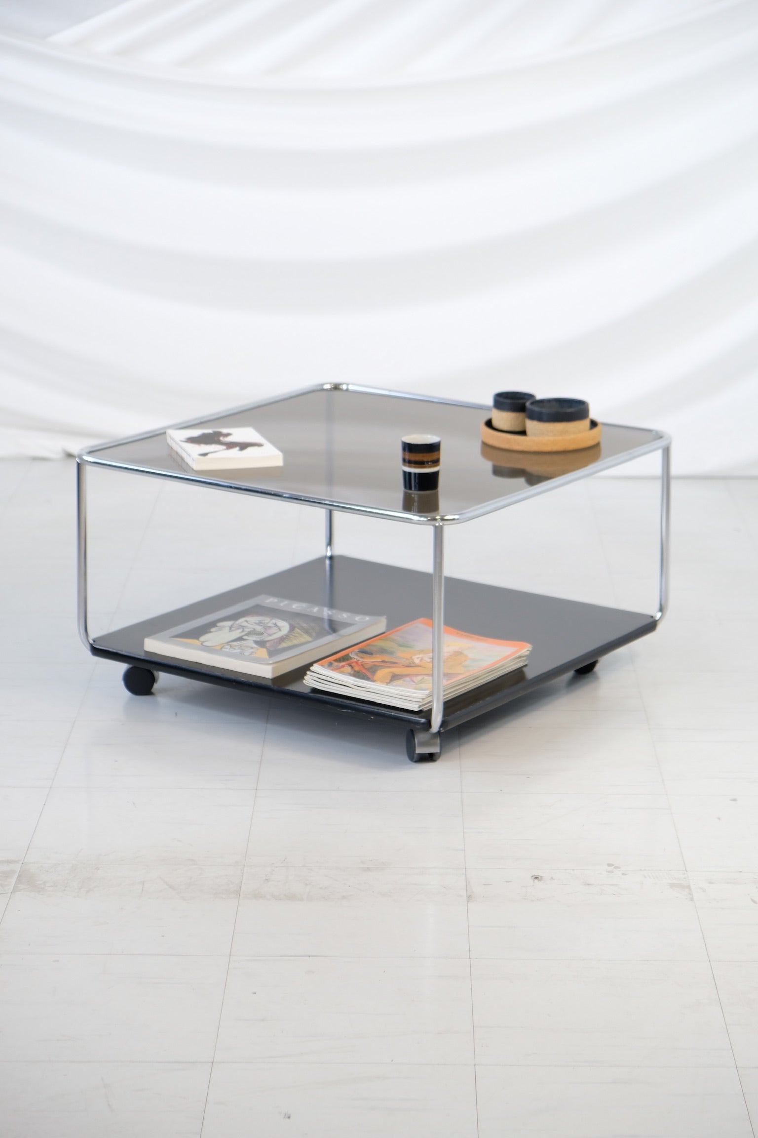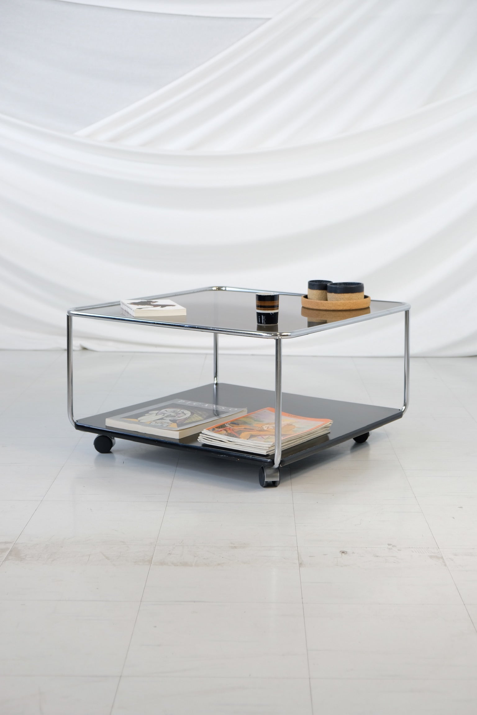 1980年代にクルト・ヴィッツヨがIskuのためにデザインした「ハンニバル」コーヒーテーブルは、工業的な明快さと北欧の機能性を融合させた、ミニマルなクラシックデザインです。透明なガラスの天板と黒のラミネート棚を備え、スチールパイプでフレームを構成し、控えめな黒のキャスターが付いているので、楽に移動できます。