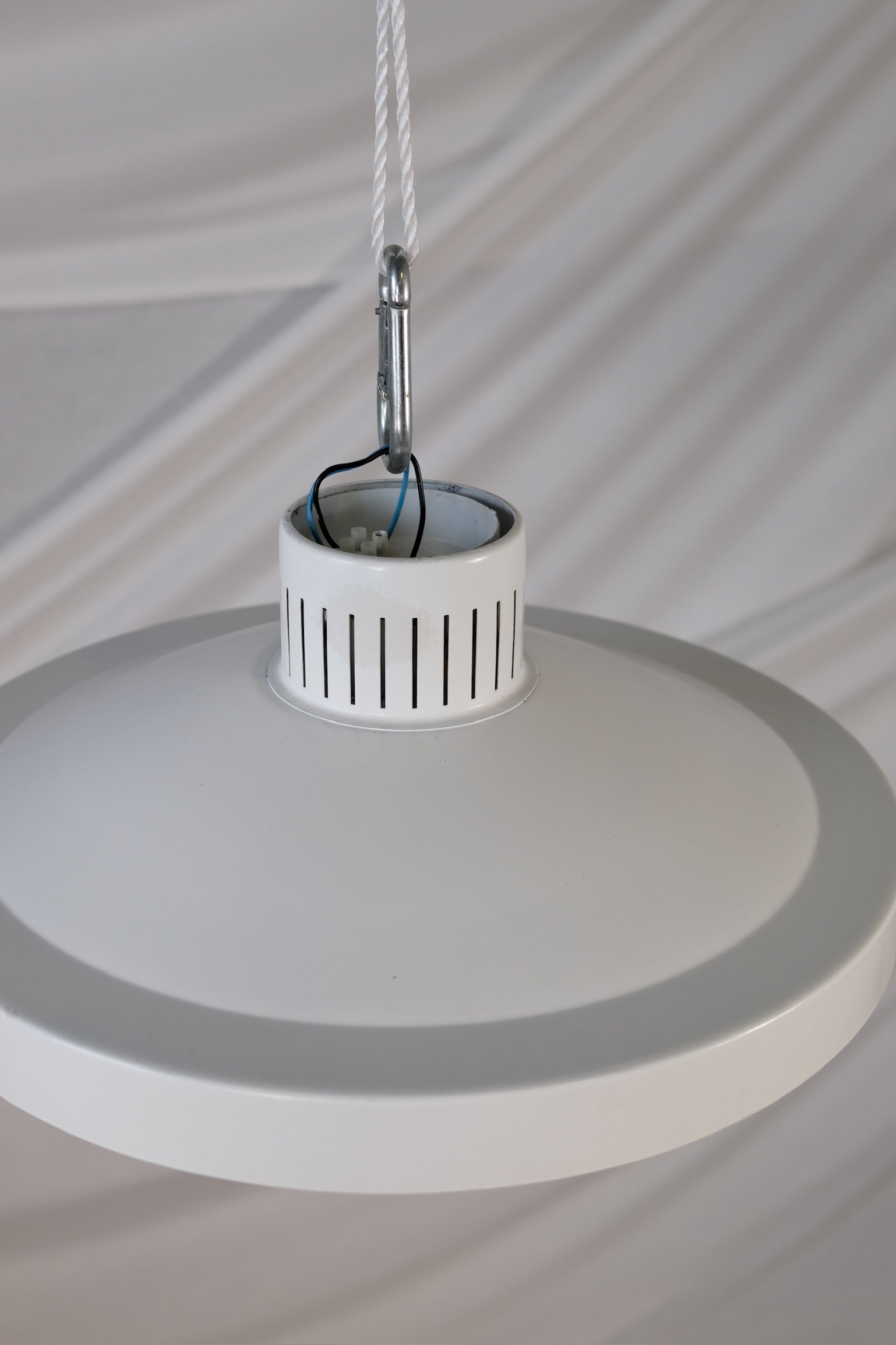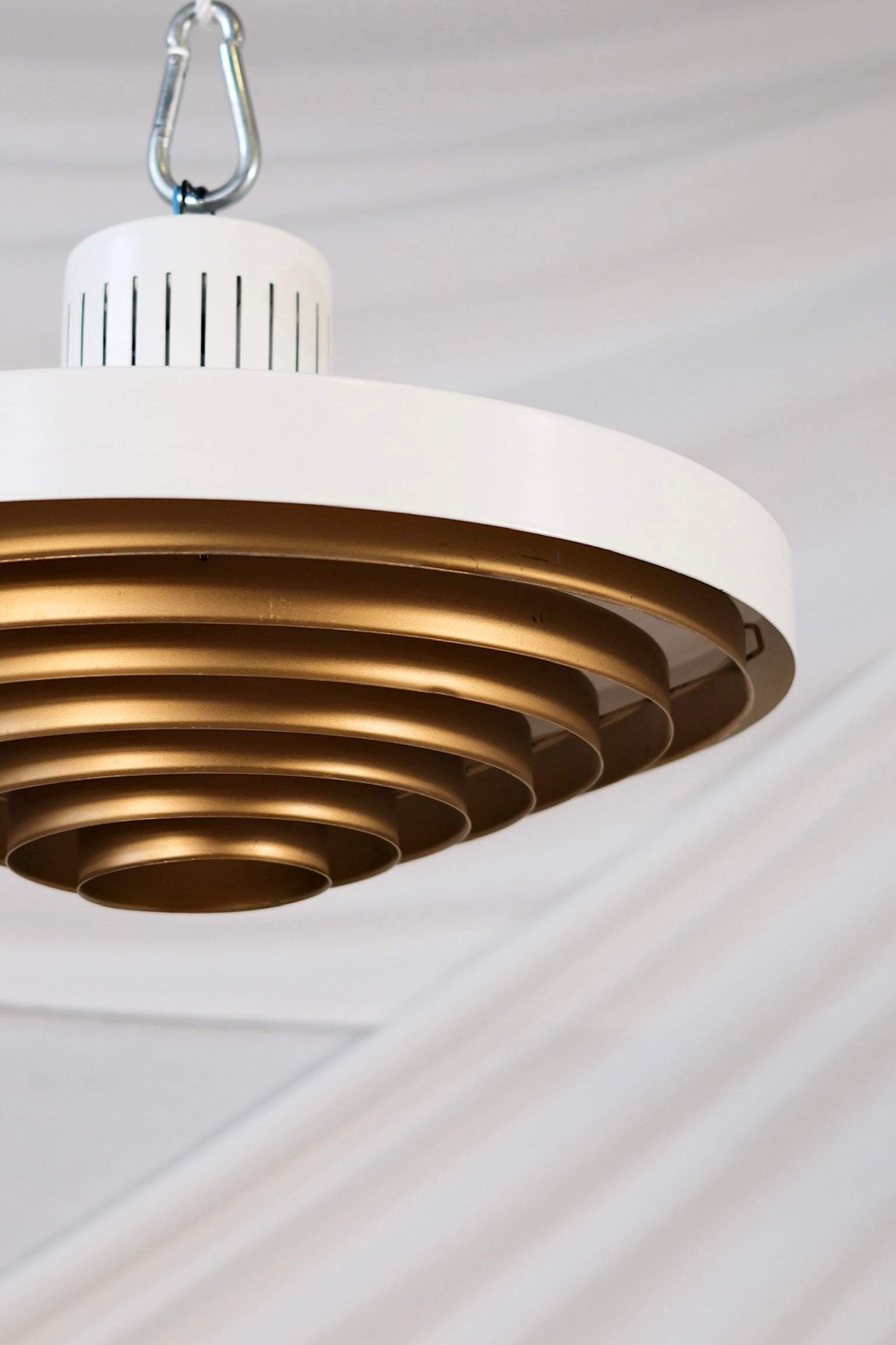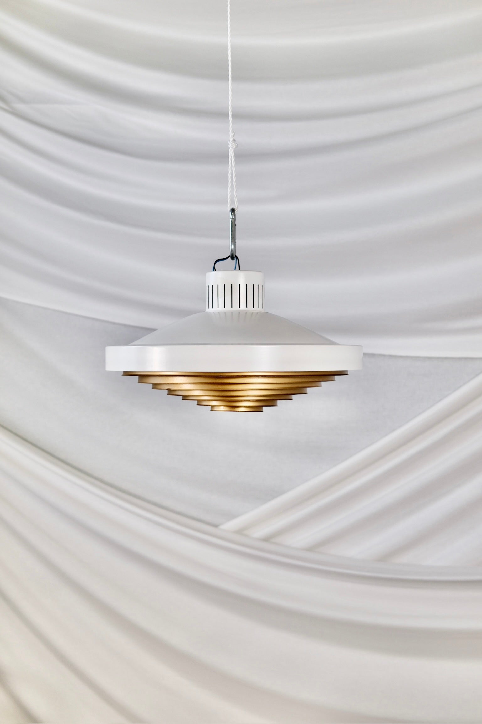 Rare ceiling lamp model 71-149, designed by Lisa Johansson-Pape and produced by Orno, Finland, in the 1950s. This plafon features a white lacquered metal body paired with a painted copper interior, casting a warm and atmospheric light. A timeless piece...