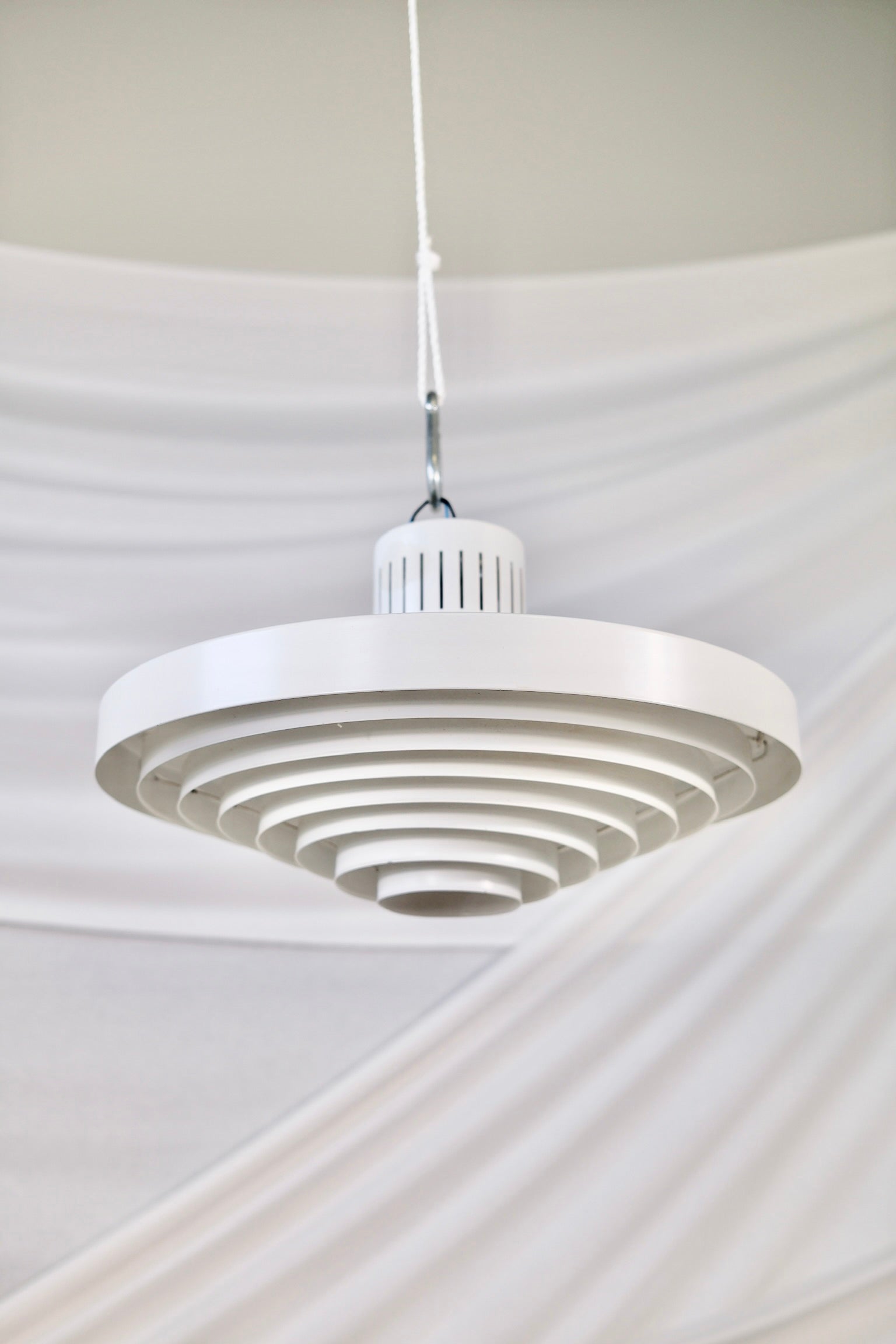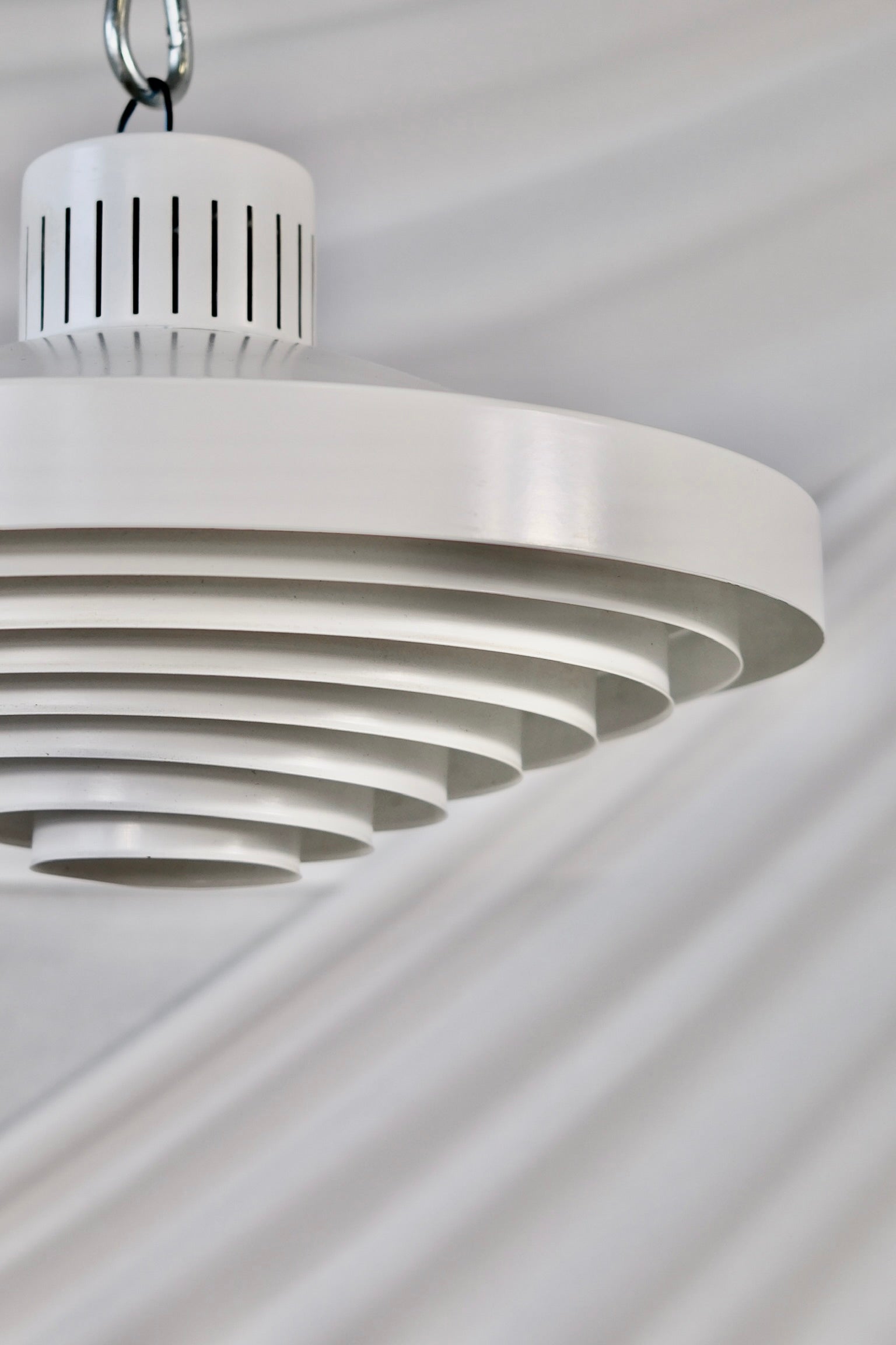 Rare ceiling lamp model 71-149, designed by Lisa Johansson-Pape and produced by Orno, Finland, in the 1950s. This plafon features a fully white lacquered metal body, including the stepped interior, giving it a crisp, modernist look that diffuses soft, even...