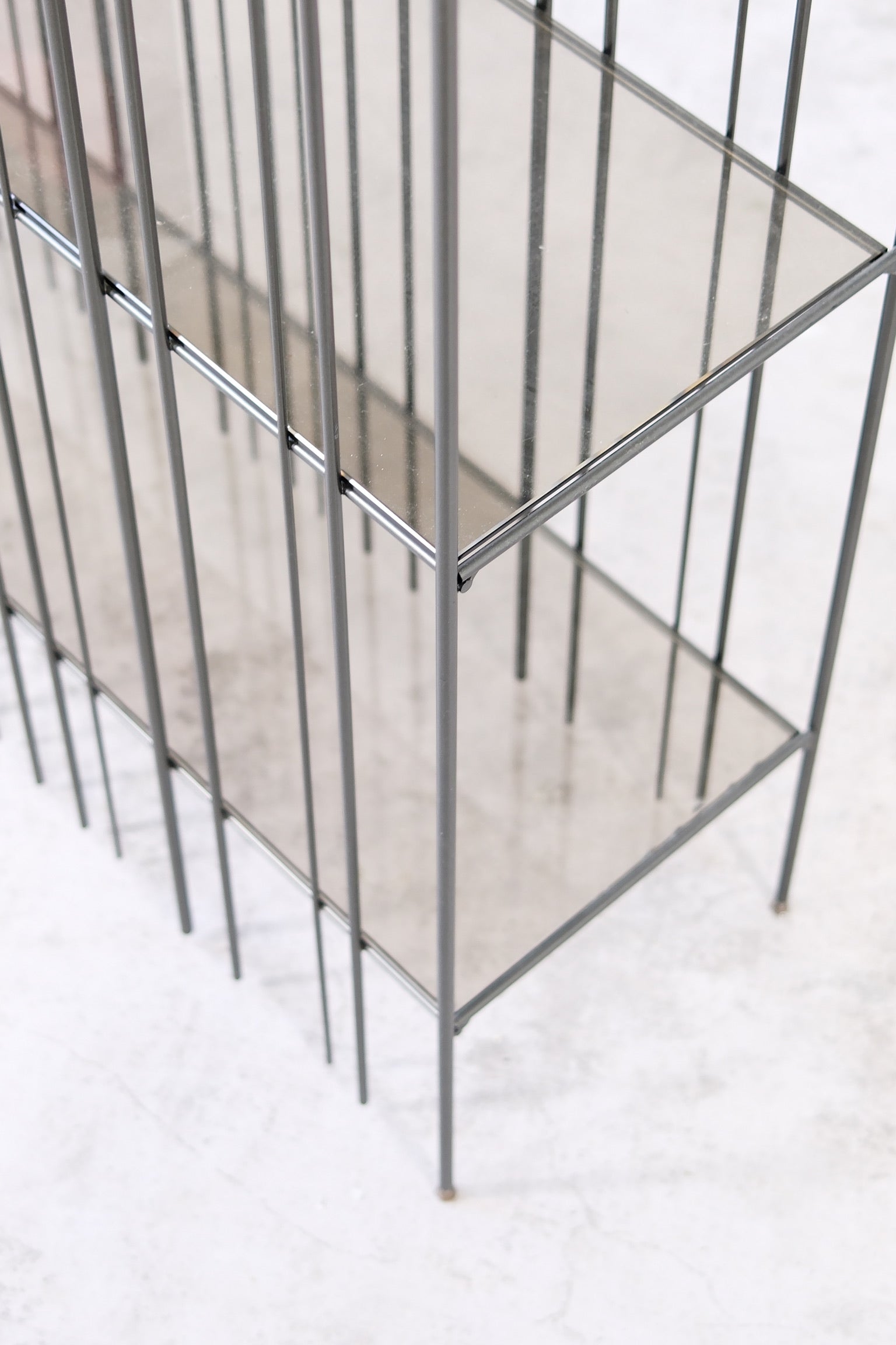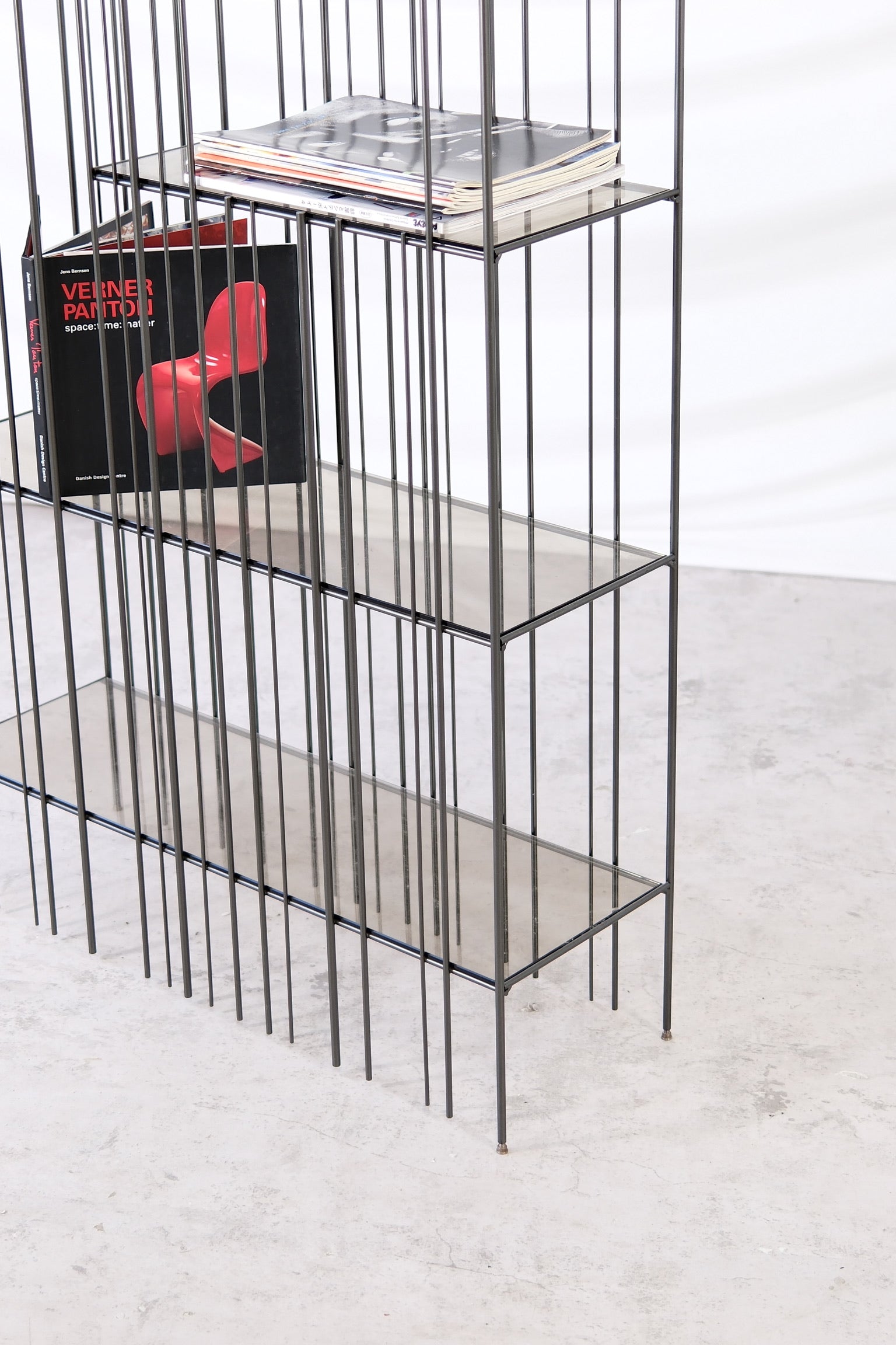 Metrica is a freestanding metal bookcase designed by CtrlZak Studio for Mogg. Made of slender iron rods finished in burnished metal, it features elegant tinted glass shelves that seem to float within the frame. The rhythm of the vertical lines gives the piece its distinctive graphic character while keeping it light and airy.
