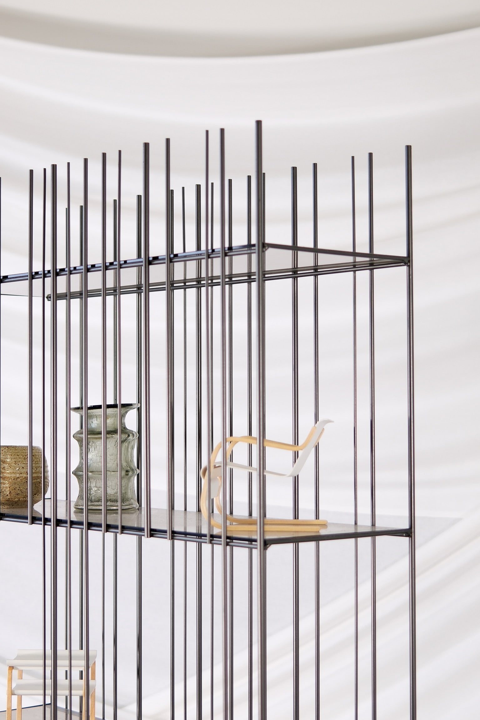 Metrica is a freestanding metal bookcase designed by CtrlZak Studio for Mogg. Made of slender iron rods finished in burnished metal, it features elegant tinted glass shelves that seem to float within the frame. The rhythm of the vertical lines gives...