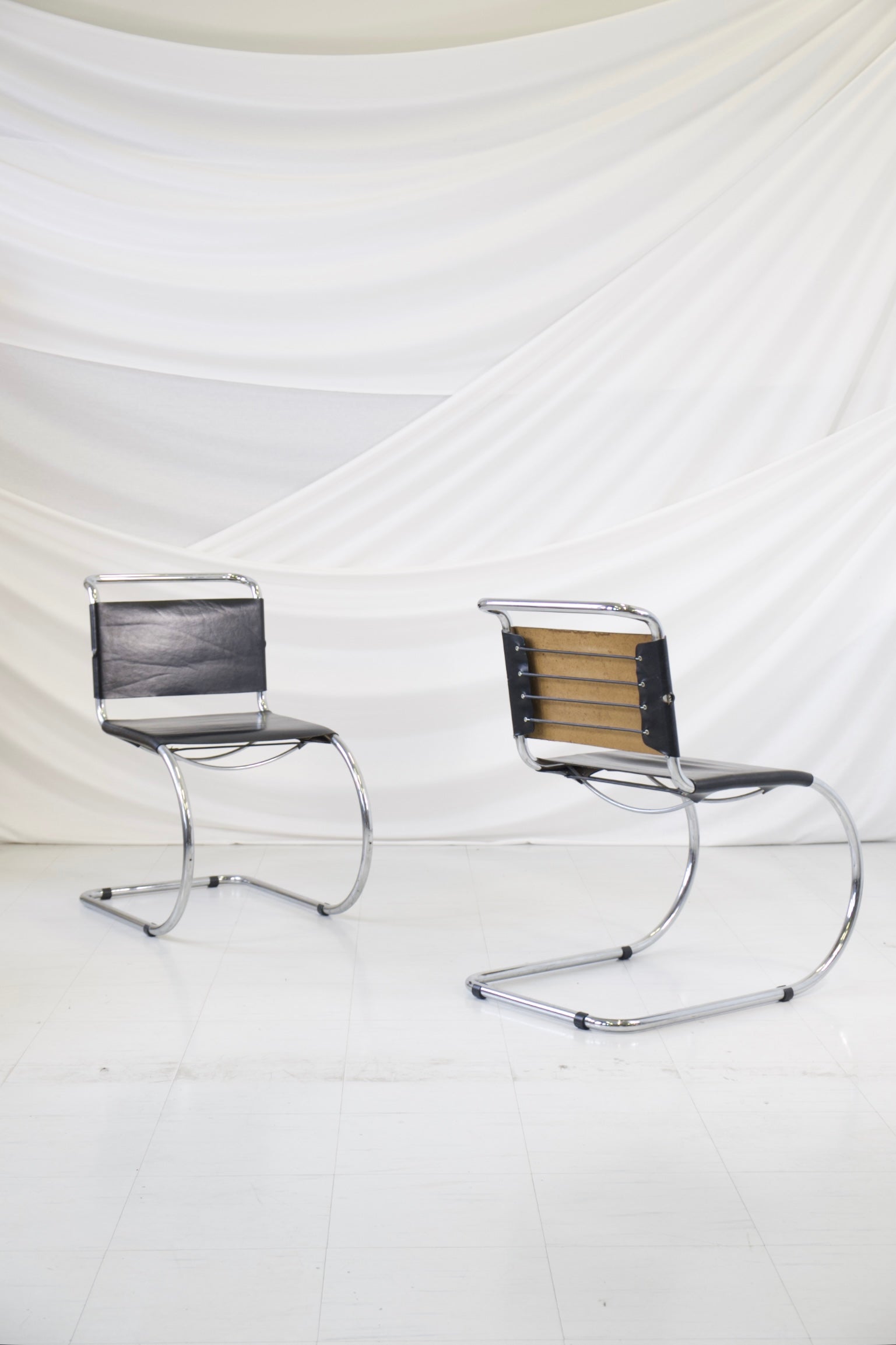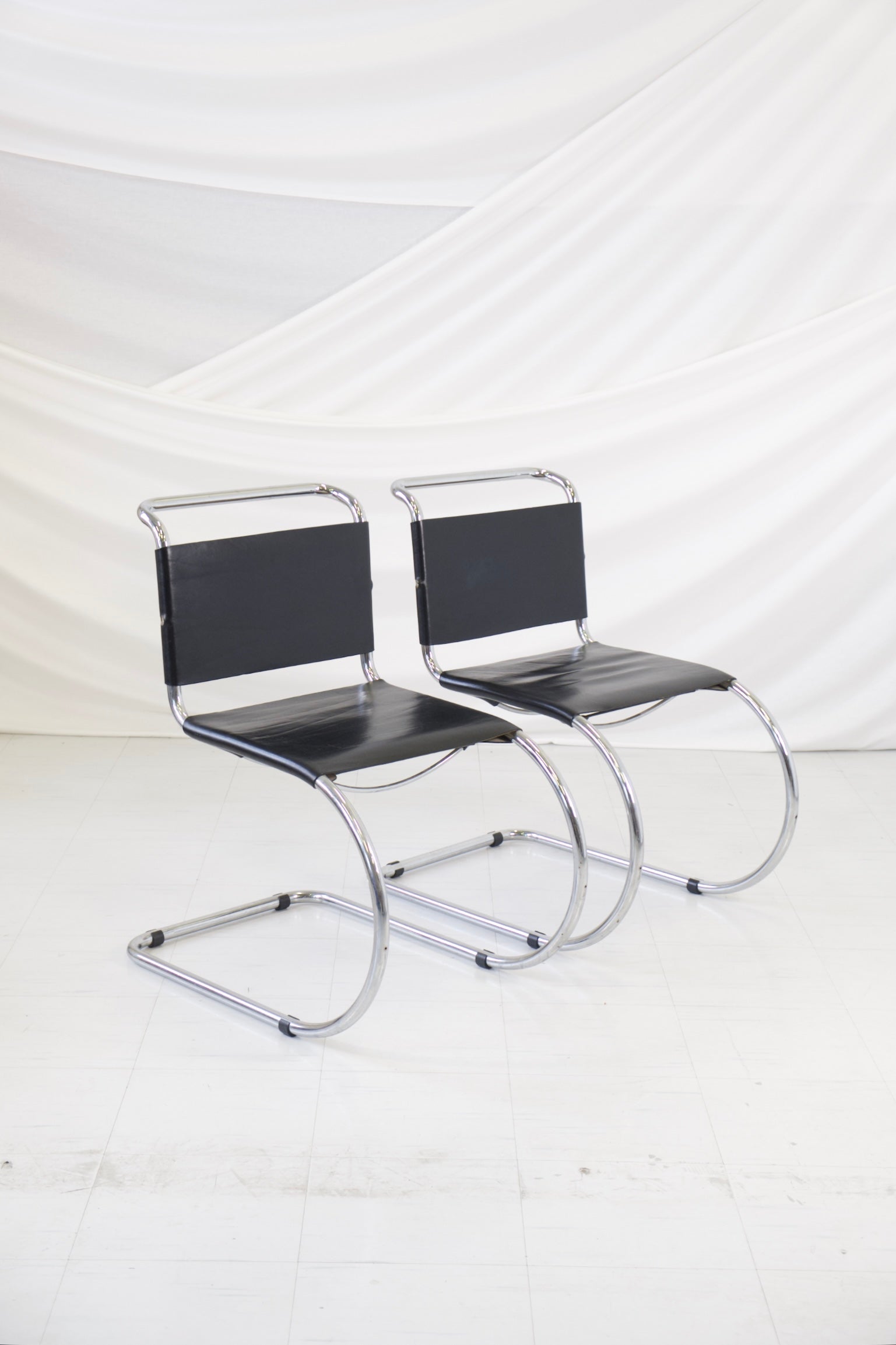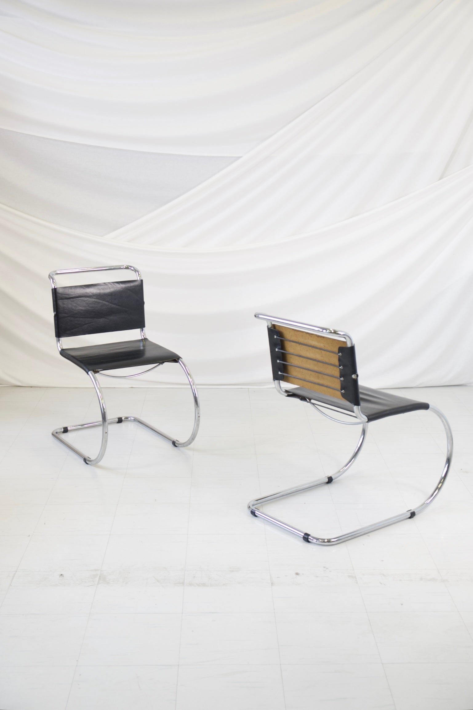 各チェアは、クロームメッキの鋼管フレームにブラックレザーの座面と背もたれを備えています。MR10は、機能的なシンプルさと時代を超越したエレガンスを兼ね備えた、バウハウスを代表するデザインの一つです。