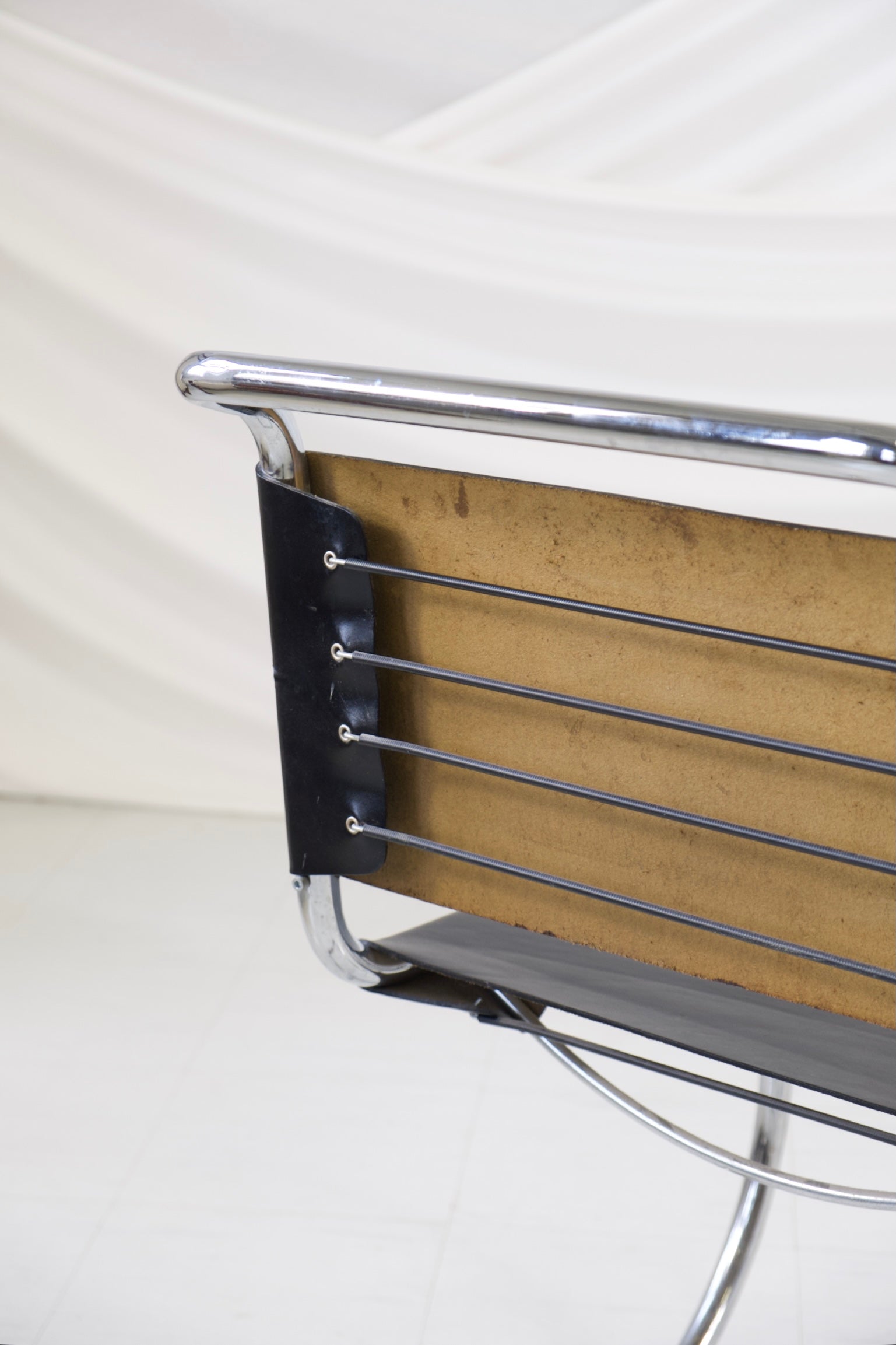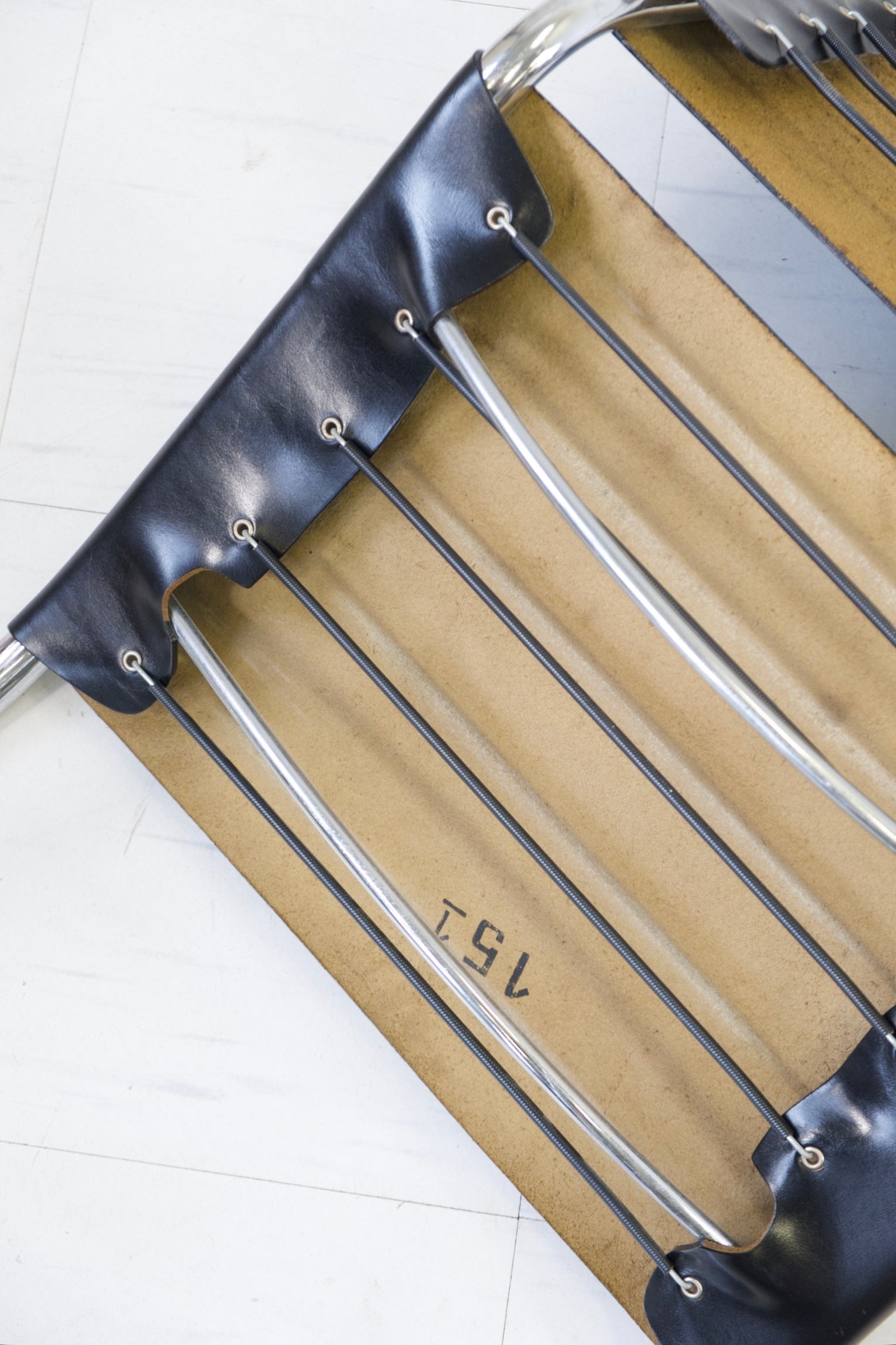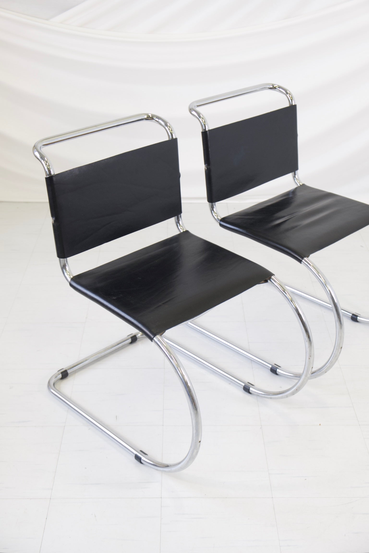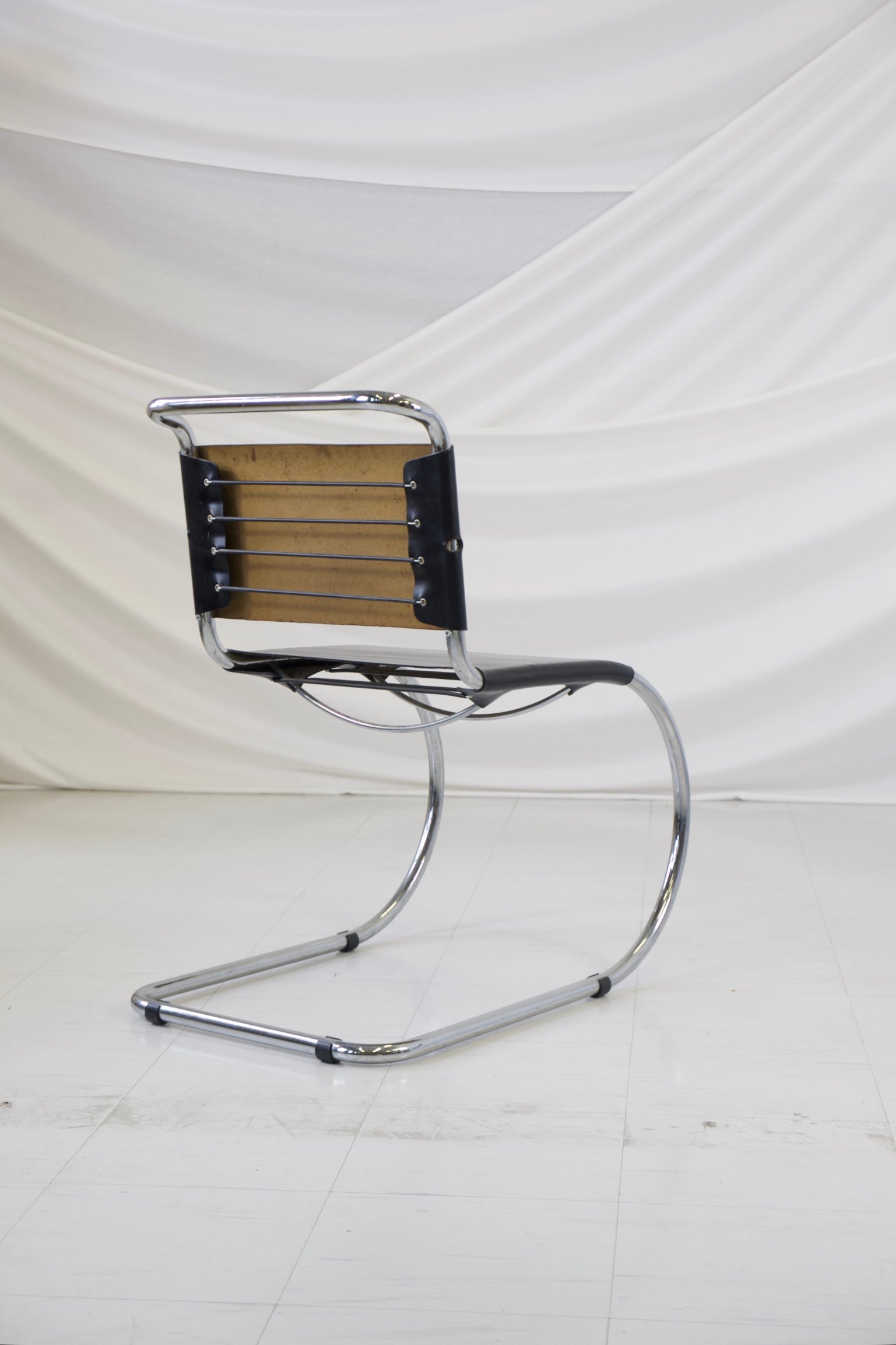 各チェアは、クロームメッキの鋼管フレームにブラックレザーの座面と背もたれを備えています。MR10は、機能的なシンプルさと時代を超越したエレガンスを兼ね備えた、バウハウスを代表するデザインの一つです。