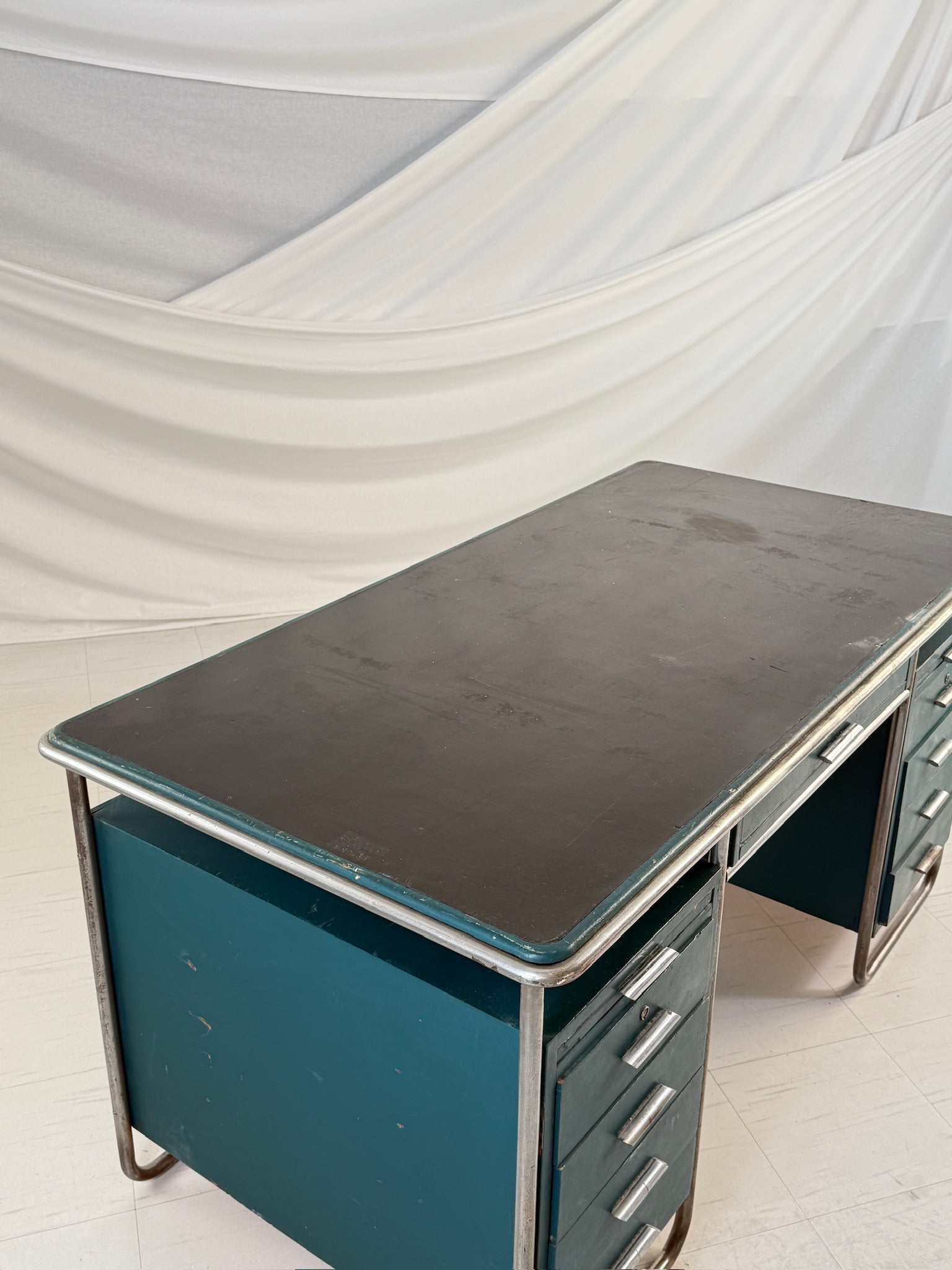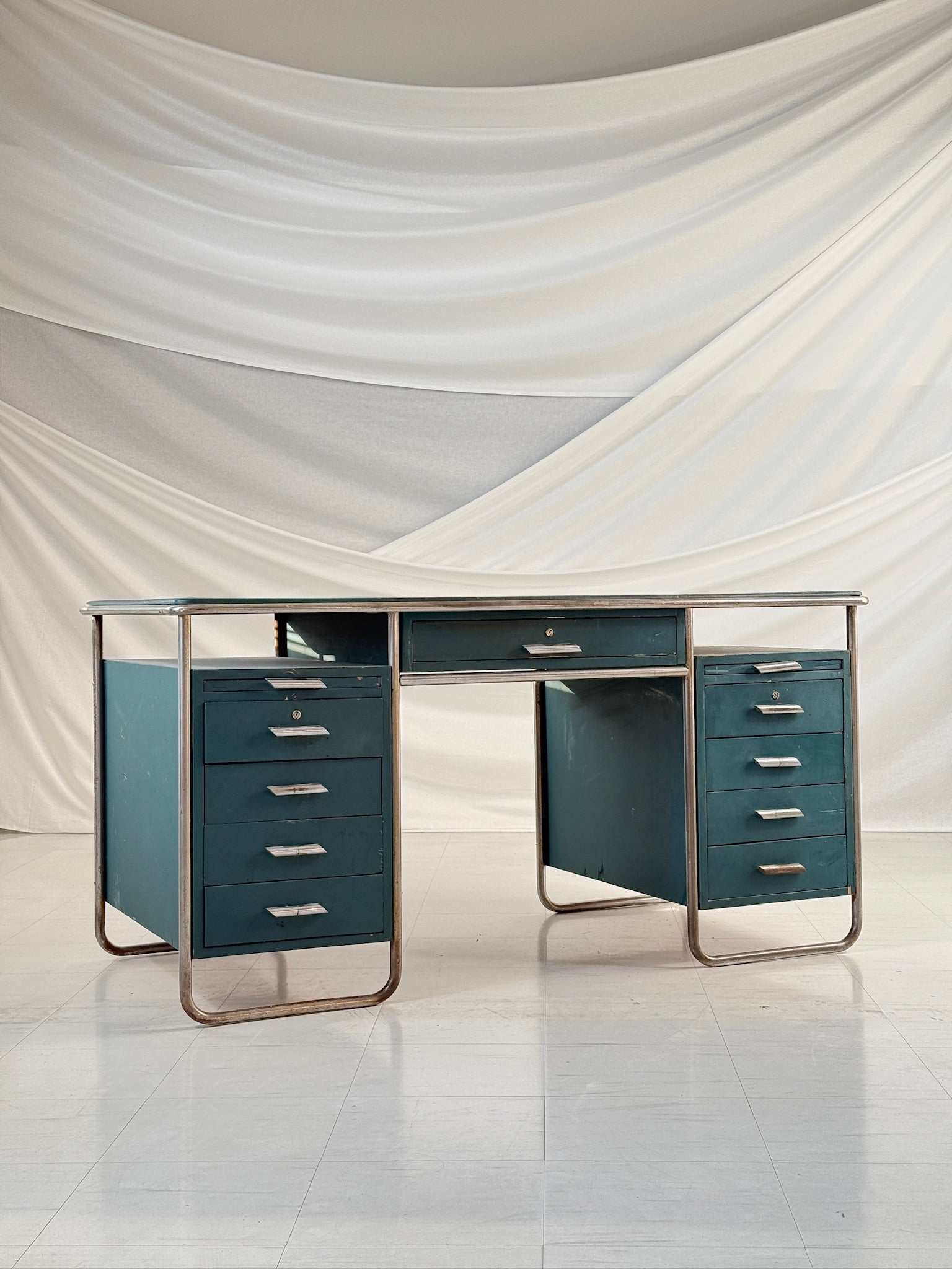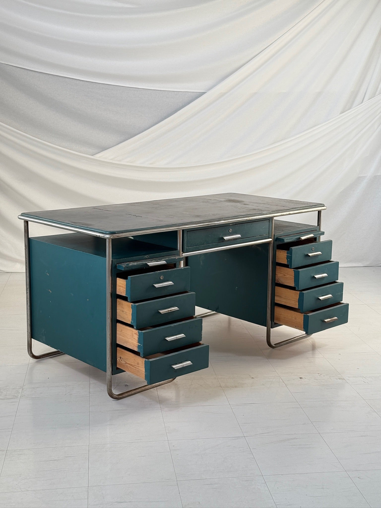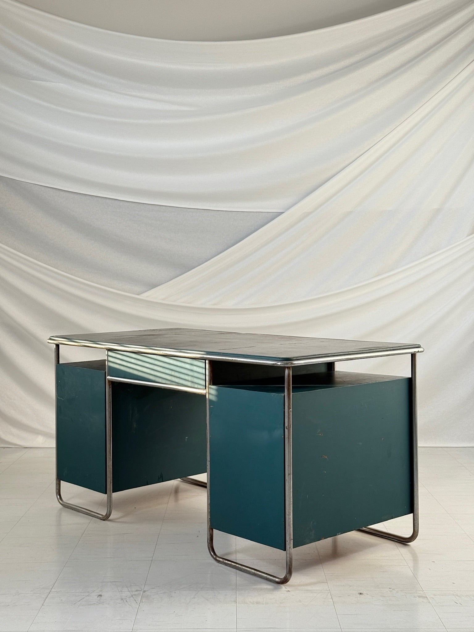 フィンランドの建築家パウリ・E・ブロムシュテットによって1930年代にデザインされた、流線型のライティングデスクは、初期モダニズムの機能主義的理念を反映しています。ミニマルなスチール製のチューブフレームが緑色に塗装された木製の天板を支え、洗練されたプロポーションと繊細なインダストリアルな美学を融合させています。
