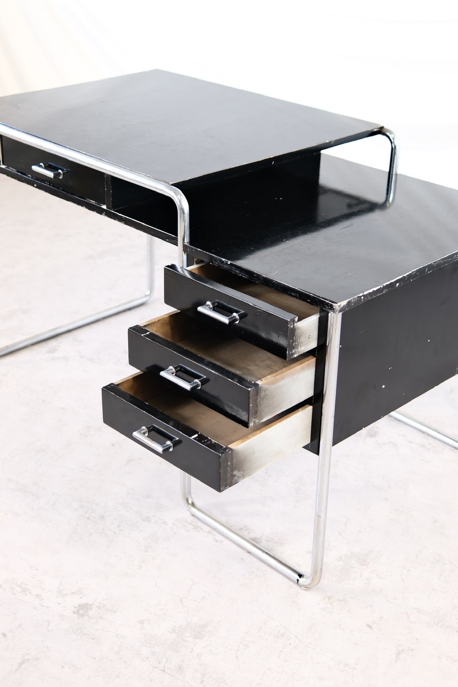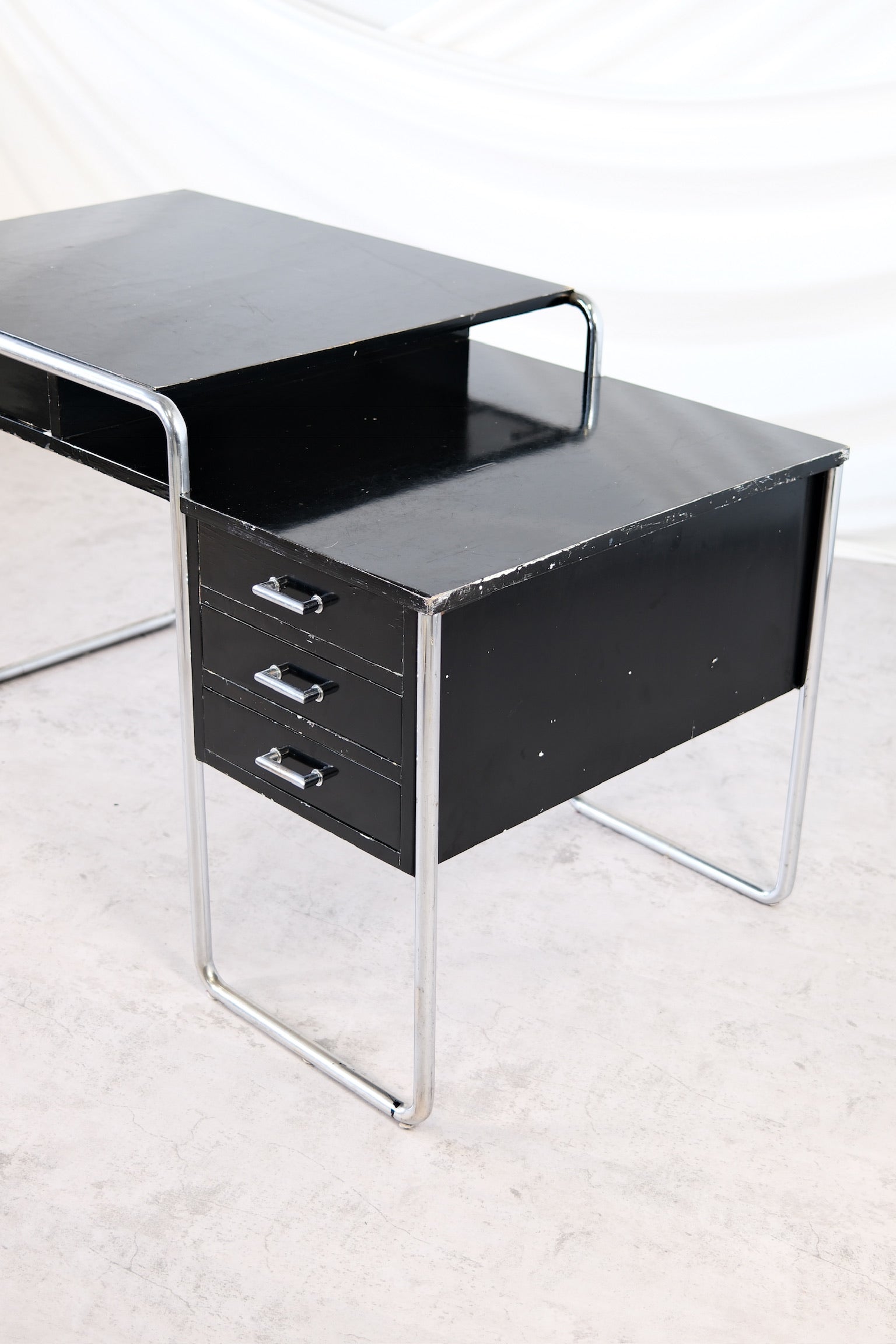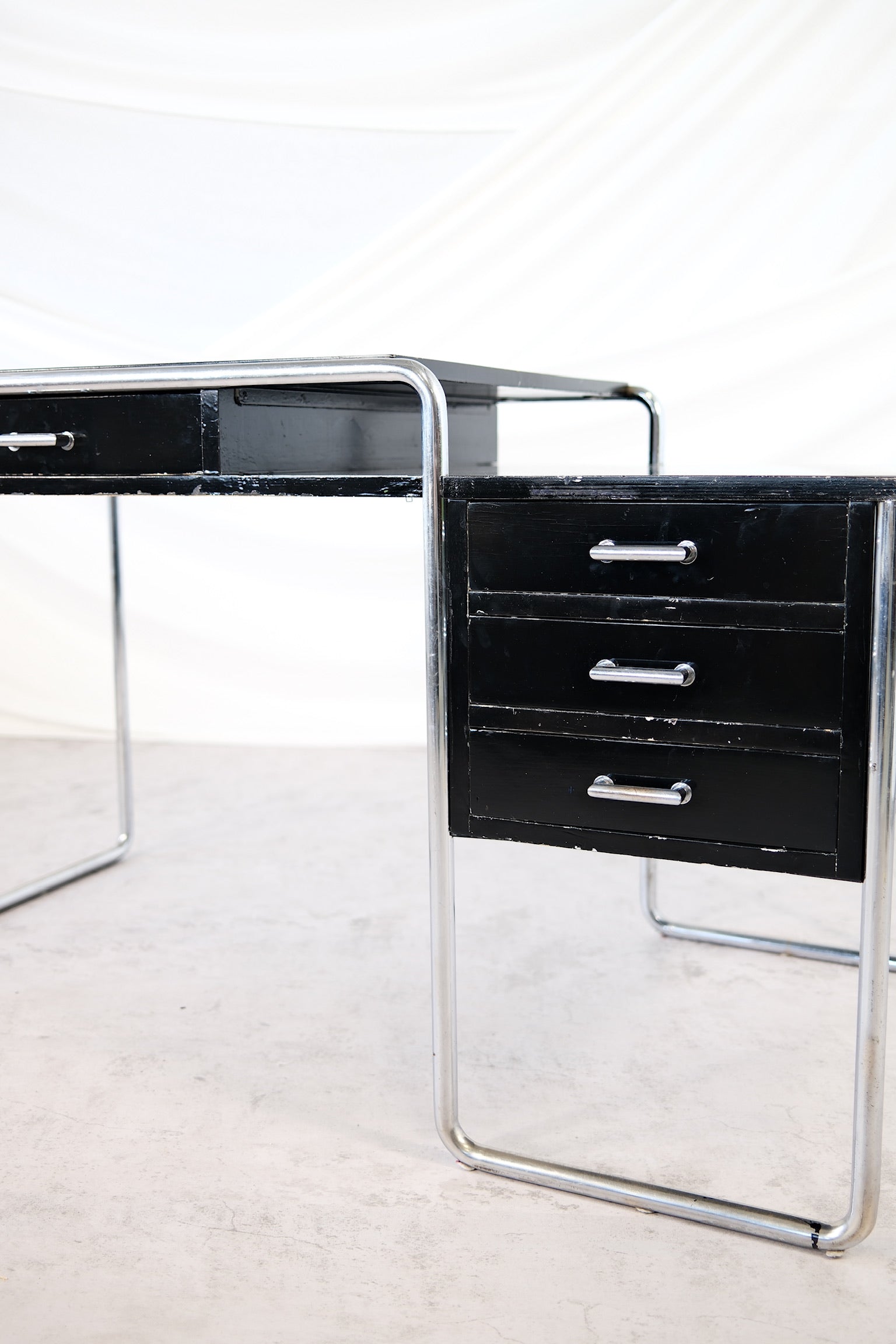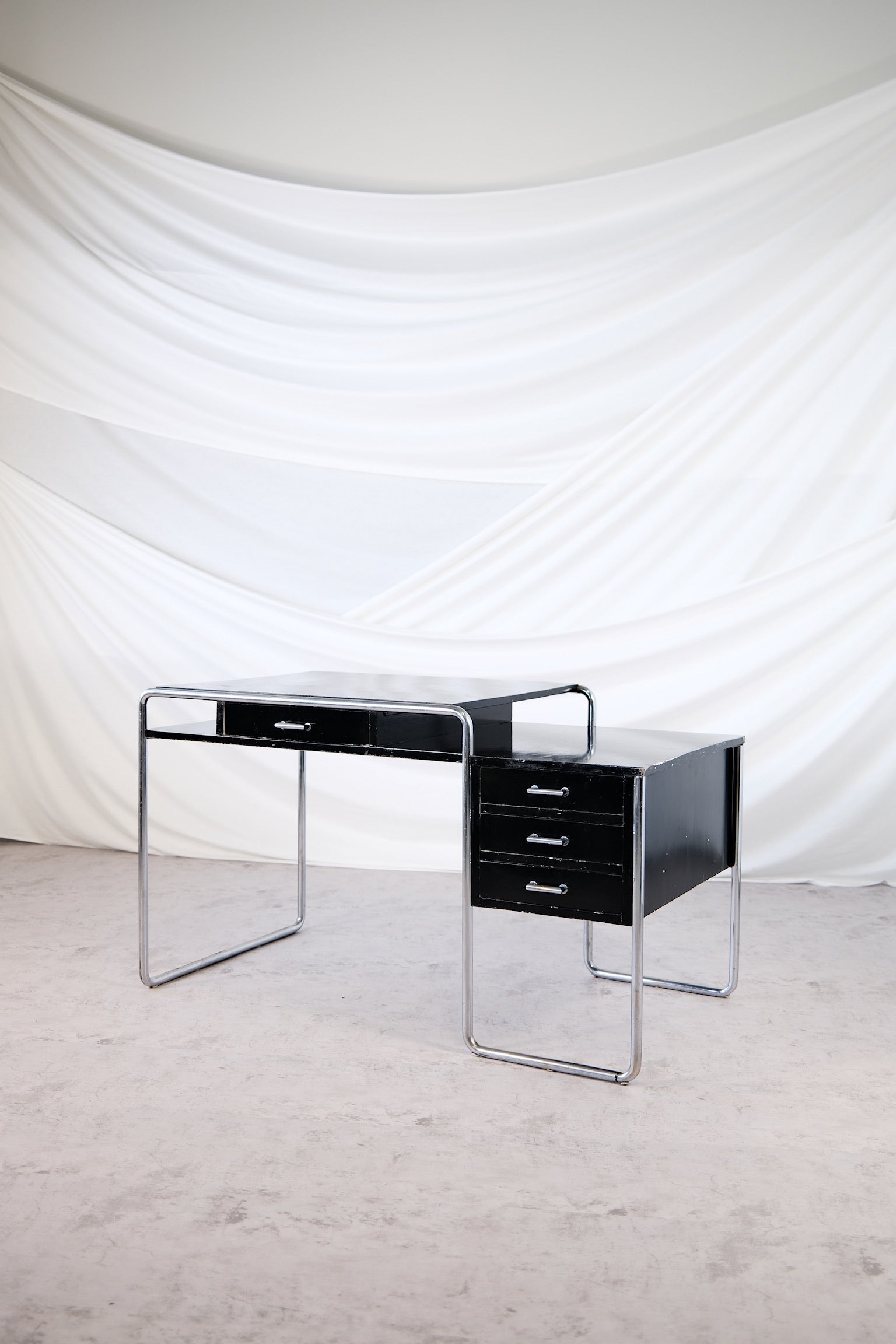 パウリ・ブロムシュテットが1930年代にデザインした希少なライティングテーブル。バウハウス様式のすっきりとしたラインに、黒ラッカー仕上げの本体とスチール管のフレームが調和し、片側には便利な引き出しが付いています。フィンランドの機能主義デザインを体現した真に優れた逸品であり、ほぼ1世紀前と変わらず、現代においてもモダンな印象を与えます。