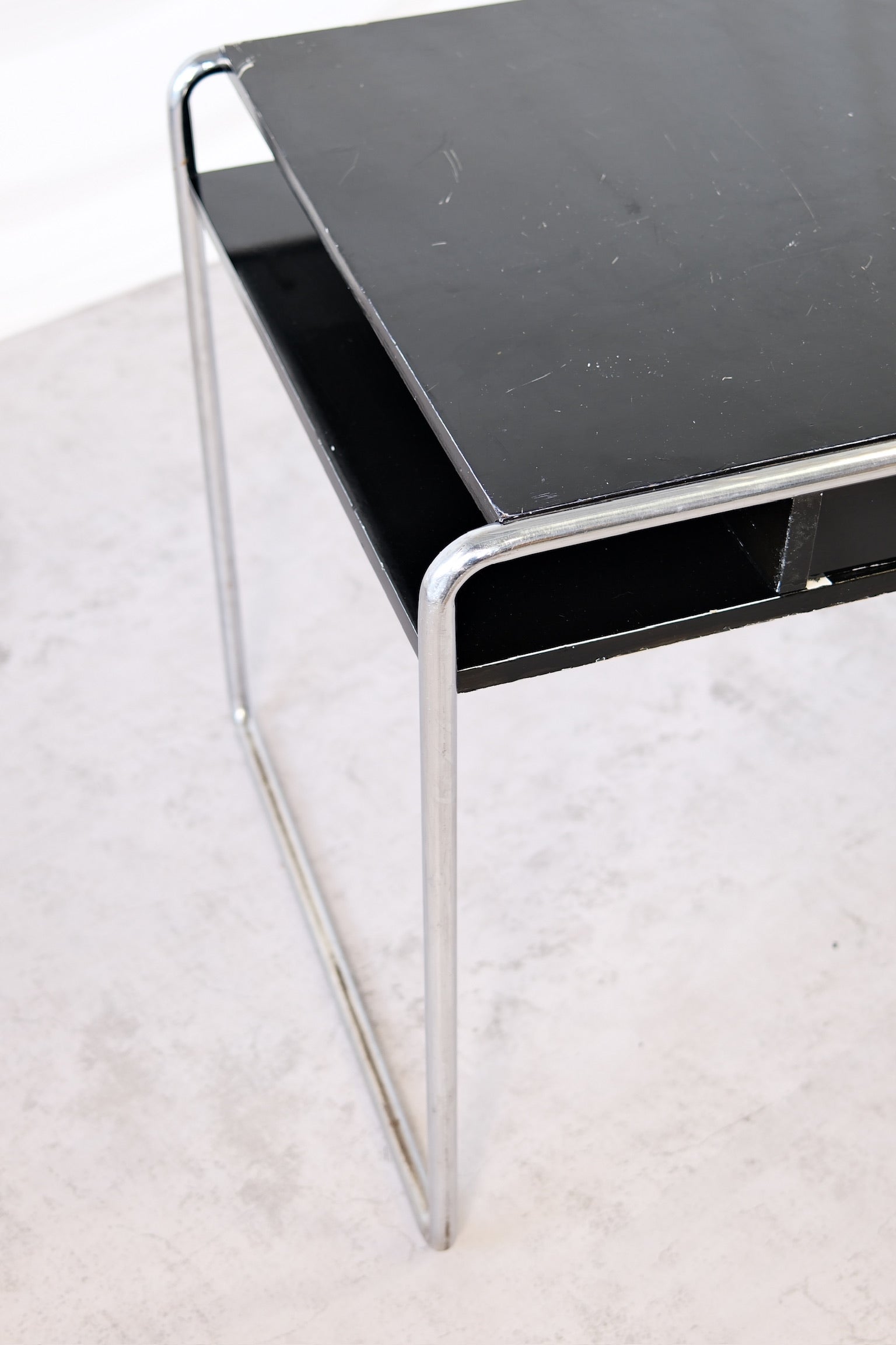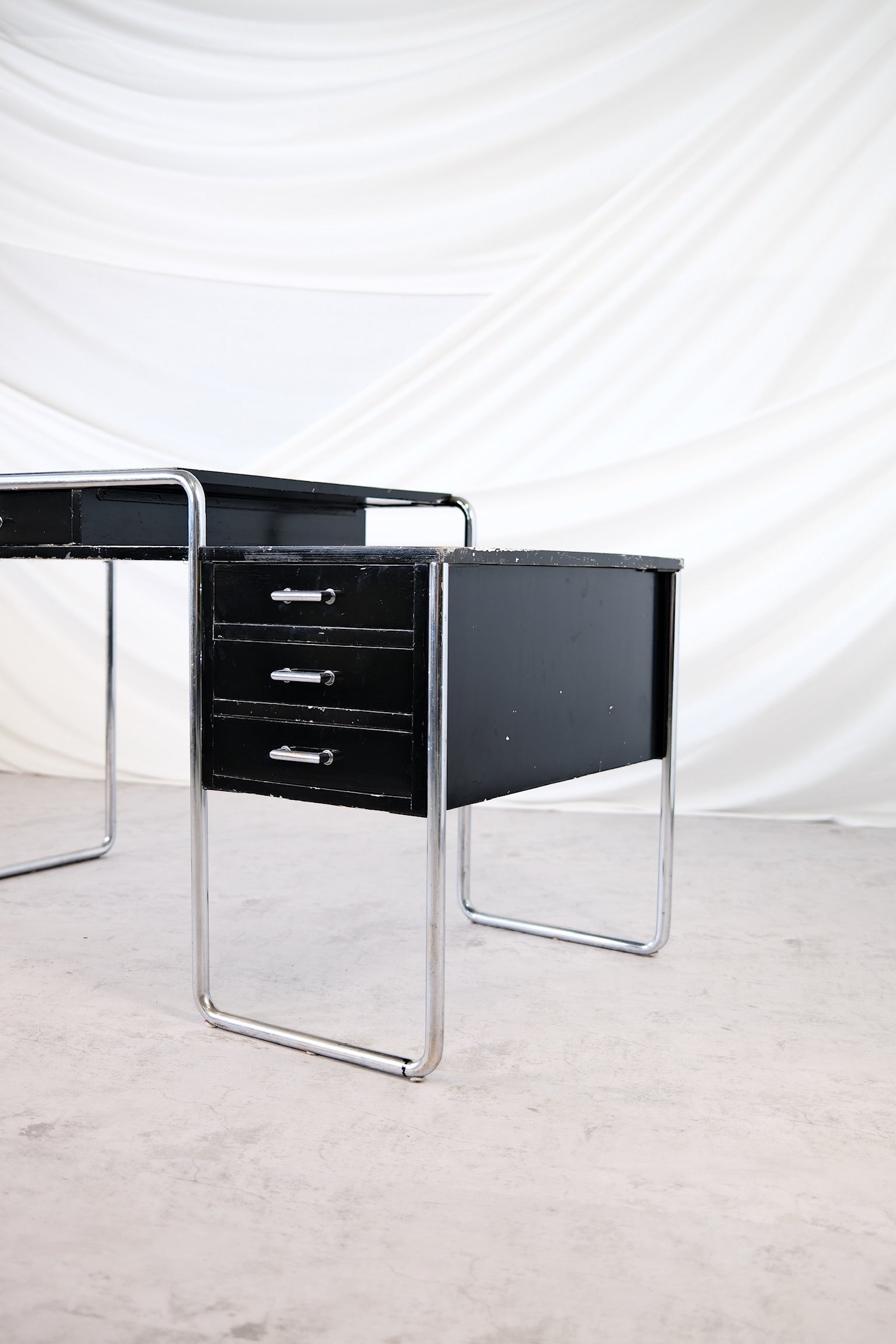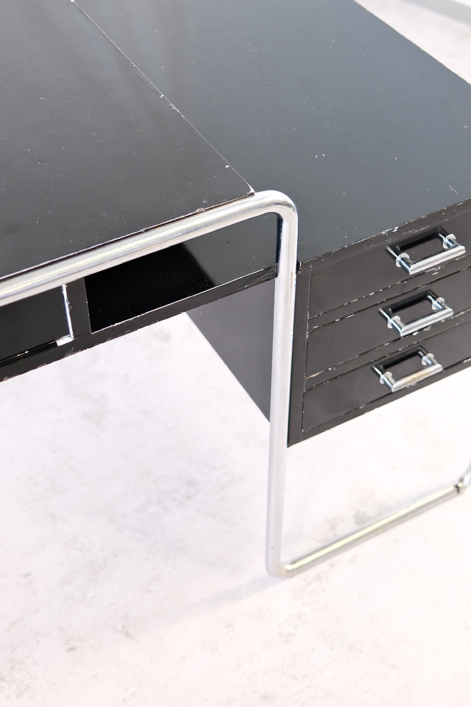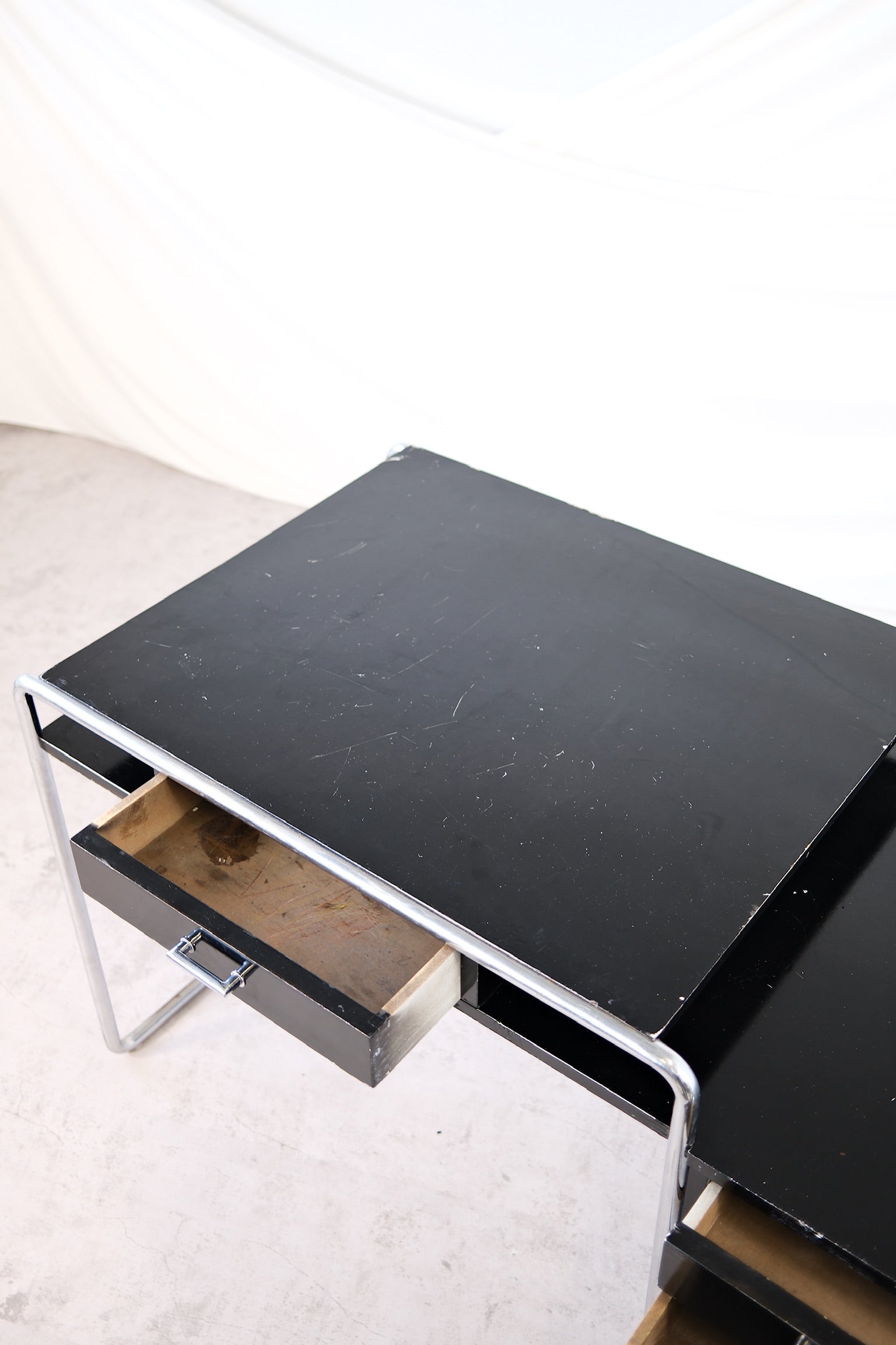 パウリ・ブロムシュテットが1930年代にデザインした希少なライティングテーブル。バウハウス様式のすっきりとしたラインに、黒ラッカー仕上げの本体とスチール管のフレームが調和し、片側には便利な引き出しが付いています。フィンランドの機能主義デザインを体現した真に優れた逸品であり、ほぼ1世紀前と変わらず、現代においてもモダンな印象を与えます。