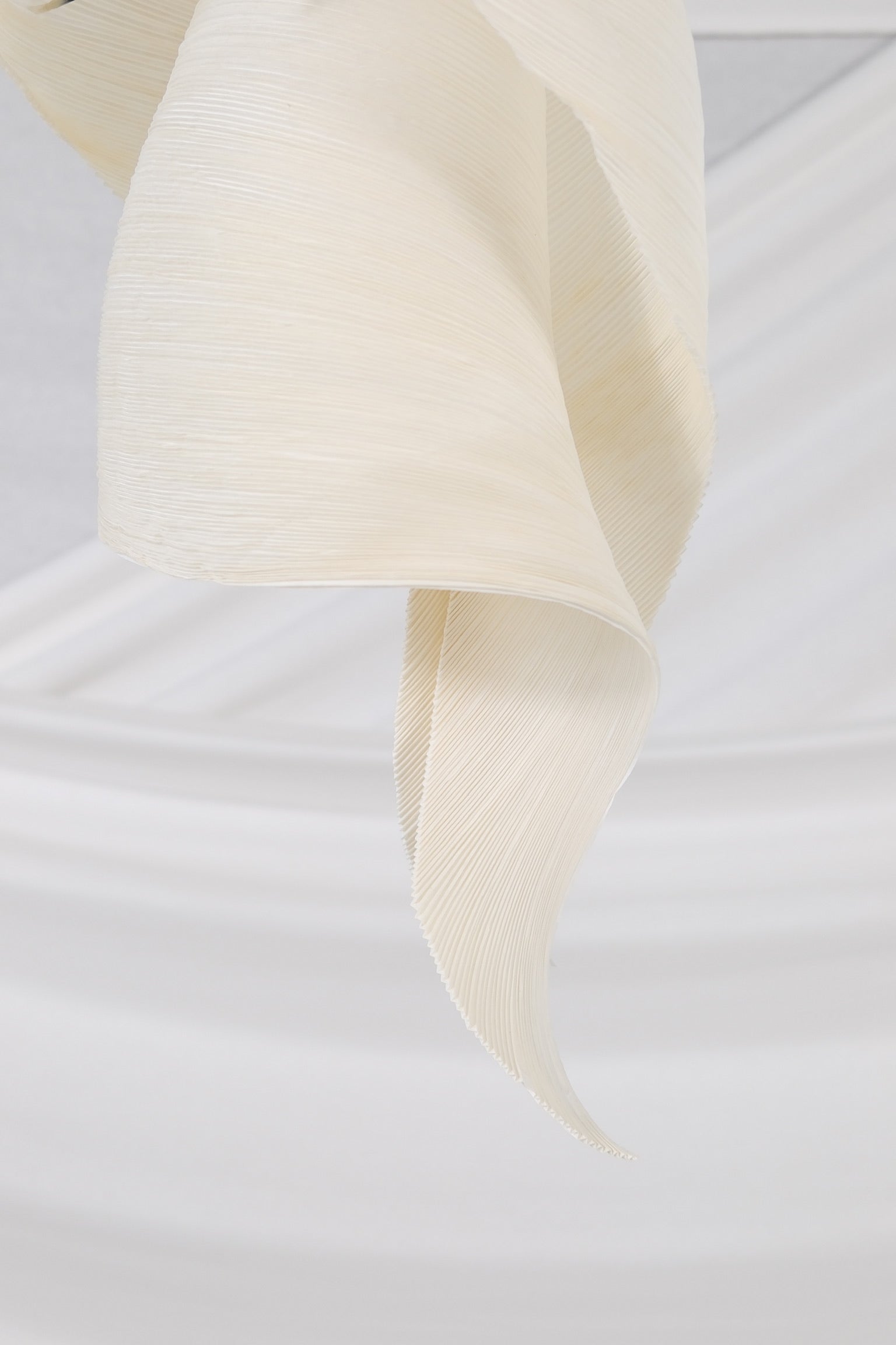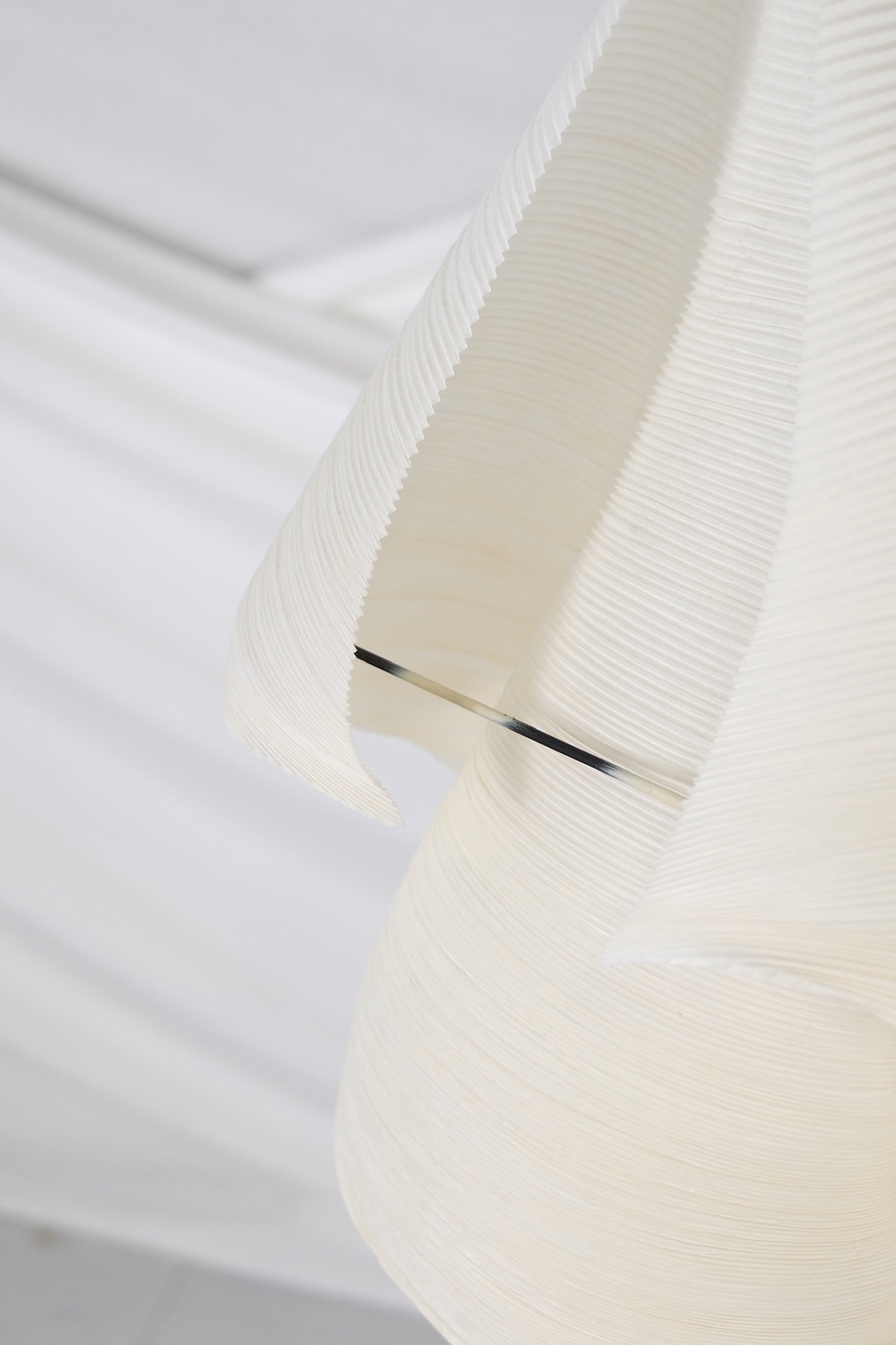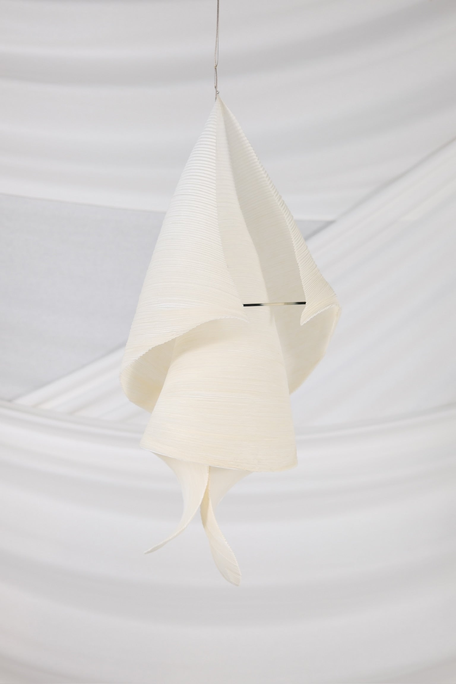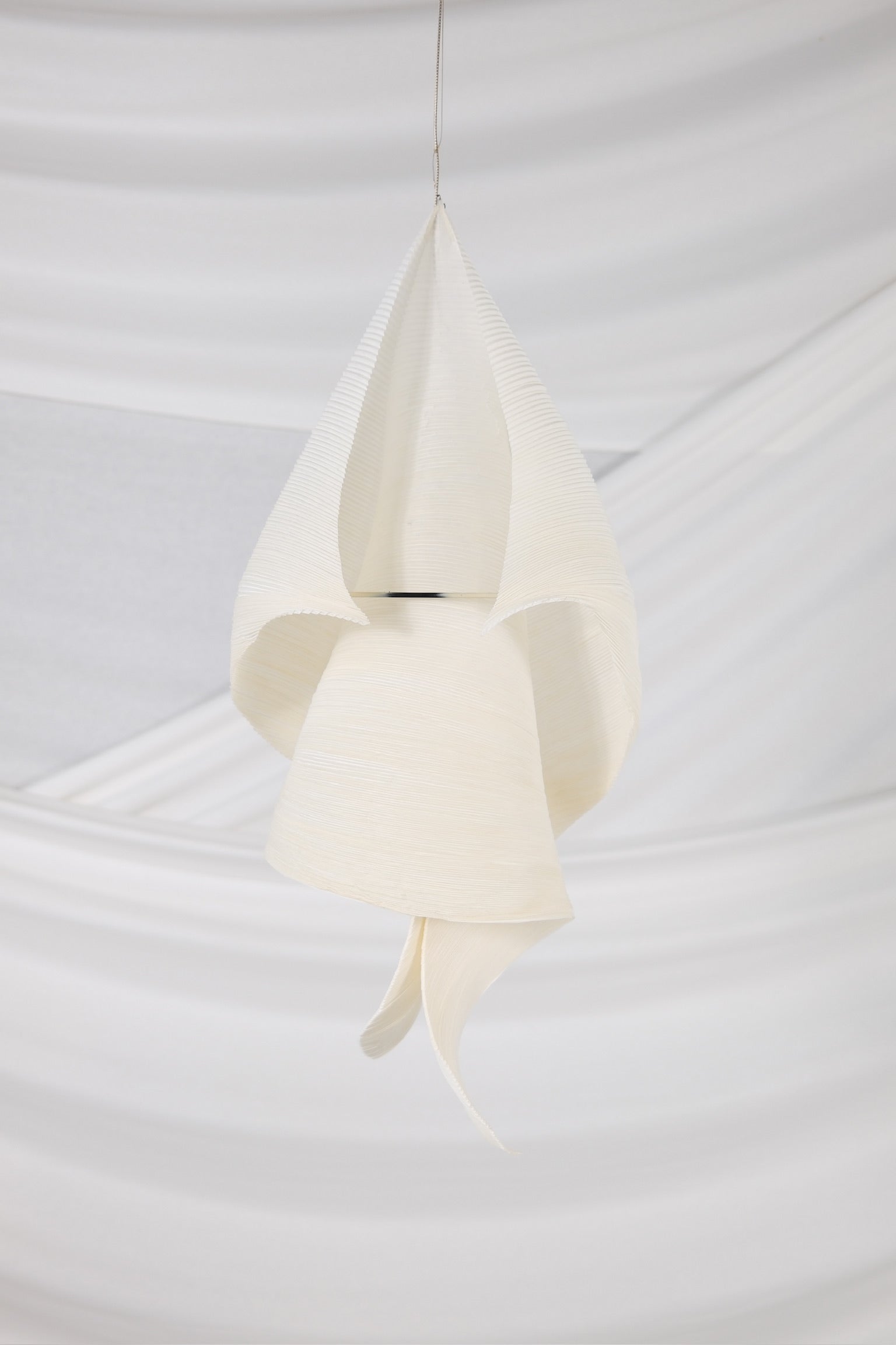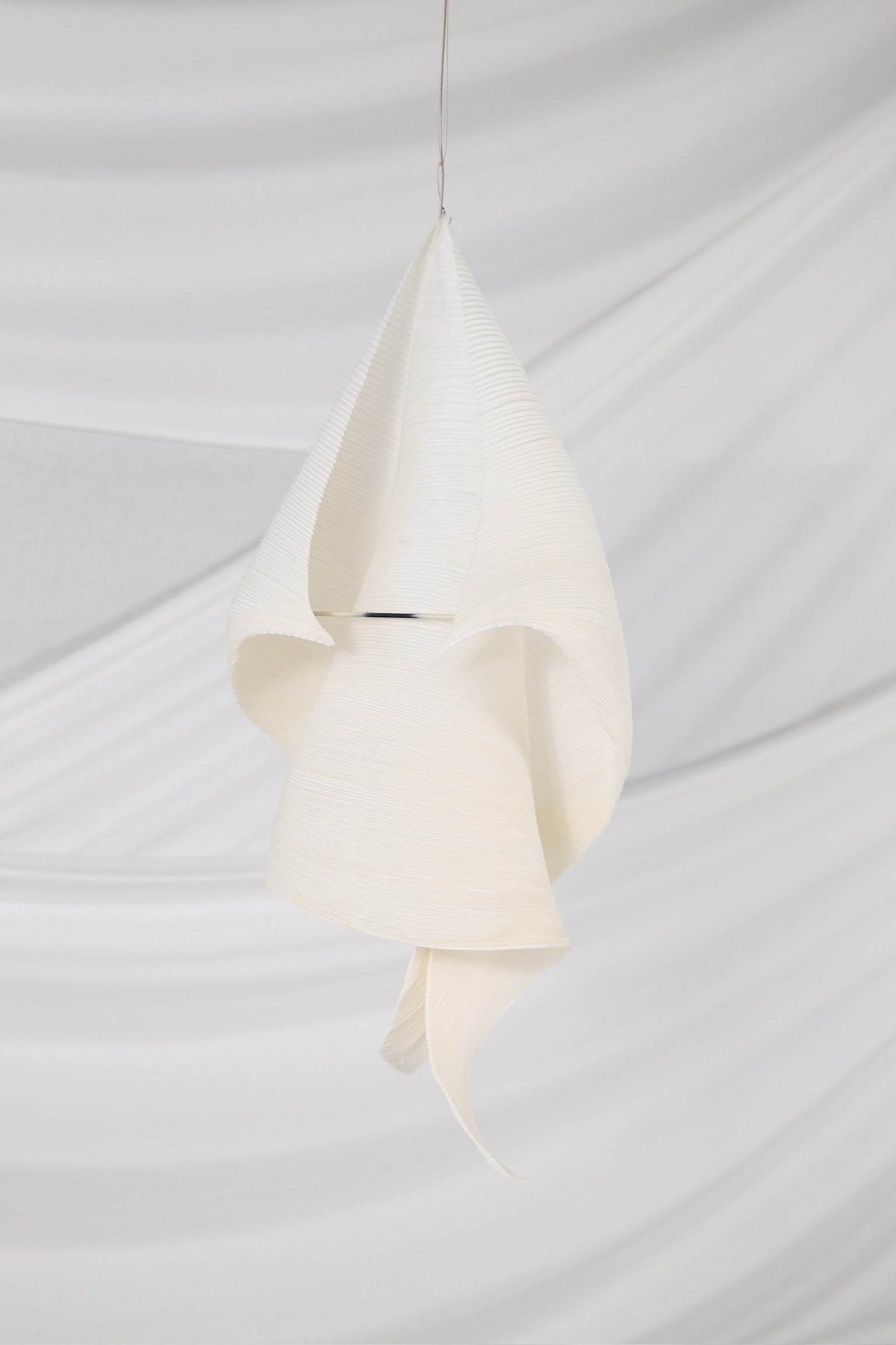 インゴ・マウラーが1998年にダグマー・モンバッハと共同でデザインした、詩情あふれる希少なペンダントライト。アイコニックなMaMo Nouchiesコレクションの一部です。一つひとつの作品は、丁寧にプリーツ加工された和紙を、折り曲げたり伸ばしたりする複数の工程を経て、有機的で彫刻的なフォルムへと昇華させ、すべて手作業で作られています。